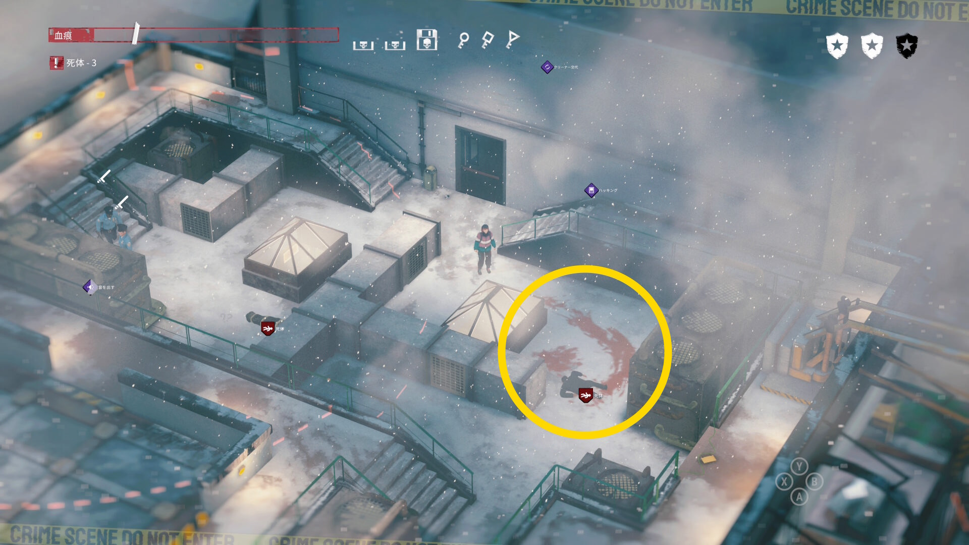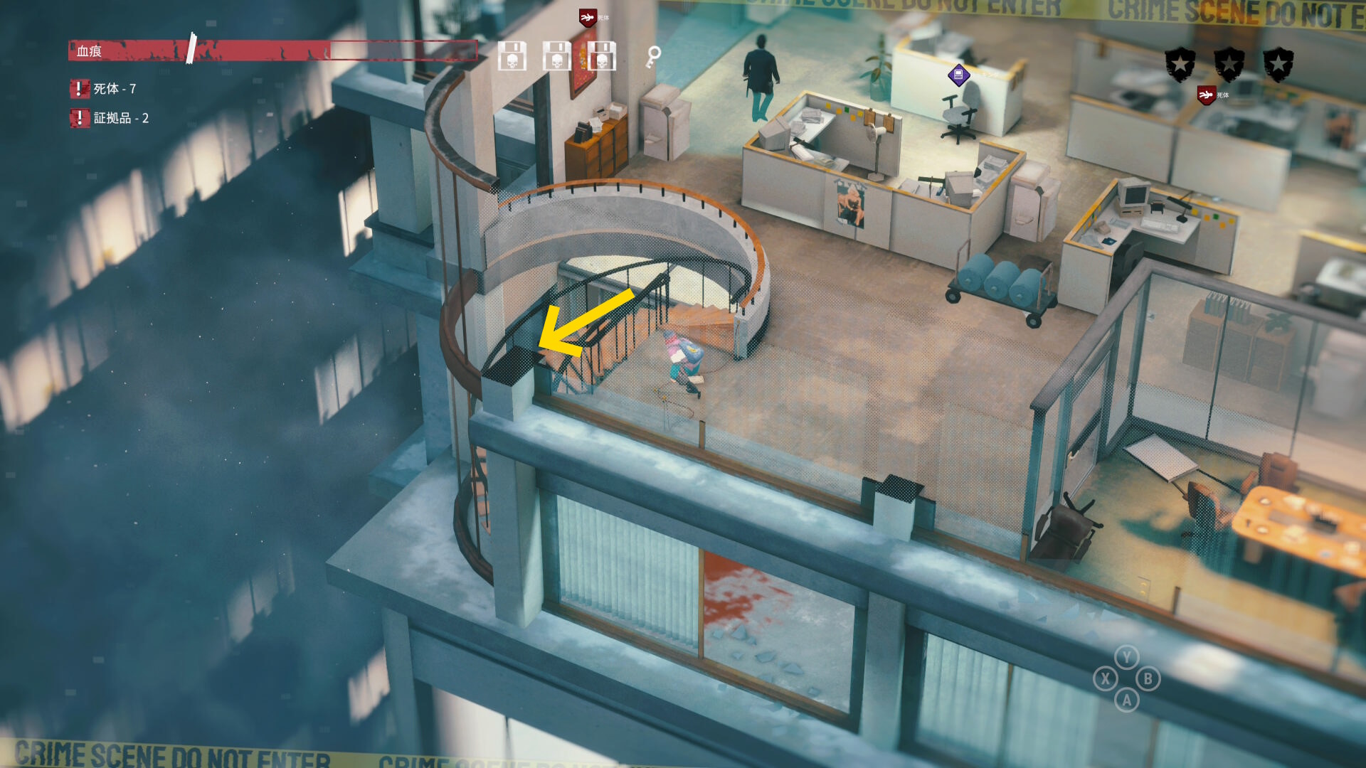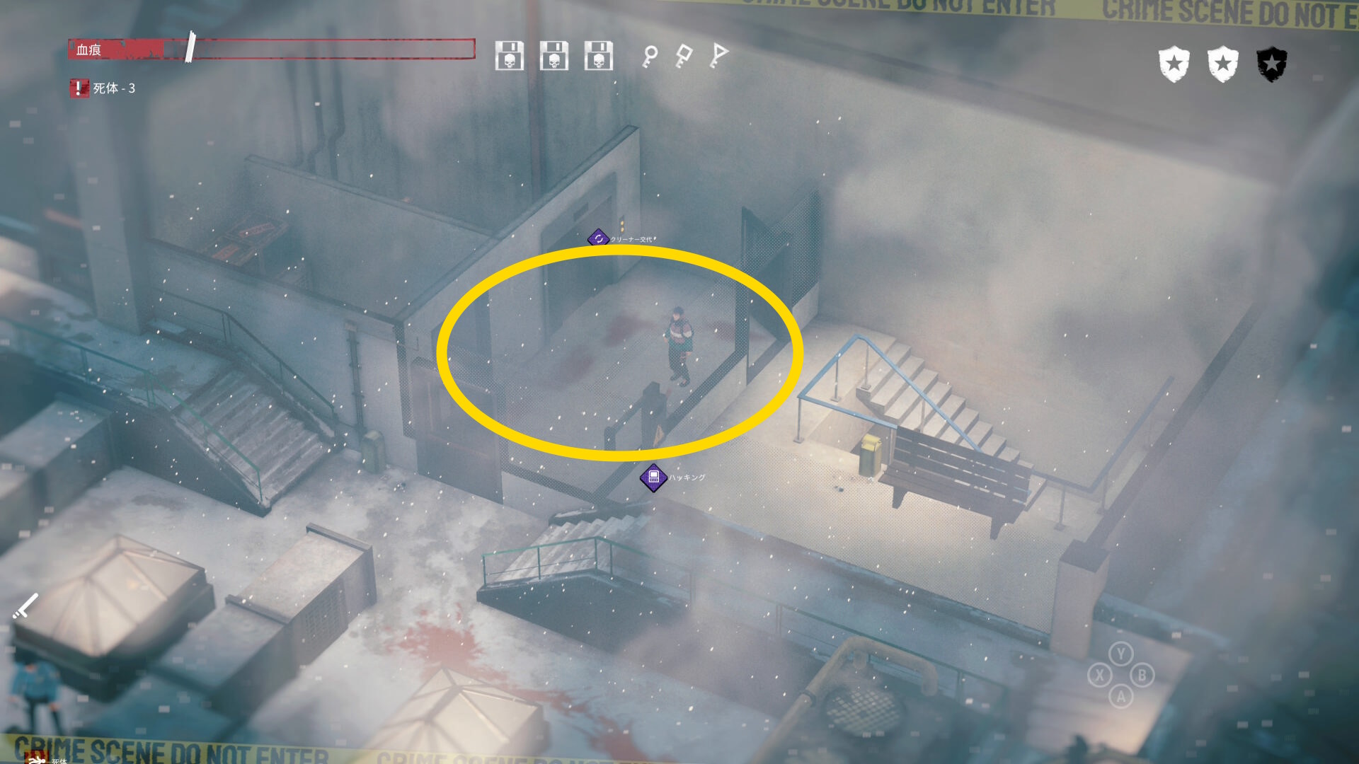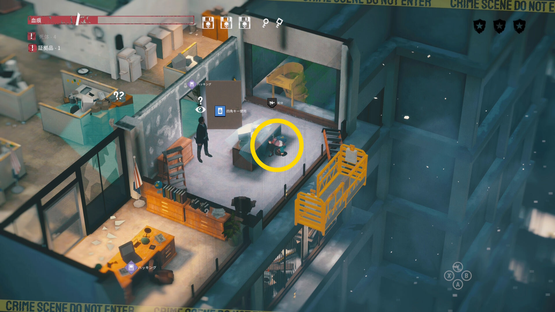 - エリア左側には 6体目の死体 と血痕、証拠品 がある
