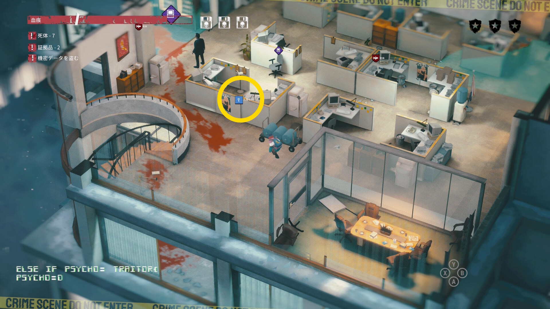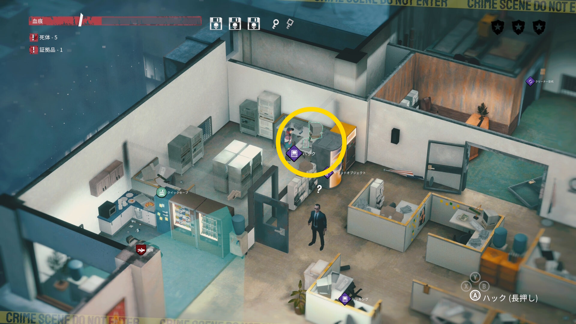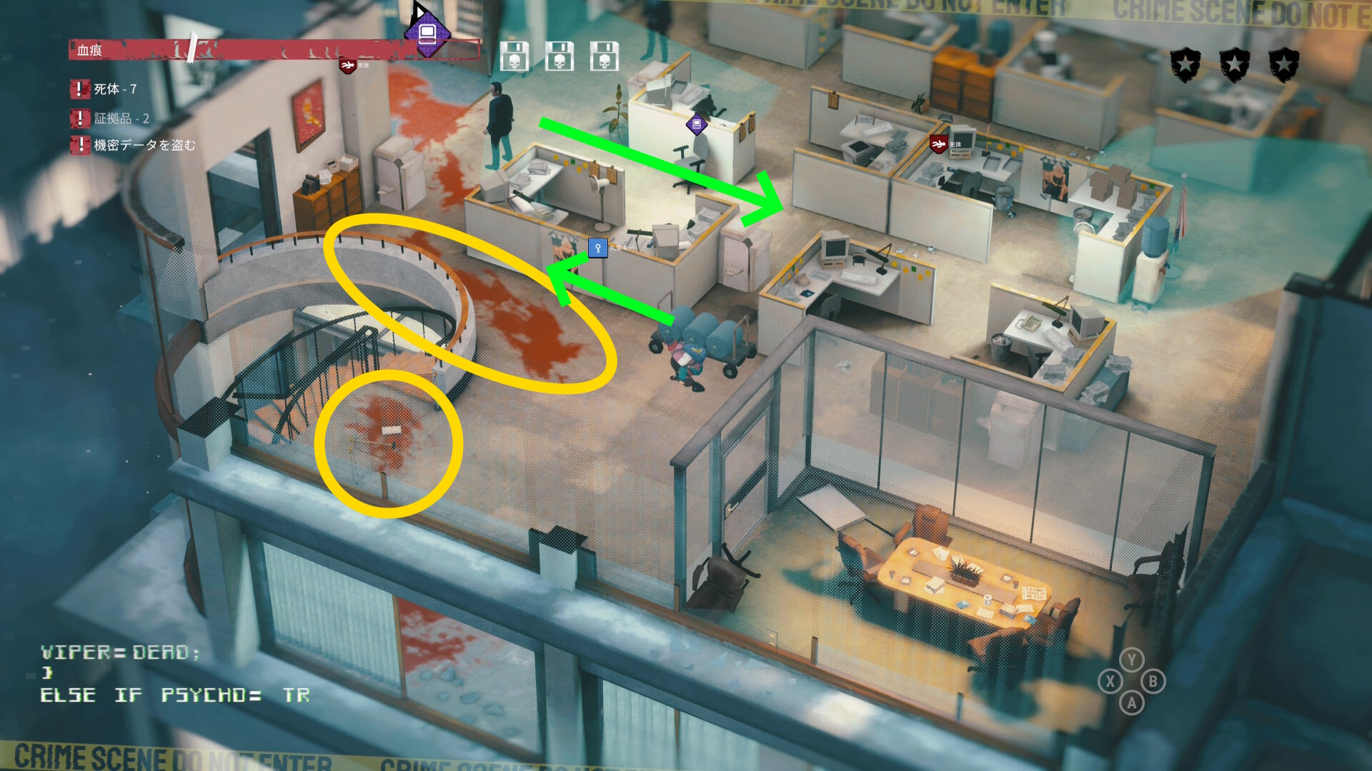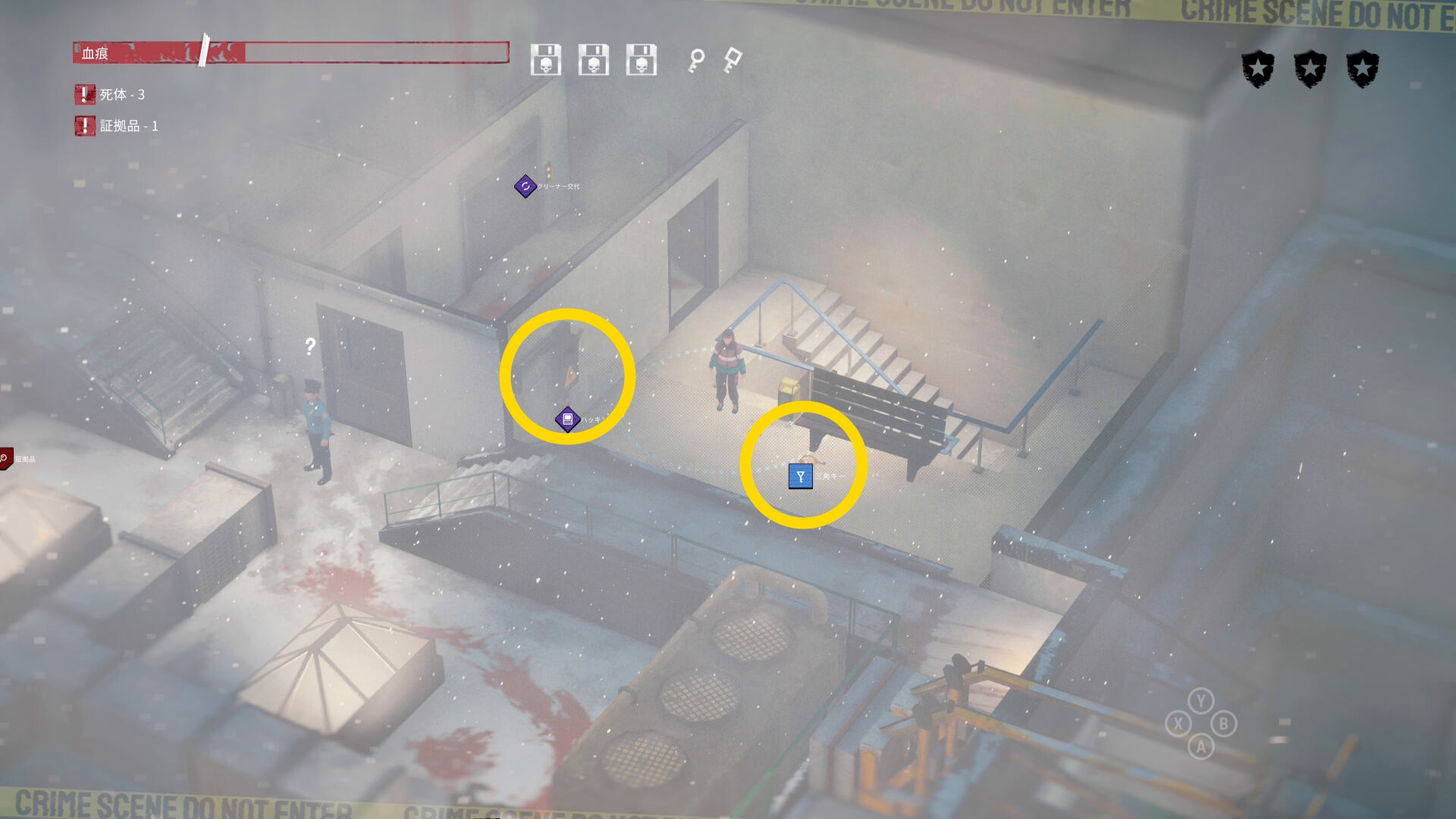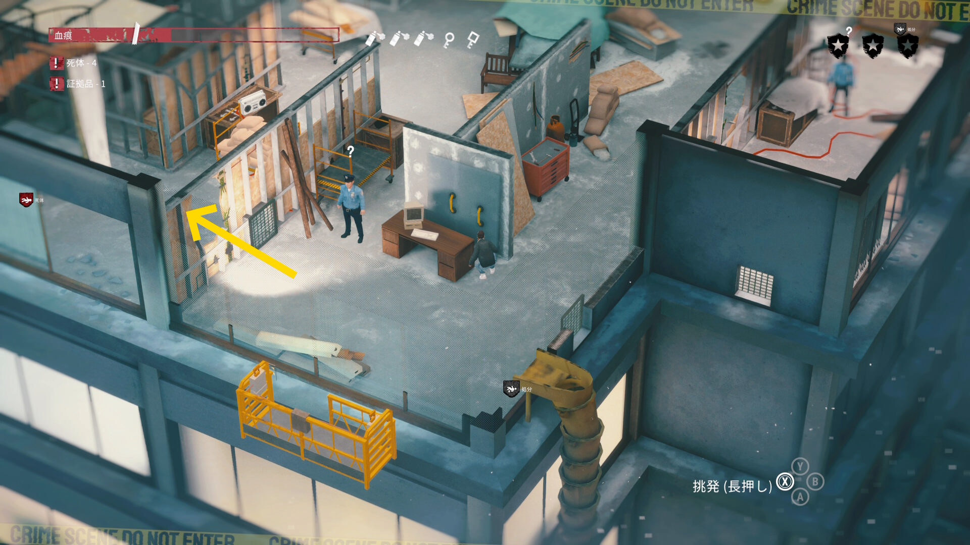 - エリア左側には 6体目の死体 と血痕、証拠品 がある