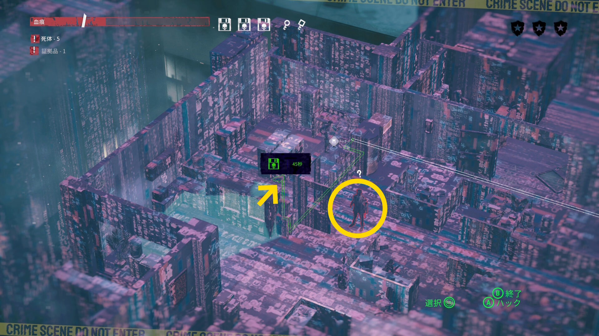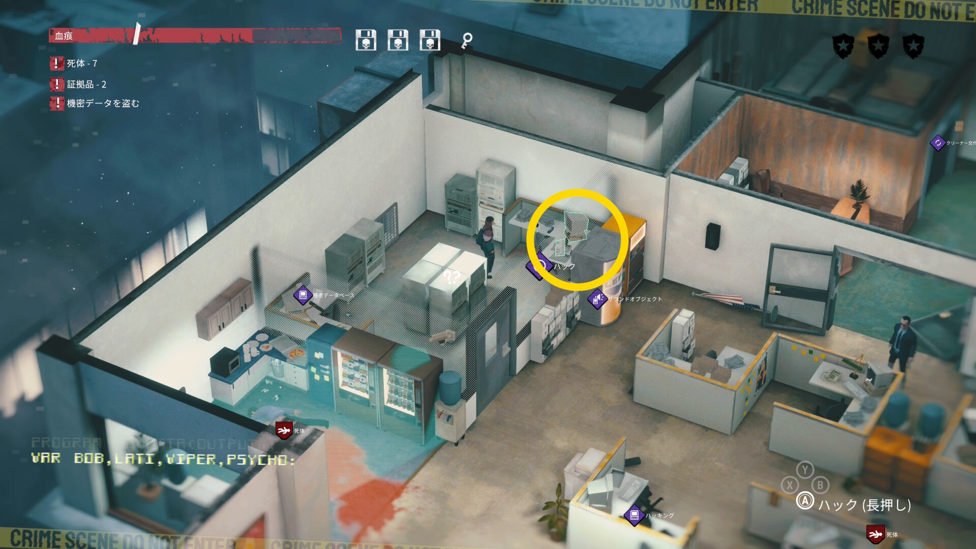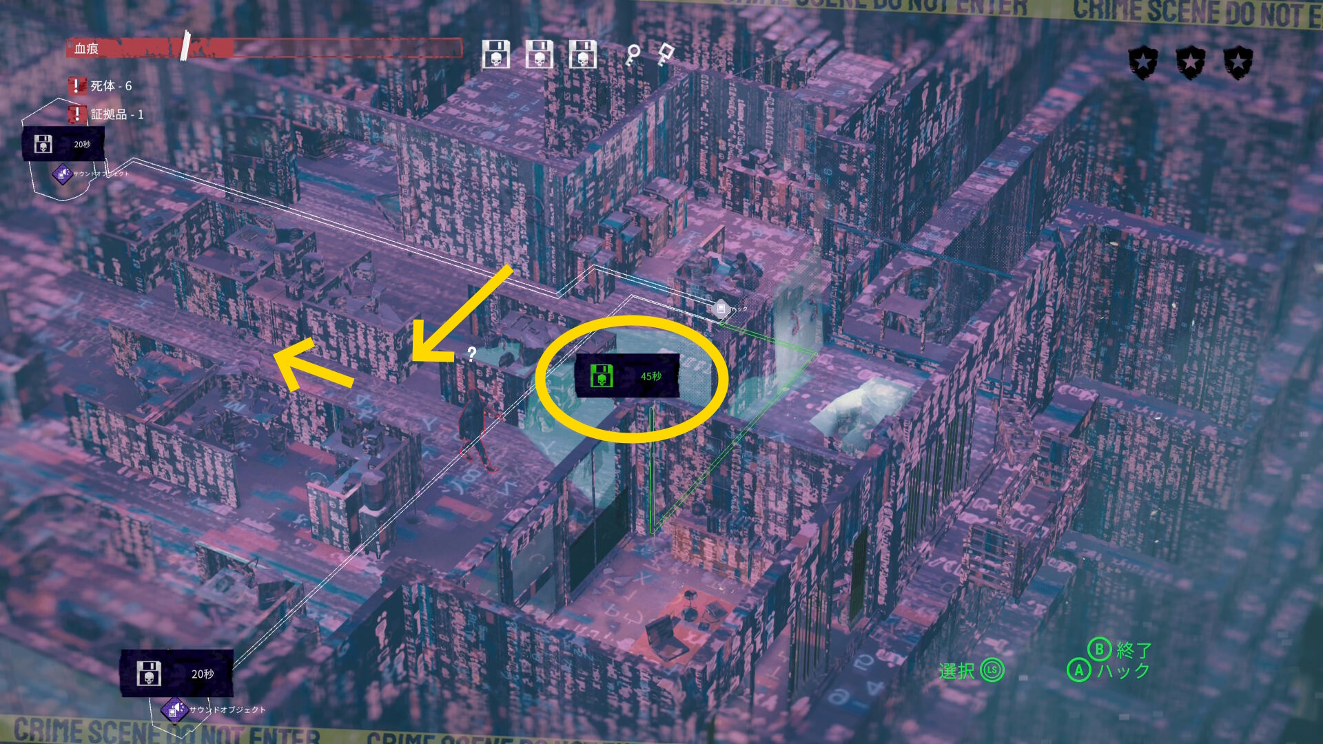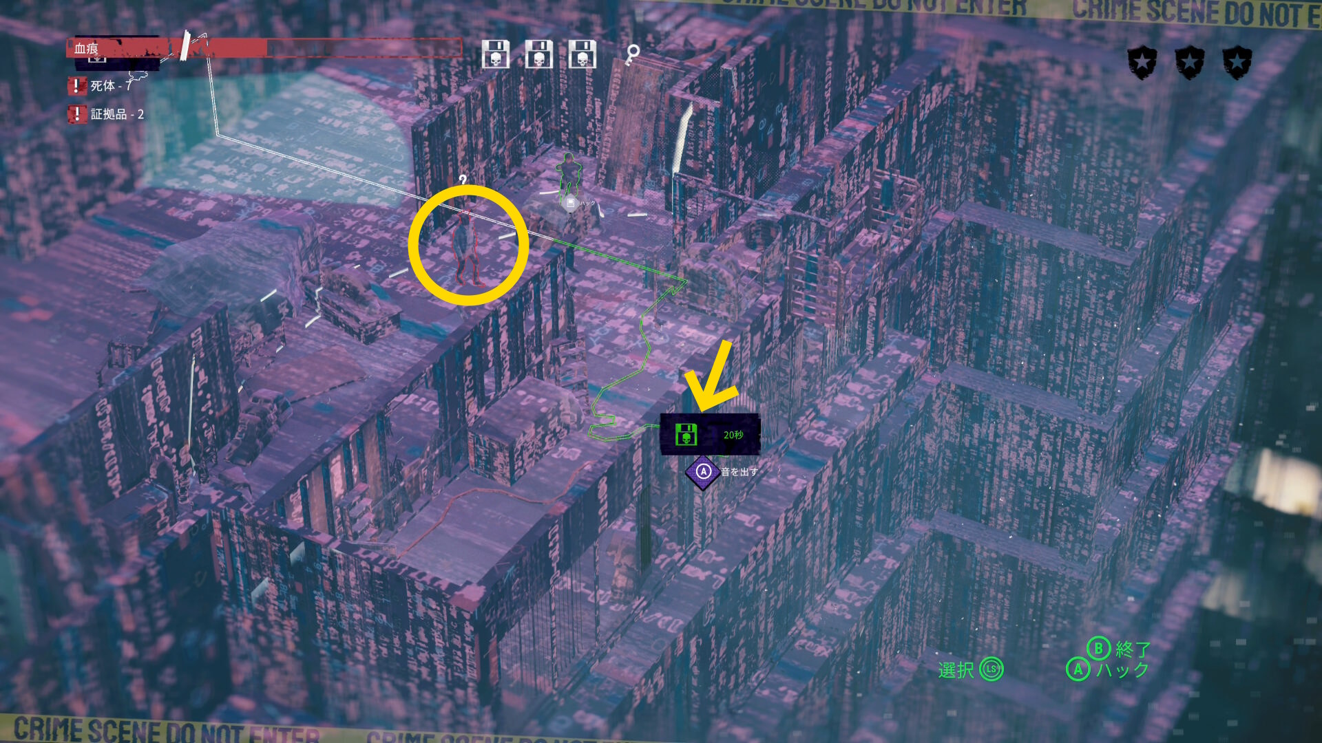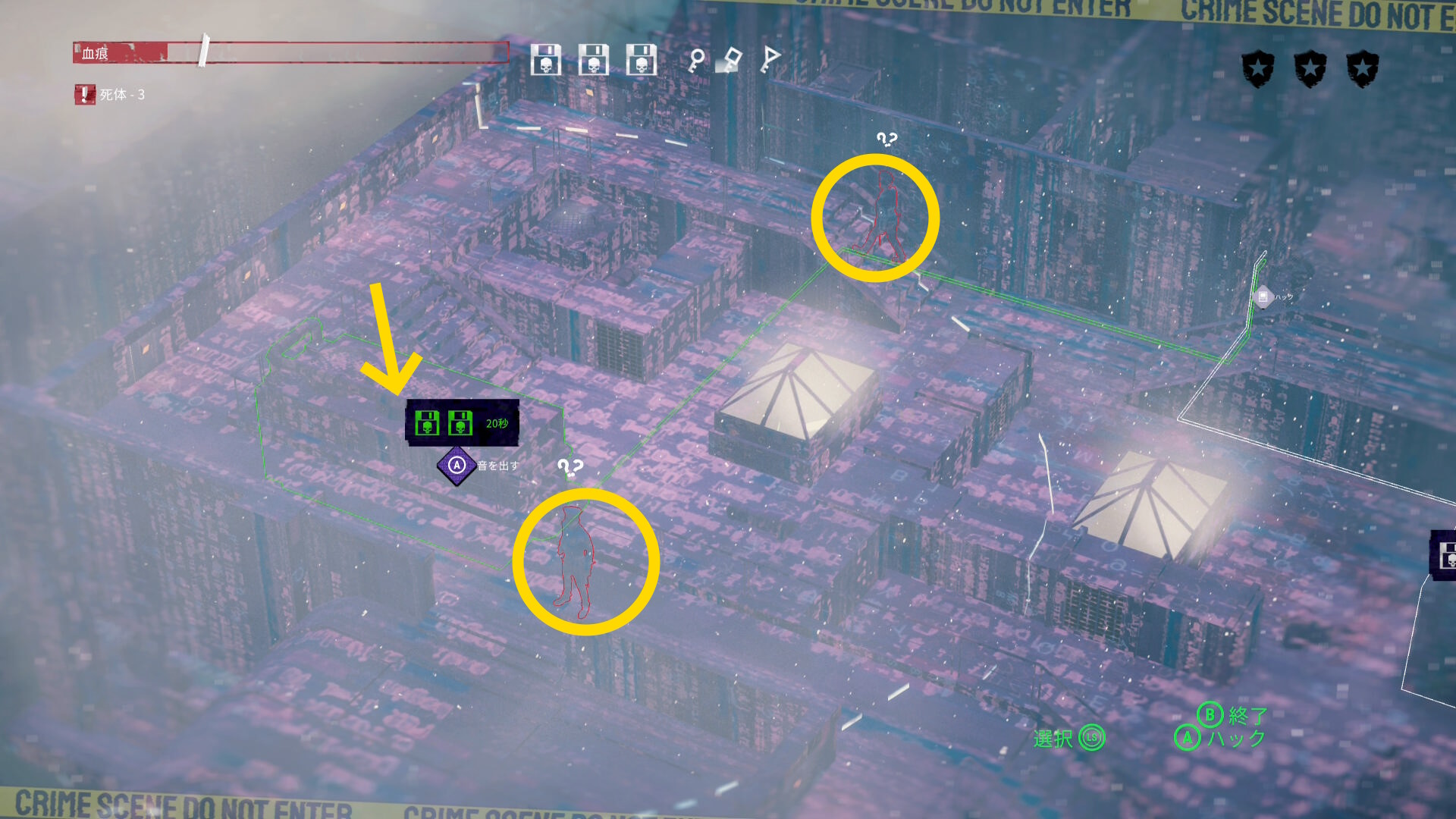 - マップ右側の大きな室外機から音を出すが、範囲内に2人の警察官が入ったことを確認してからハッキングすること(特に下の警察官が範囲内に入ったかどうか確認する)