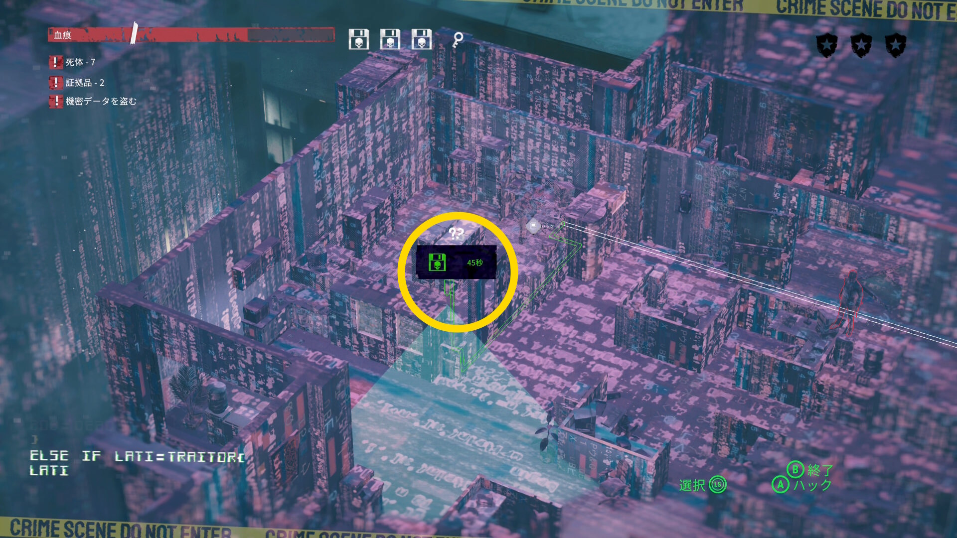 - ハッキングするが、上の捜査員が部屋前(下画像のところ)に来たら監視カメラを停止させるとよいでしょう
