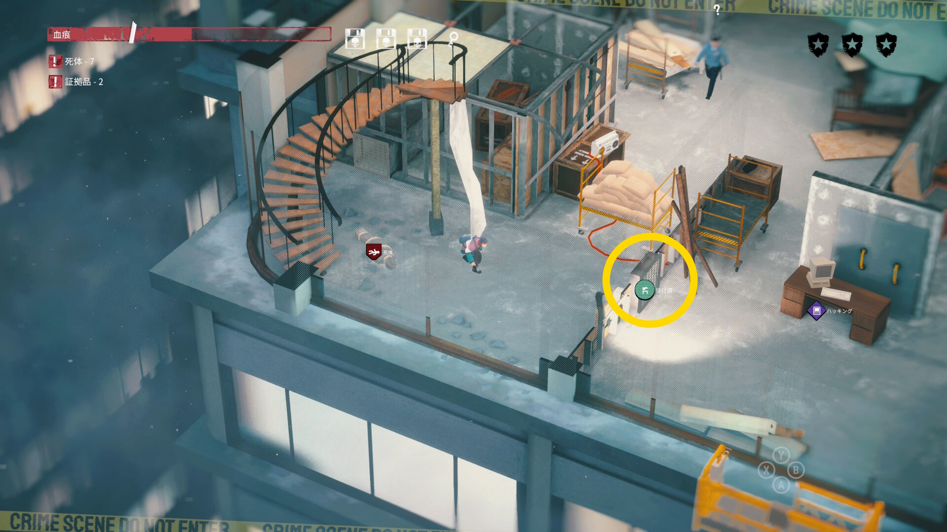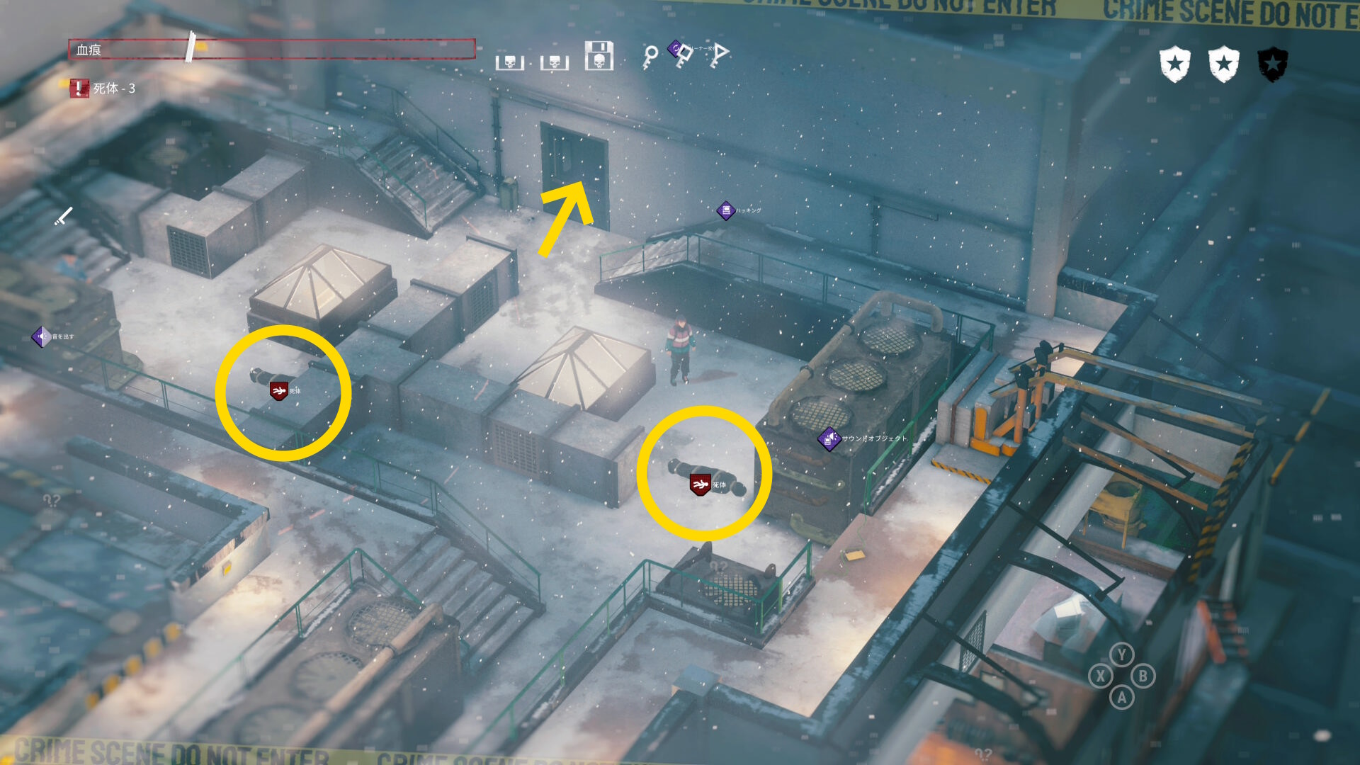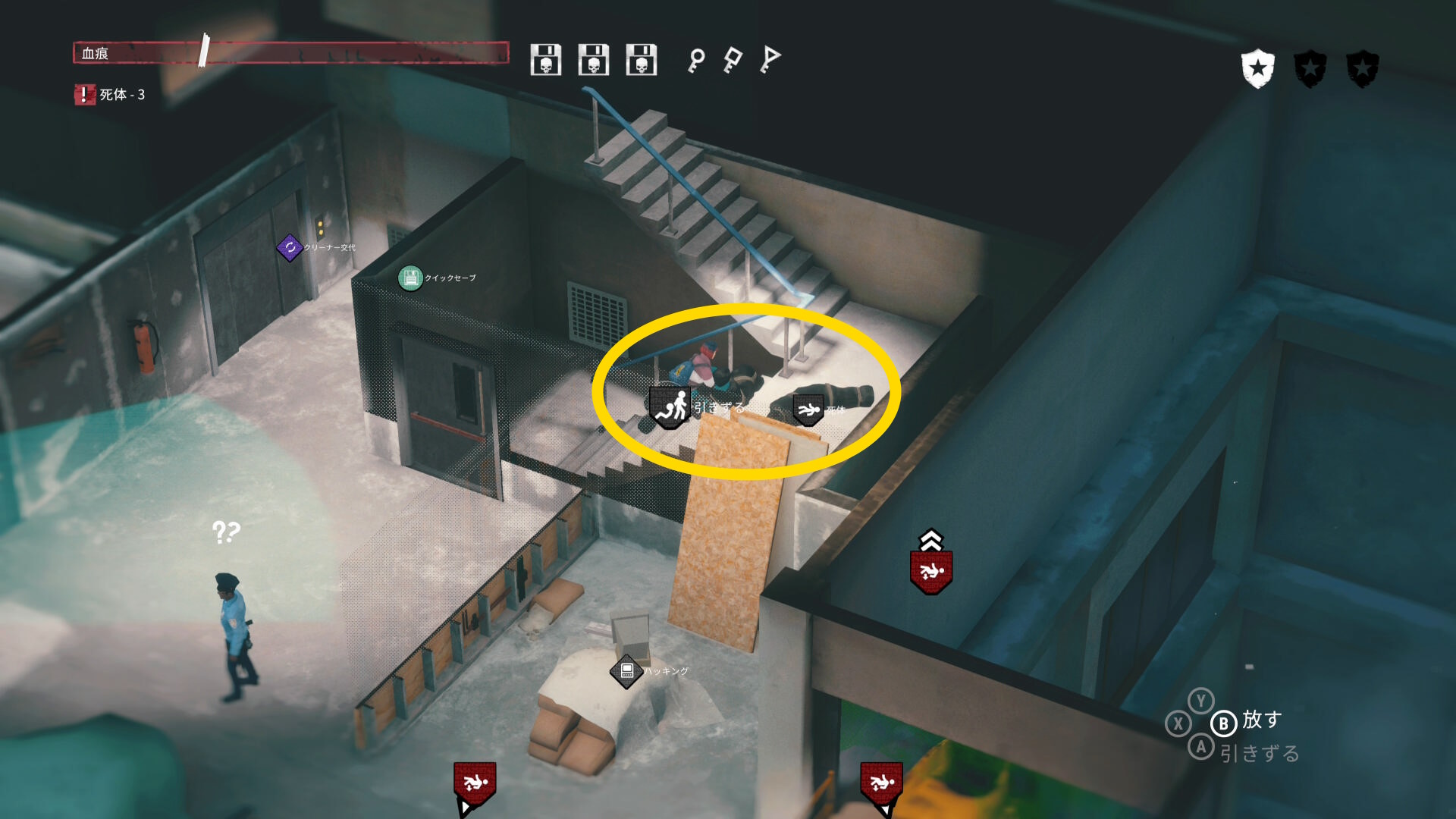 - もう一度左右の室外機をそれぞれハッキングして、死体を右上の階段に運ぶ