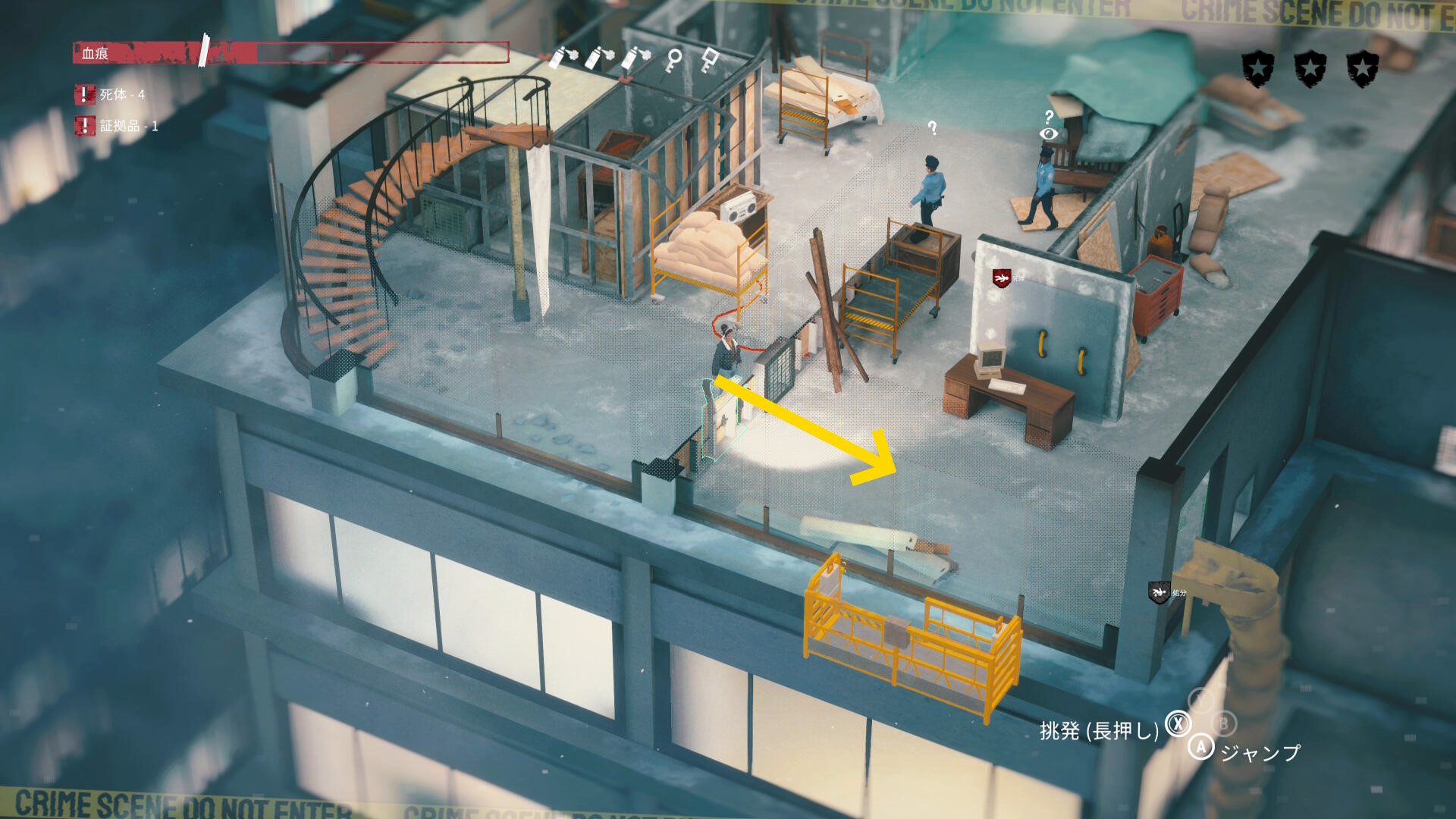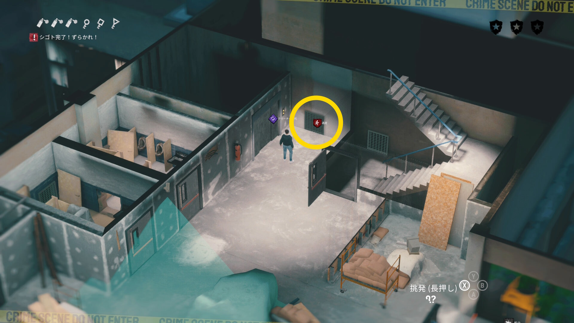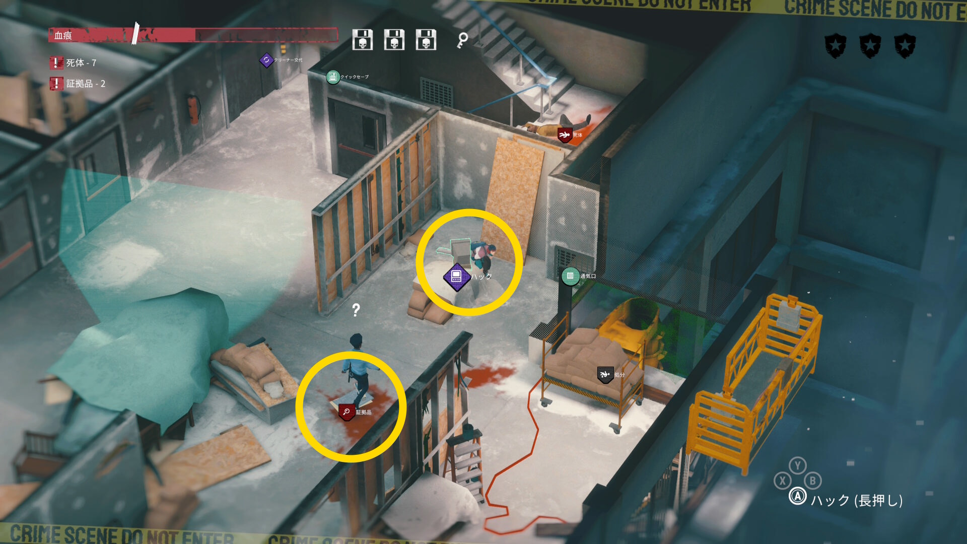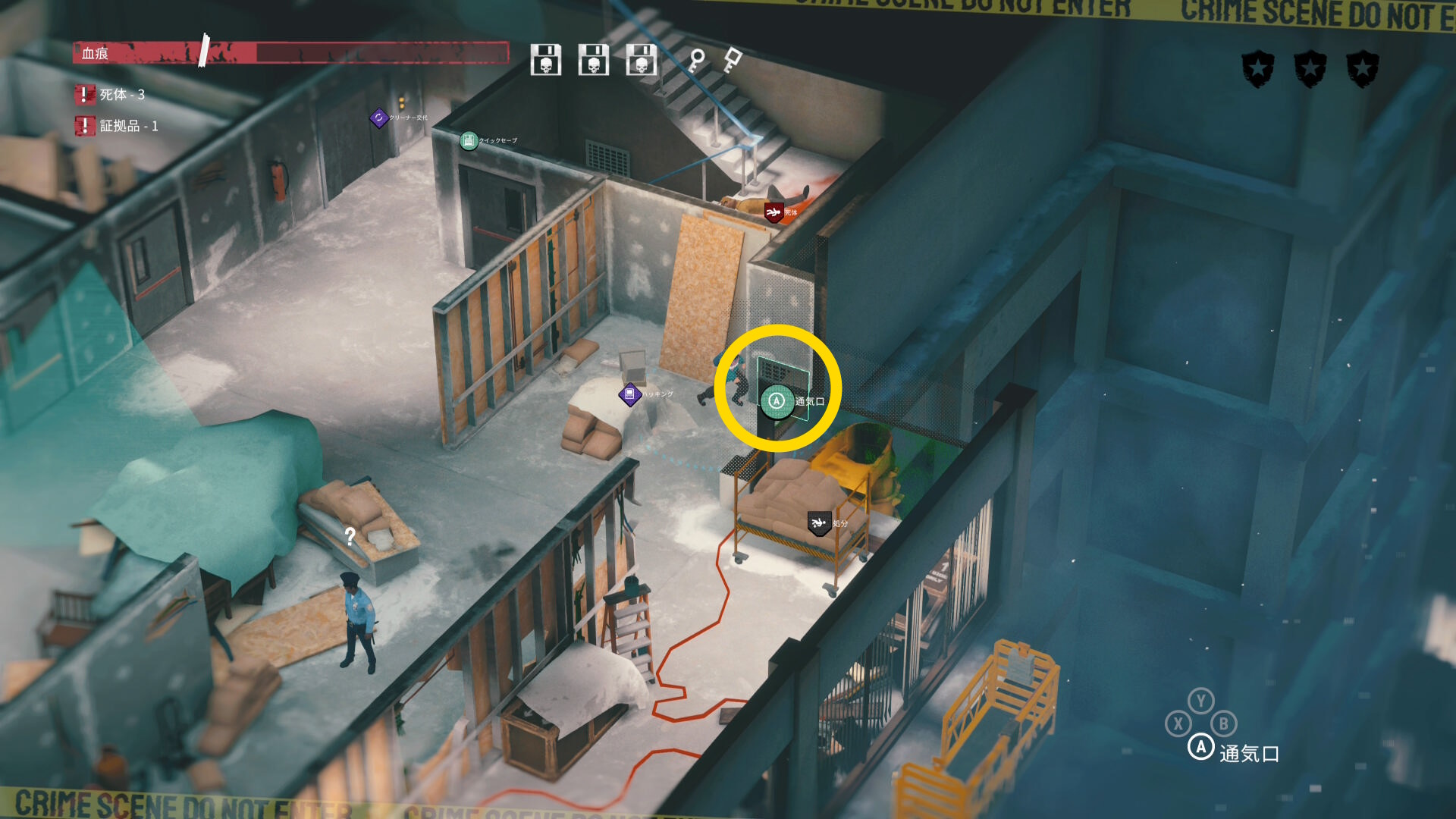 - 2人の捜査員の動きもあり、血痕の片付けもなかなか捗らないと思うが通気ダクトに逃げたり、もう一度監視カメラを停めたりして頑張ろう