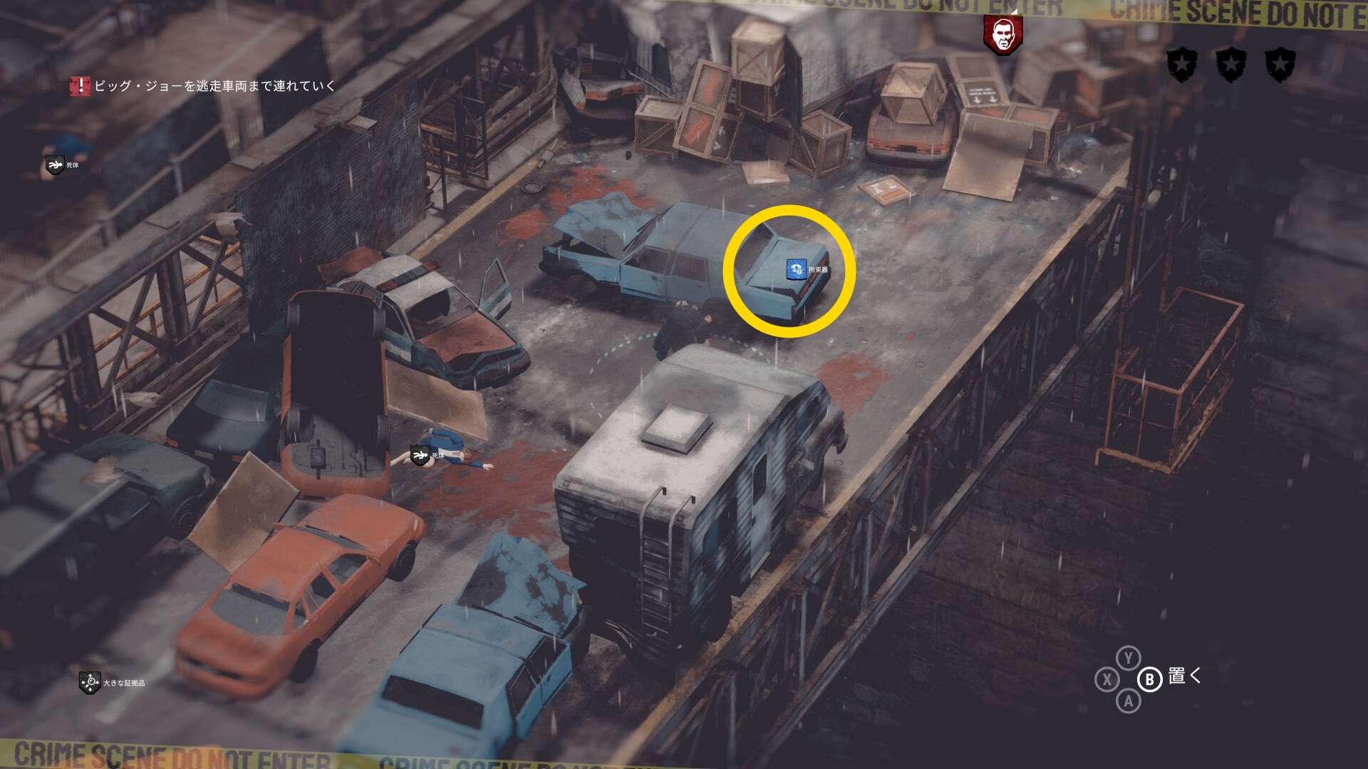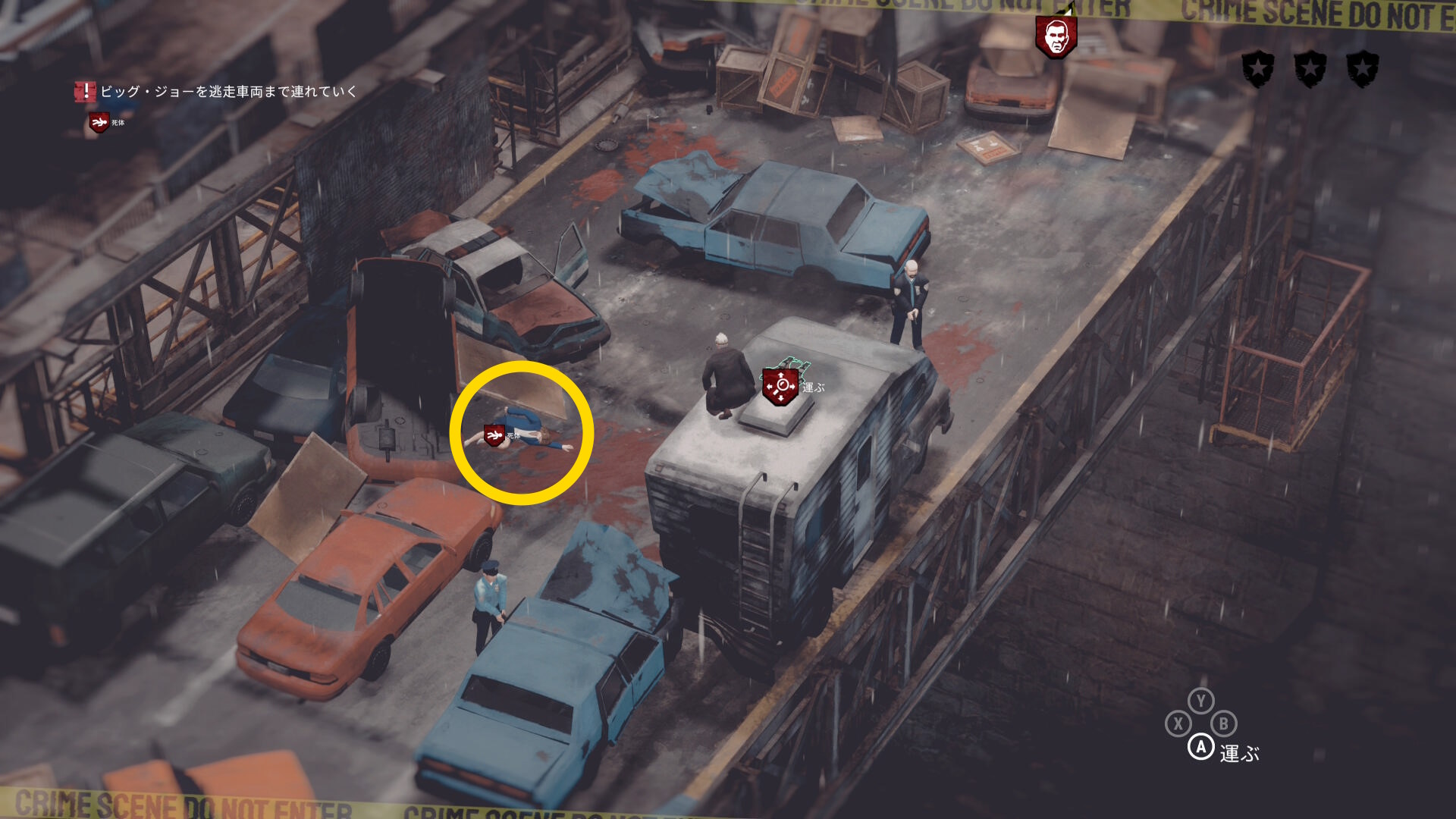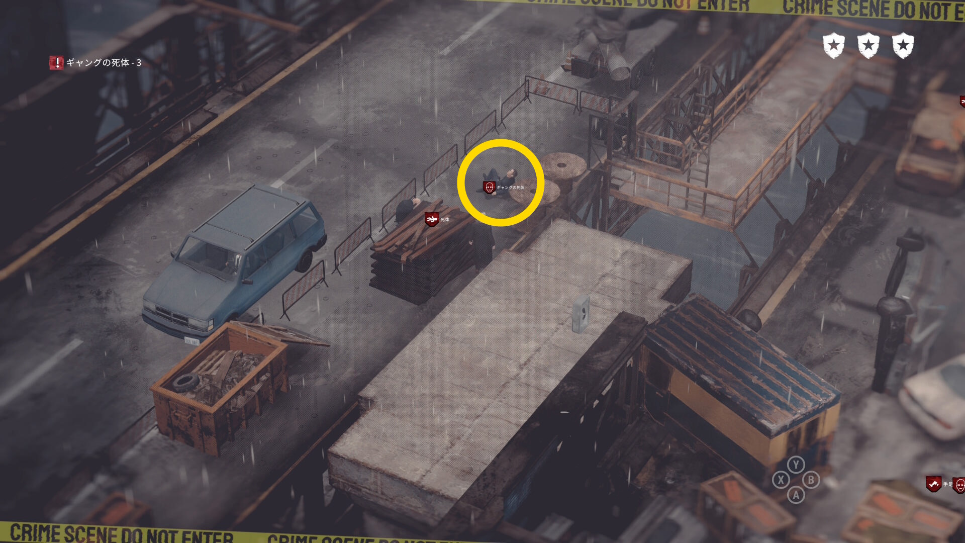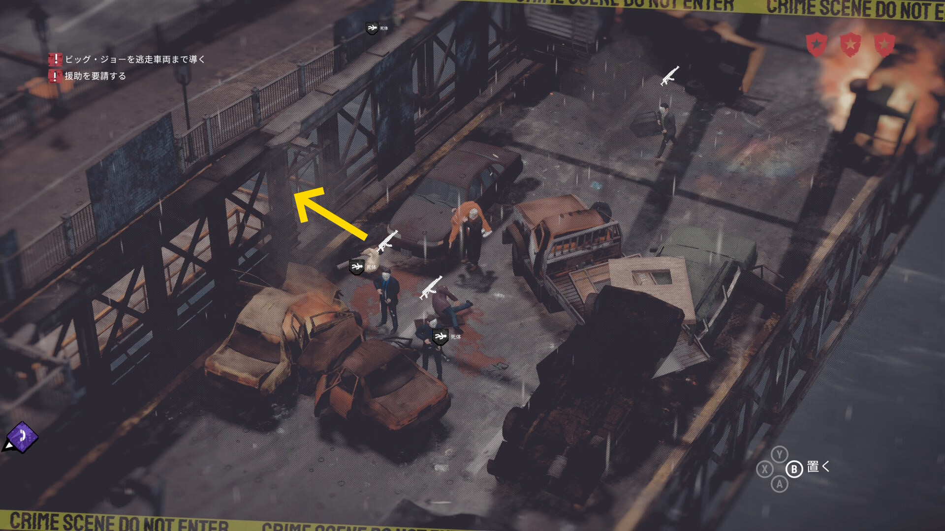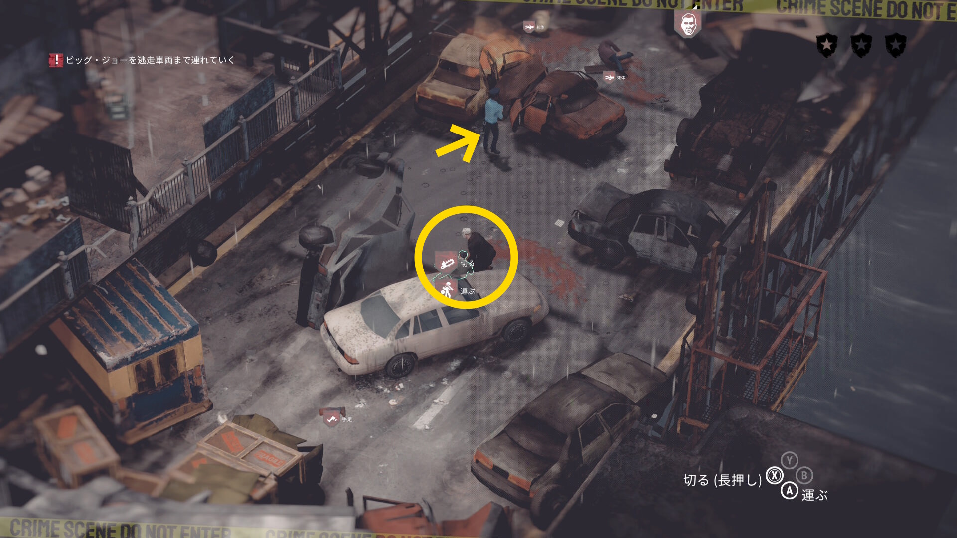 • ギャングの死体がある場合は画面左上に数が表示される。表示が出ない場合は全員生存しているので何もしなくてオーケー(当サイトでは3体の死体があると表示された)