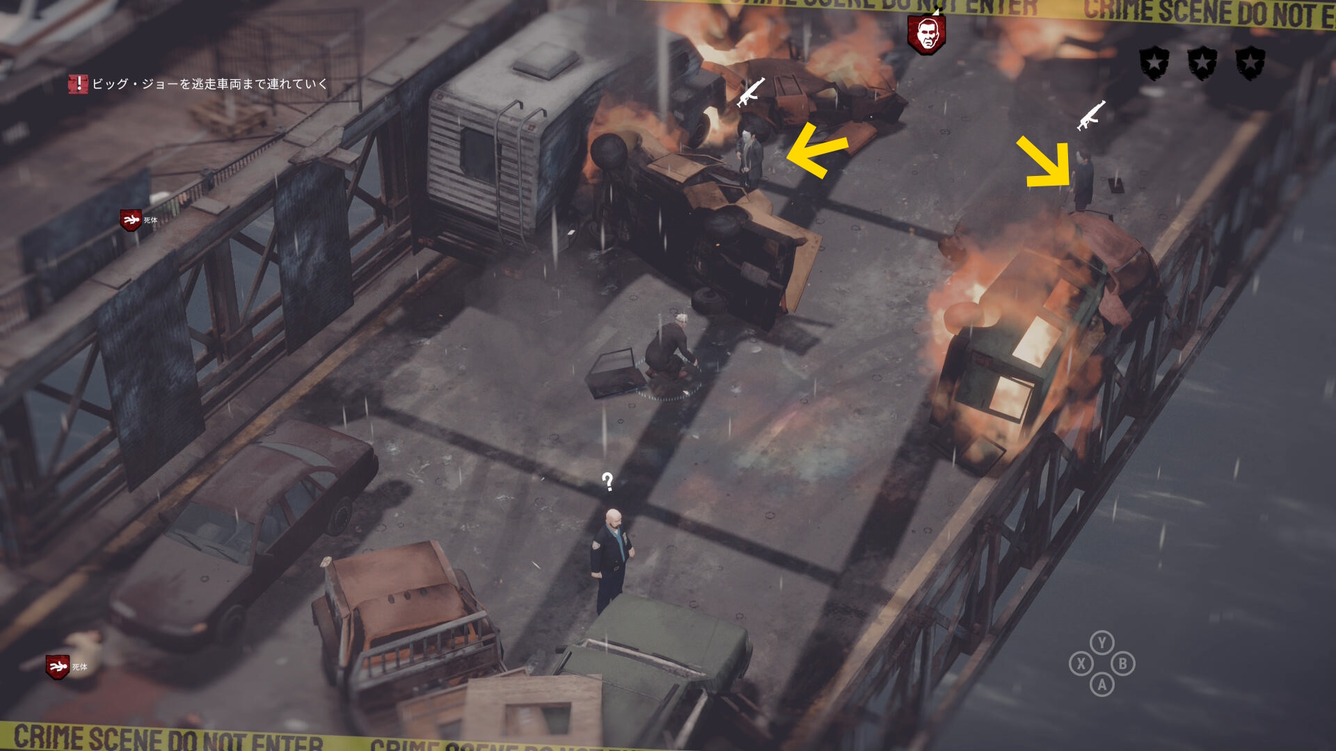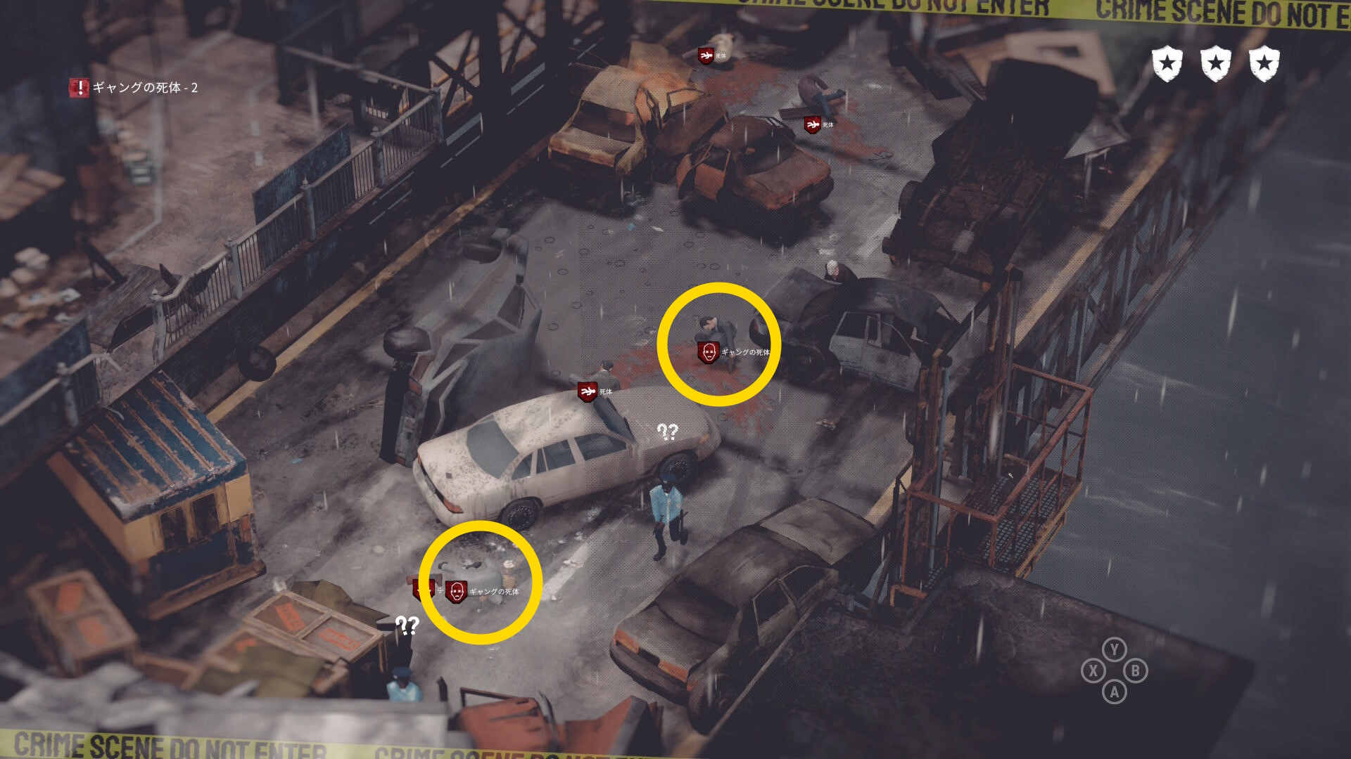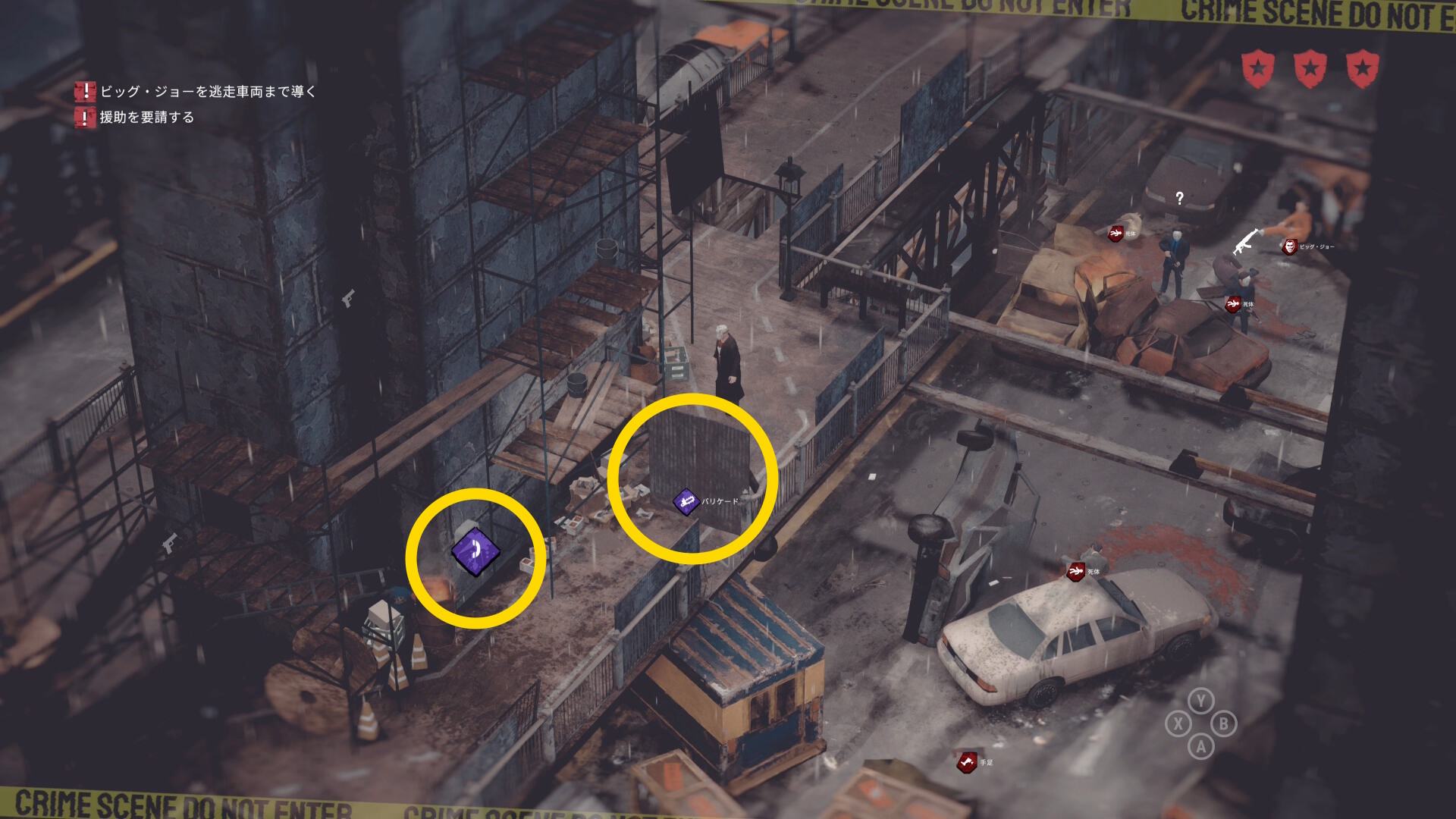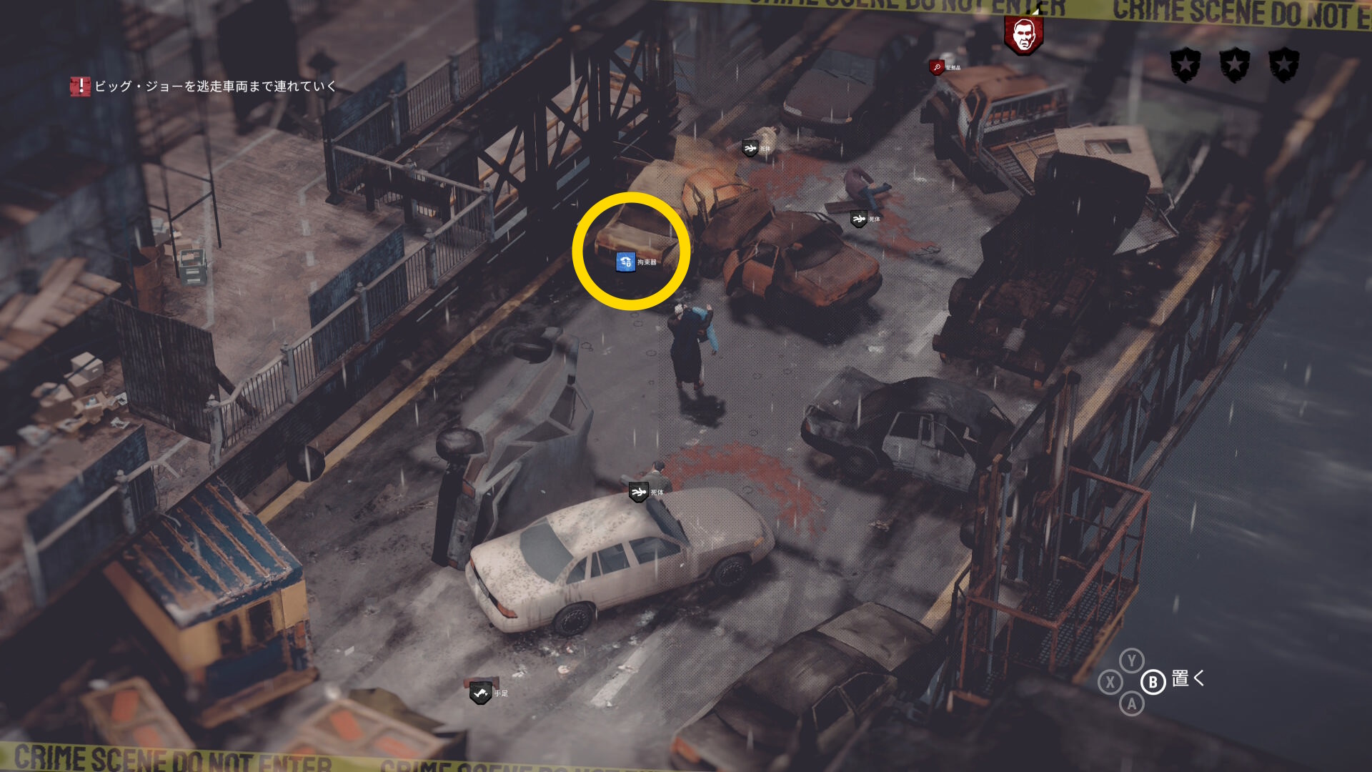 • ギャングの死体がある場合は画面左上に数が表示される。表示が出ない場合は全員生存しているので何もしなくてオーケー(当サイトでは3体の死体があると表示された)