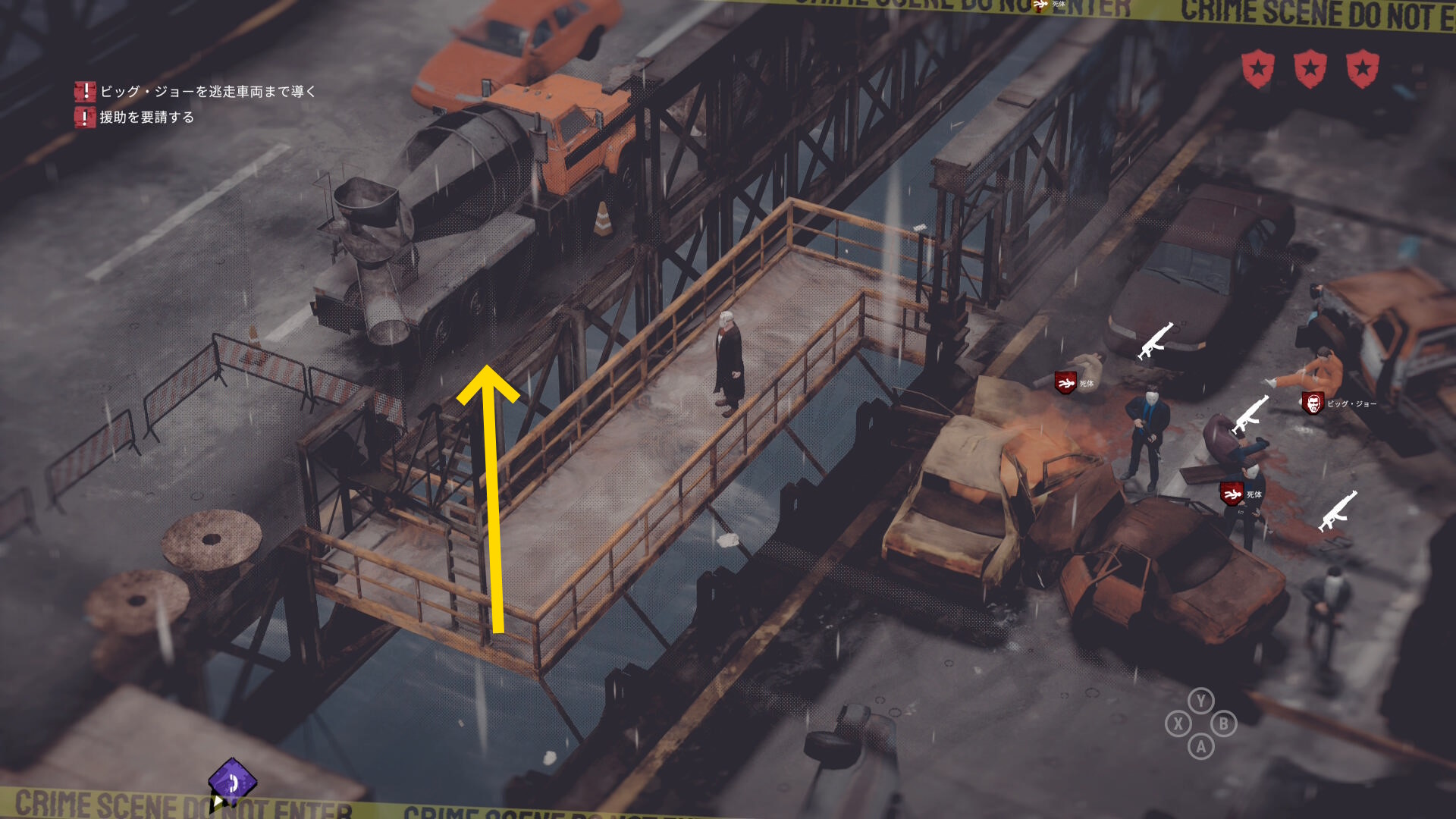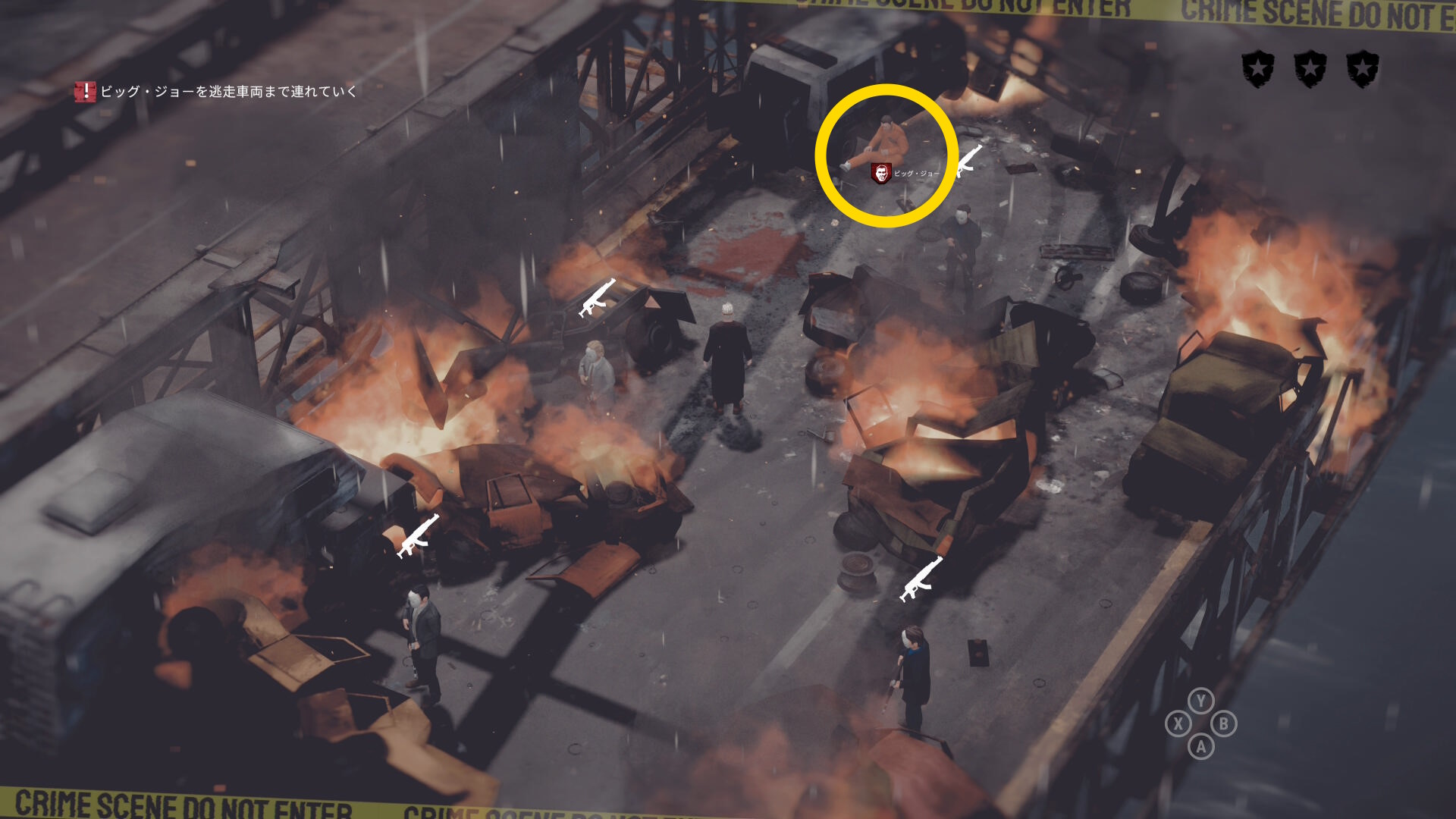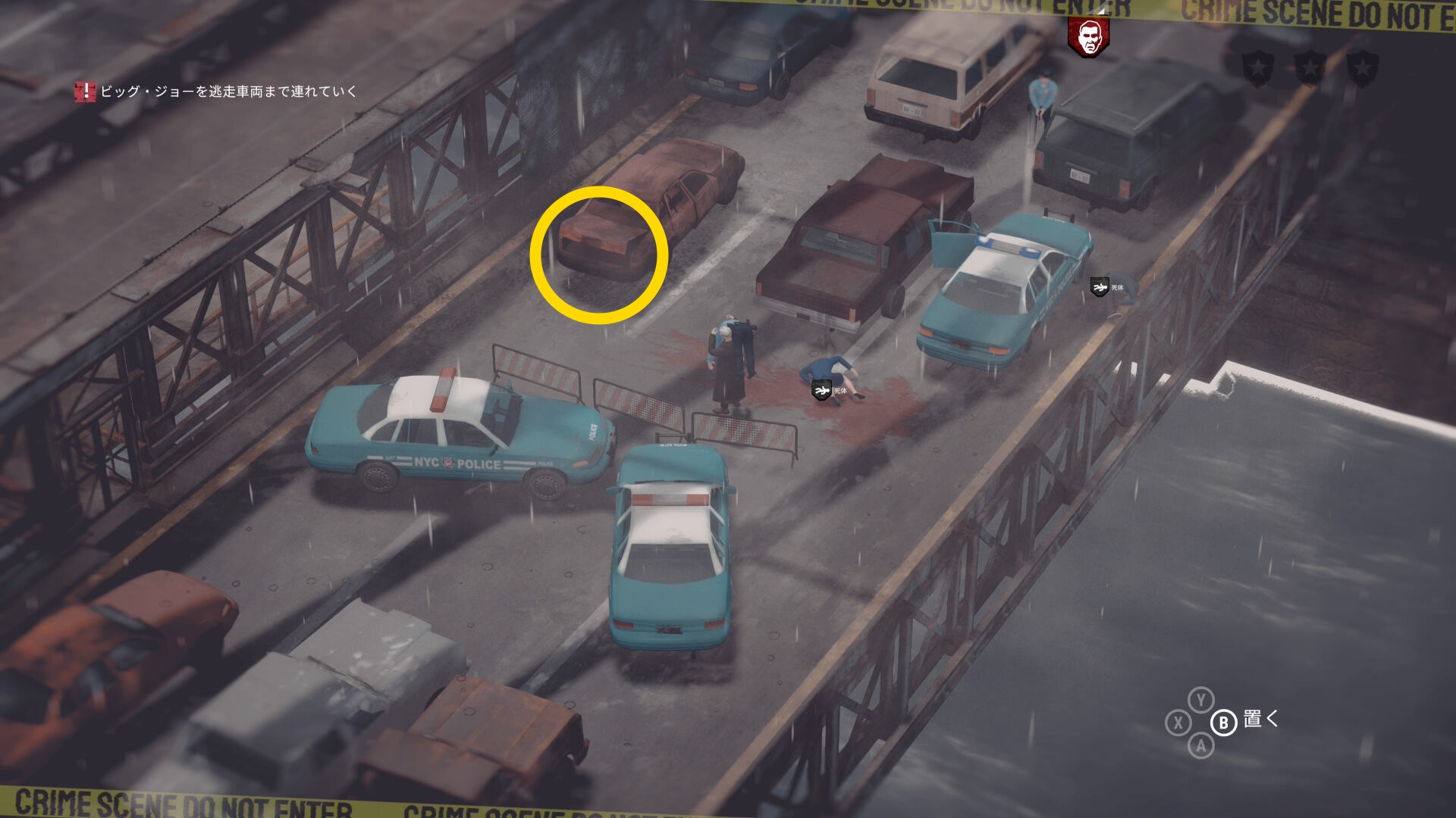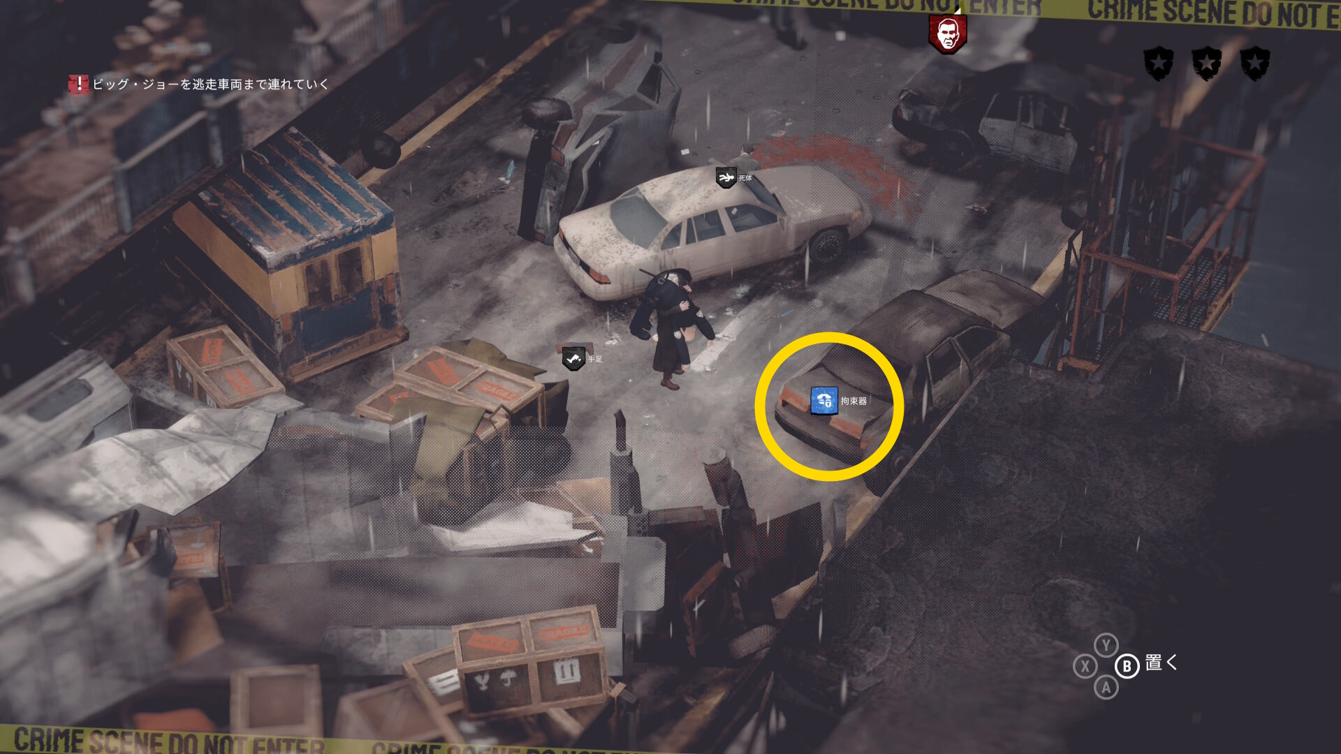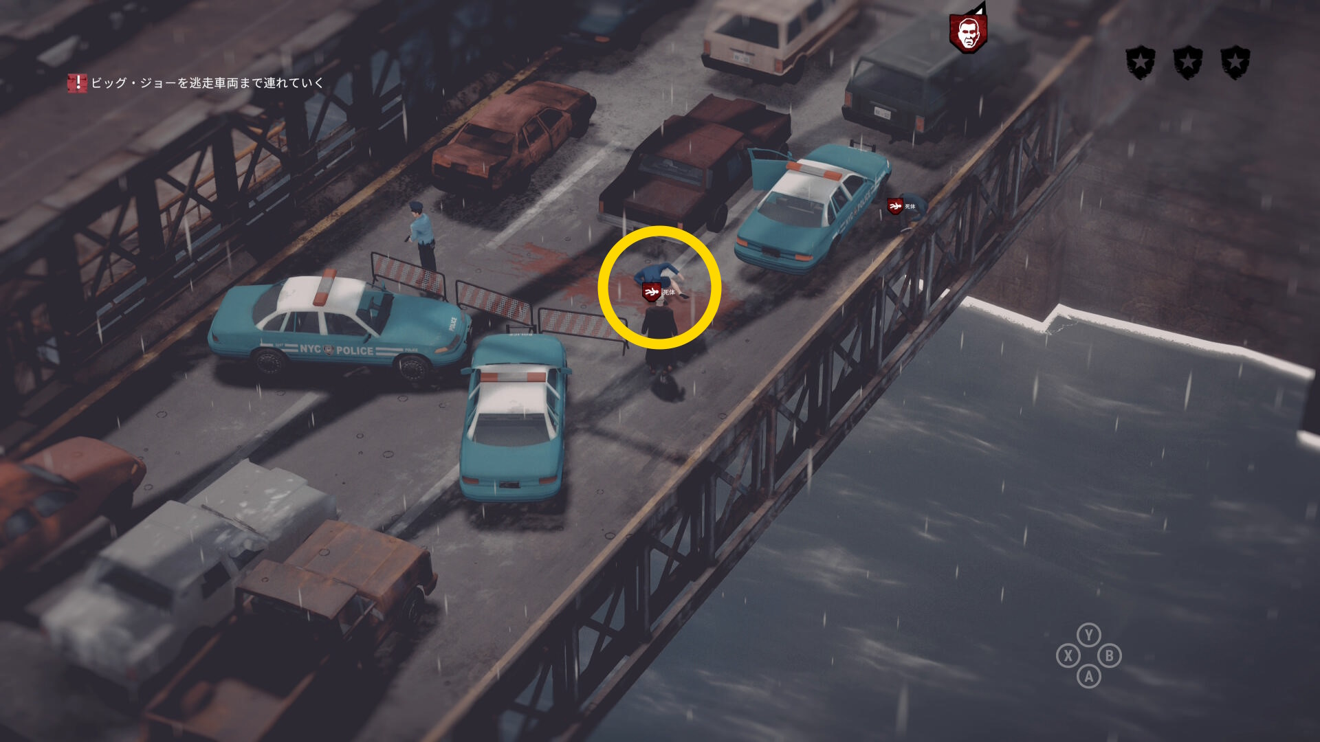 • ギャングの死体がある場合は画面左上に数が表示される。表示が出ない場合は全員生存しているので何もしなくてオーケー(当サイトでは3体の死体があると表示された)
