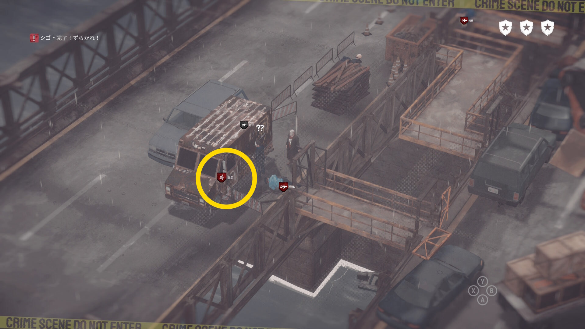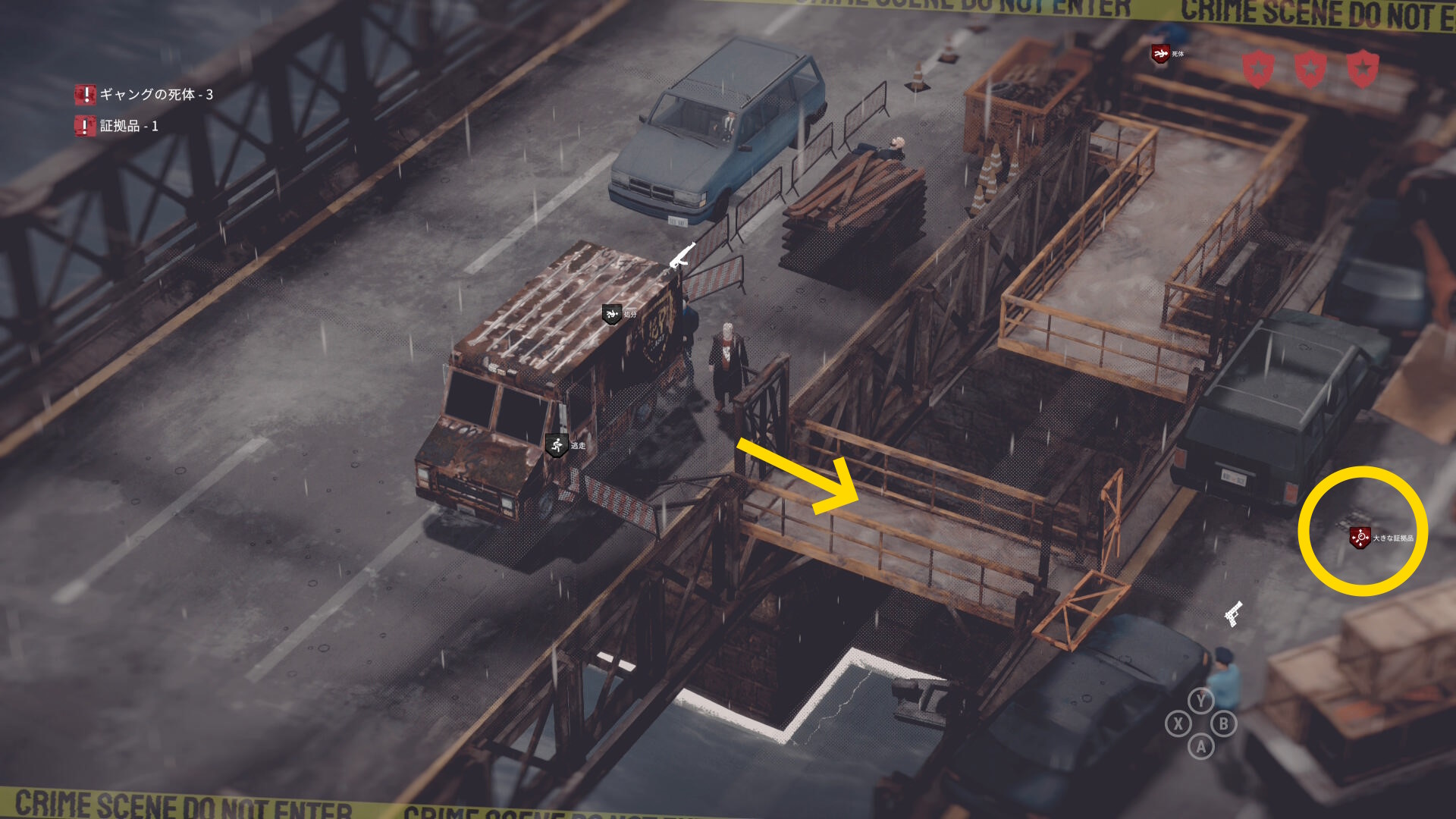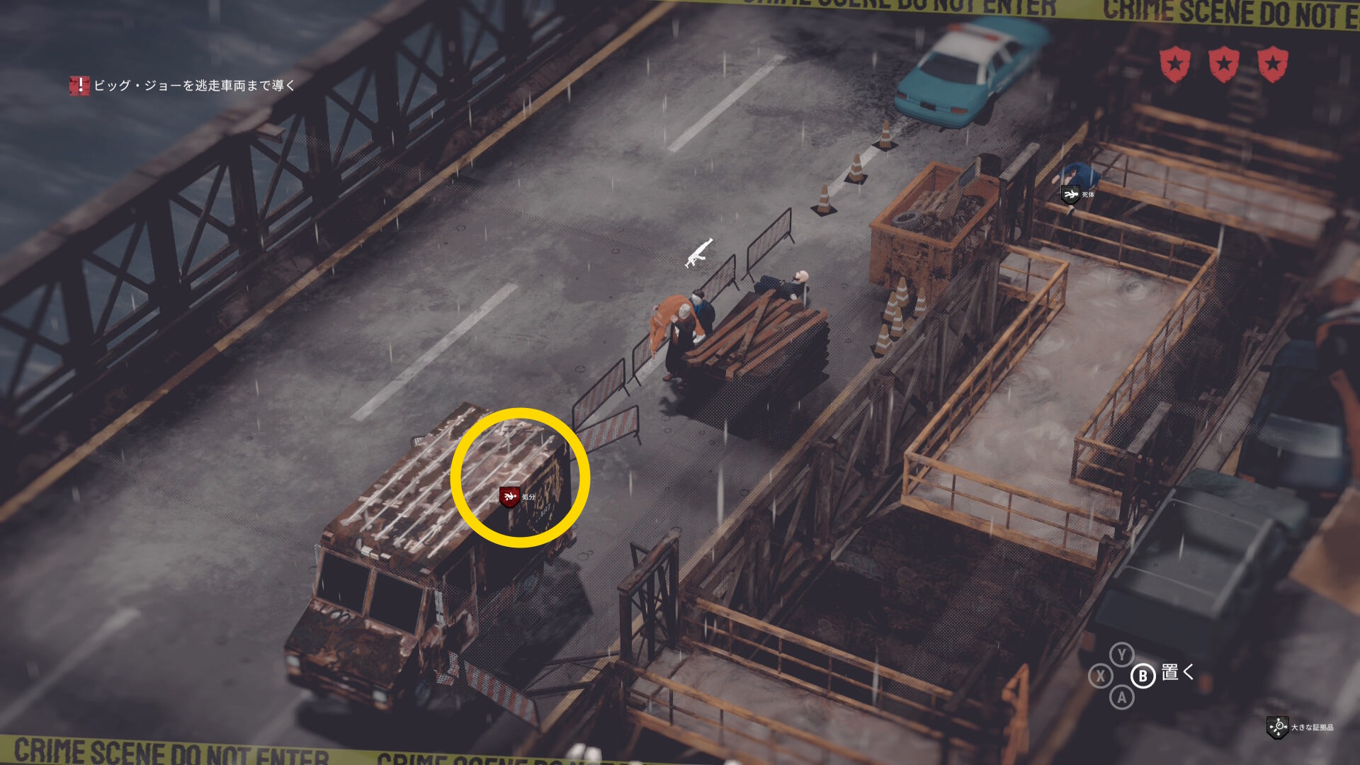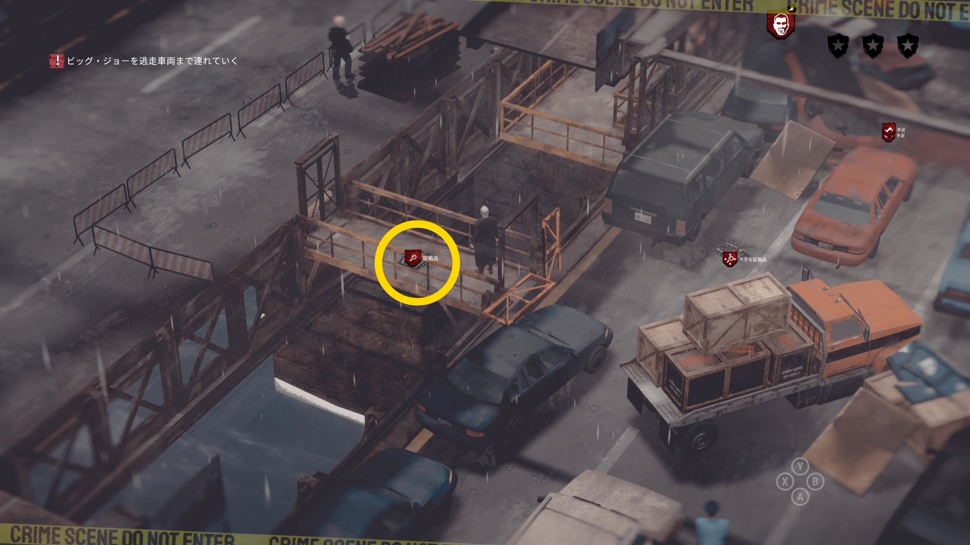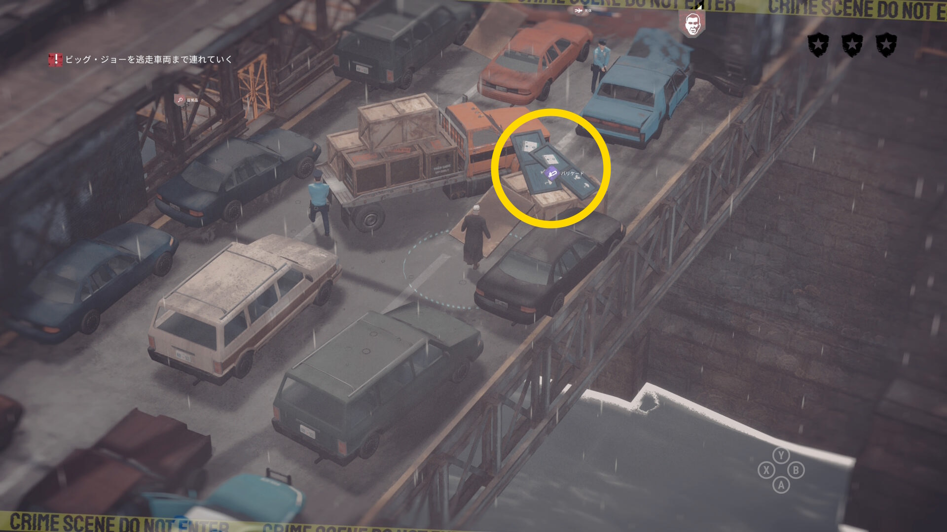 • 序盤にはしごの付いた車から投げた大きな証拠品を回収し、汚いバンに持って行く