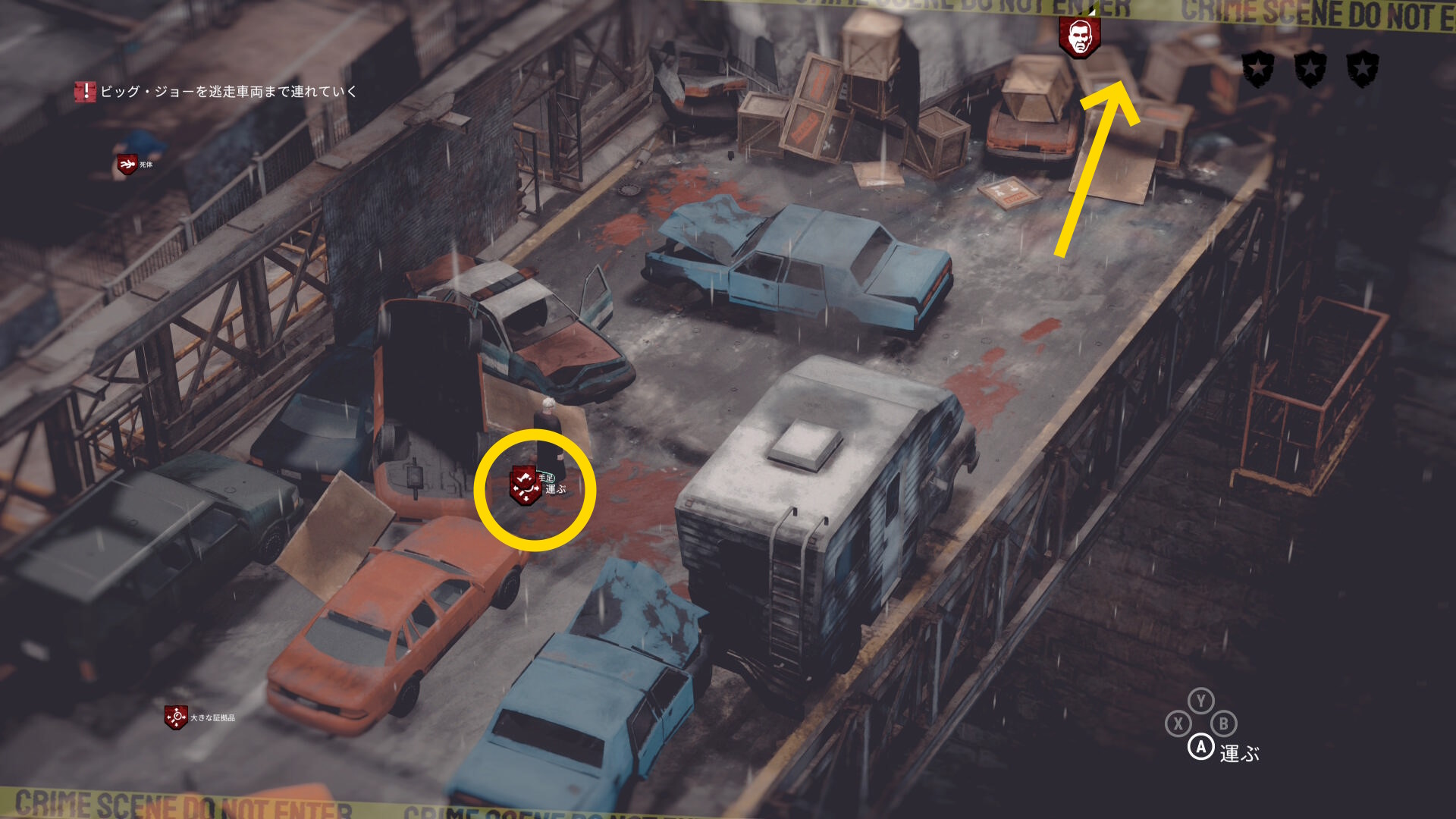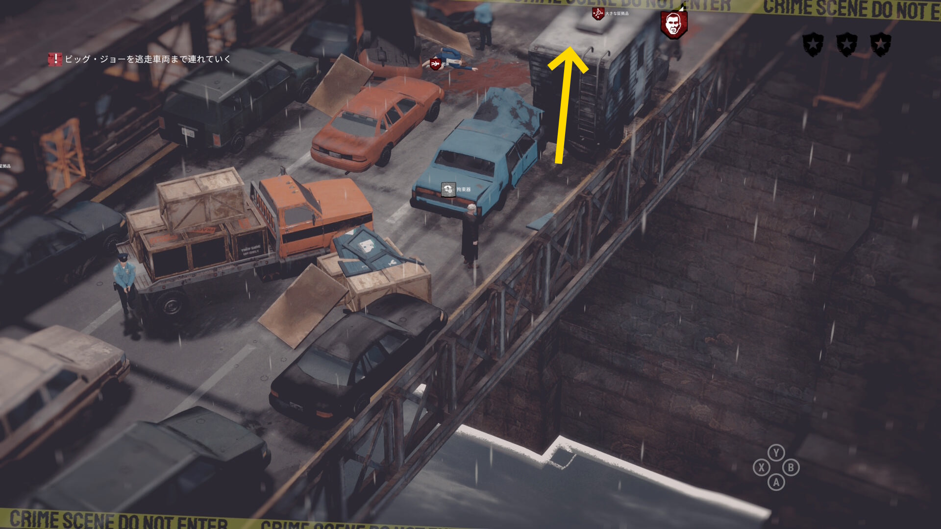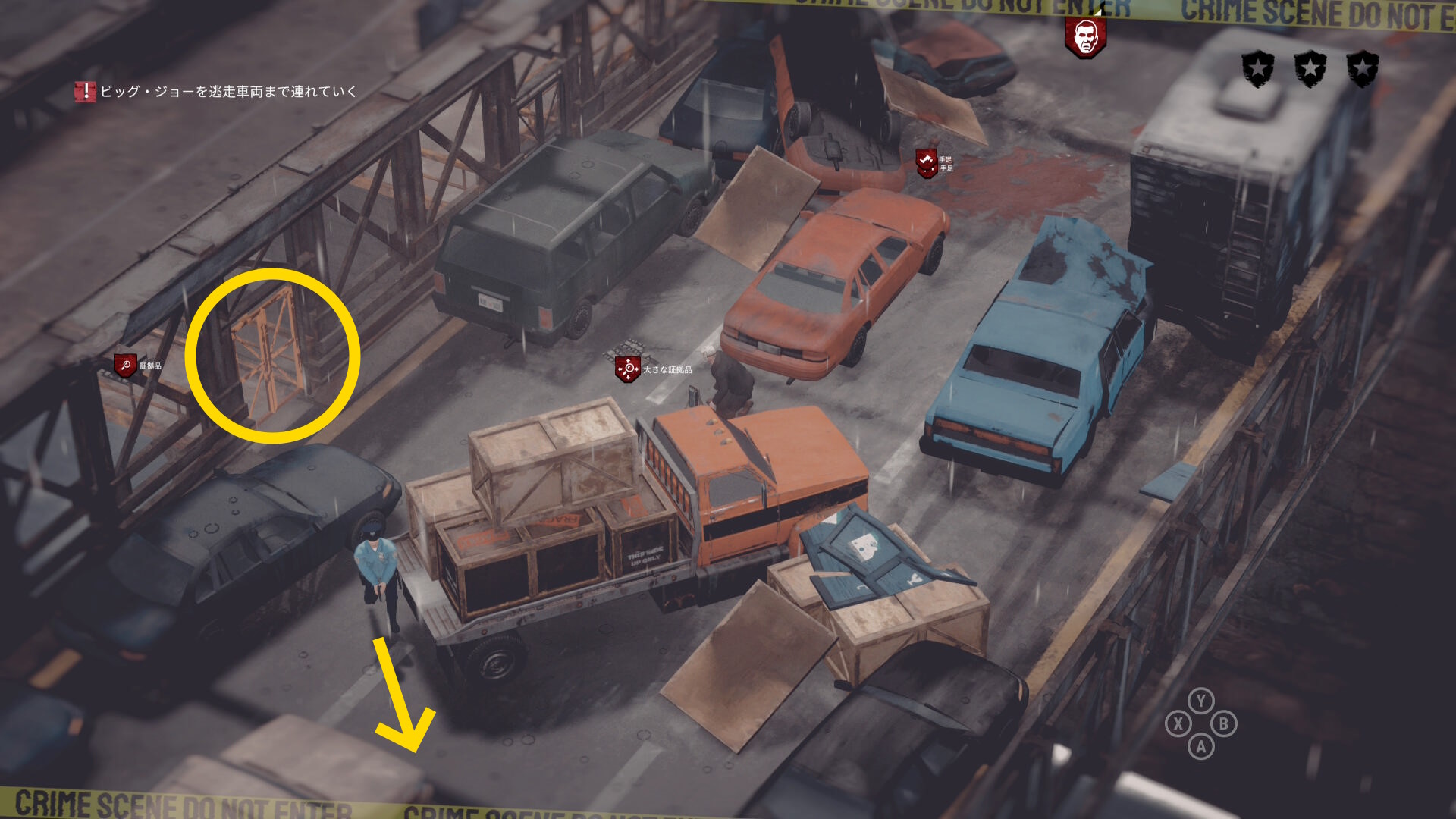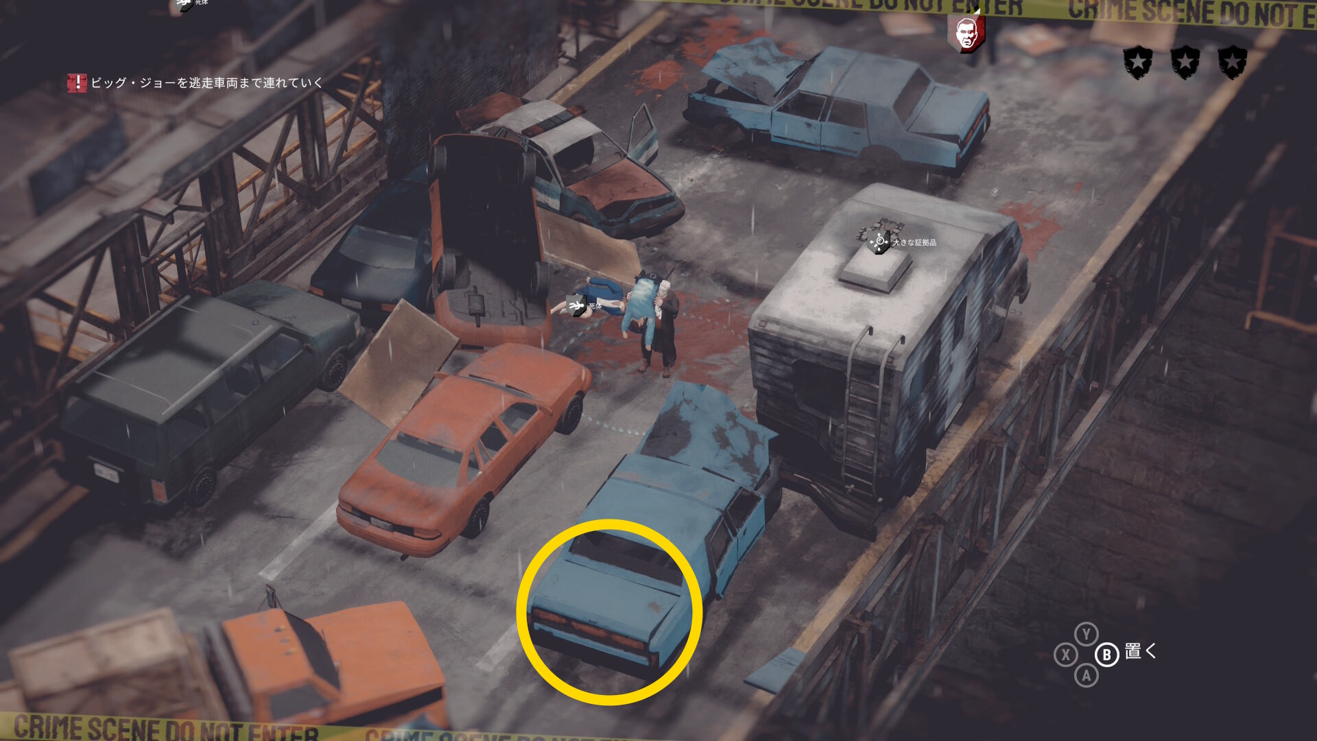 • 屋根には 大きな証拠品 があり、左下の赤い車の先に投げておく(下画像2枚目)