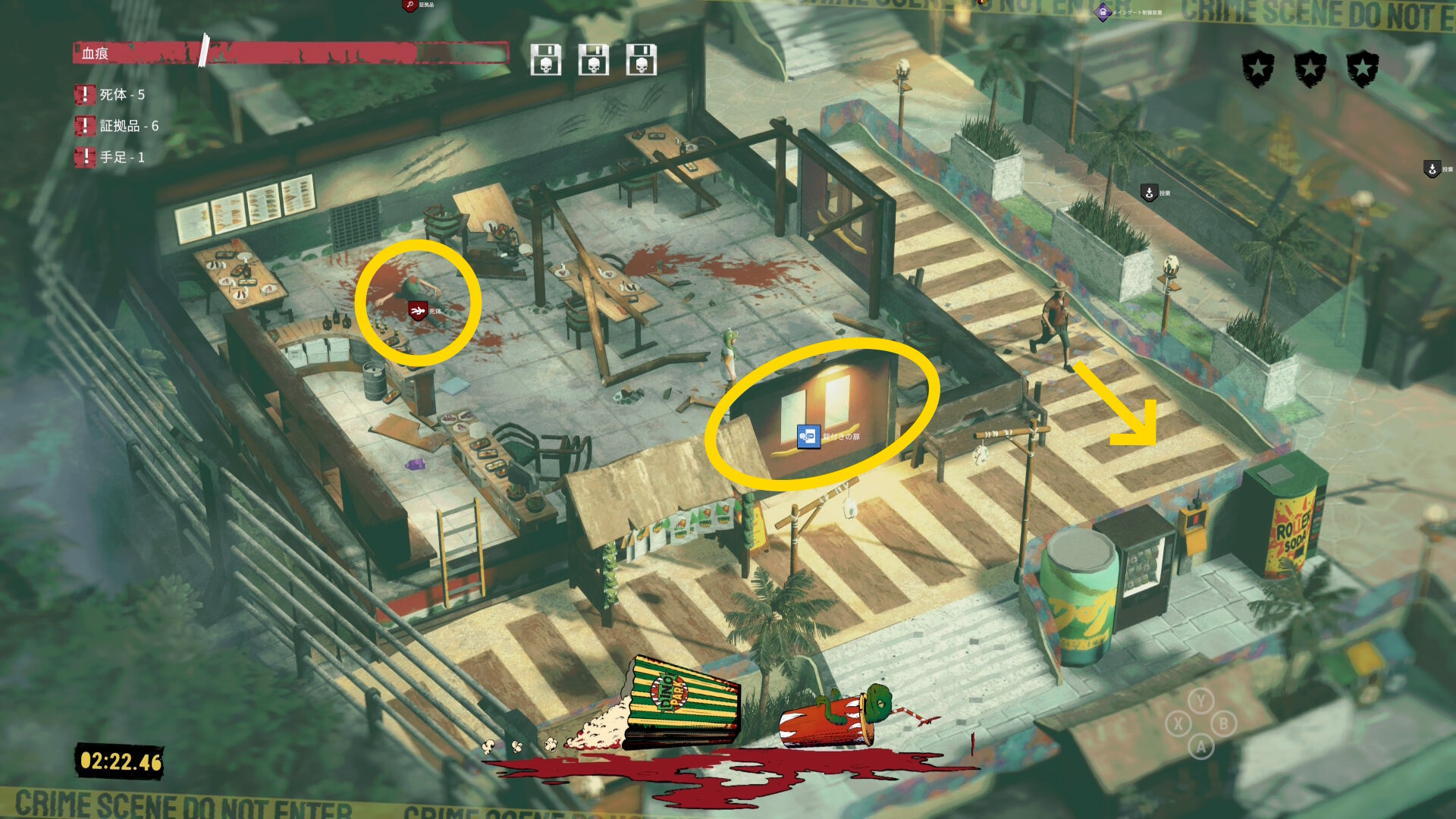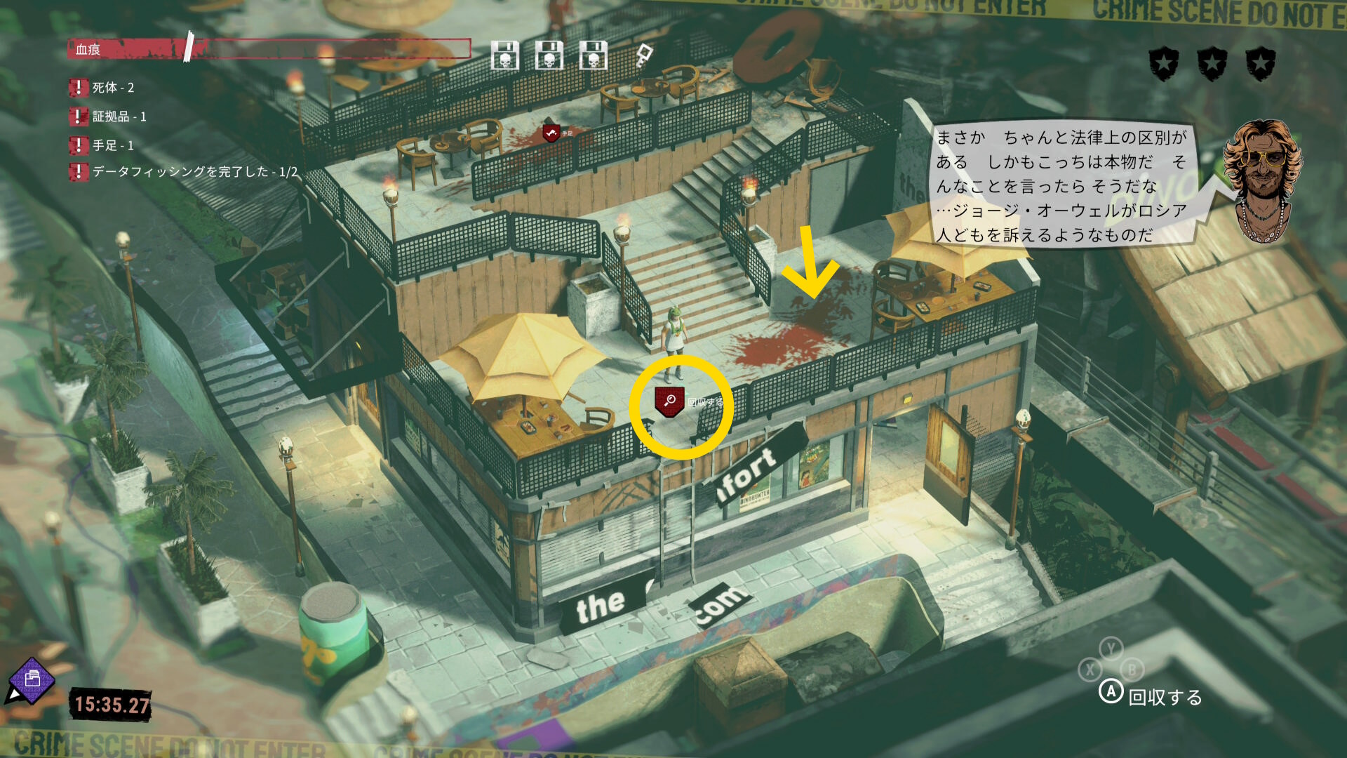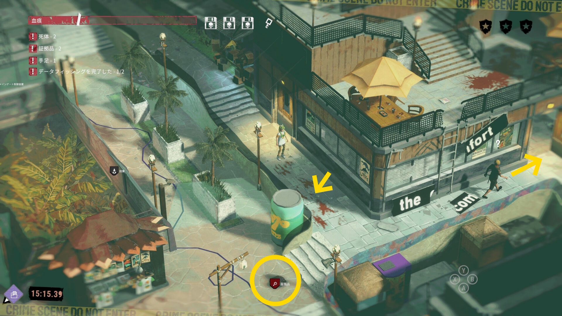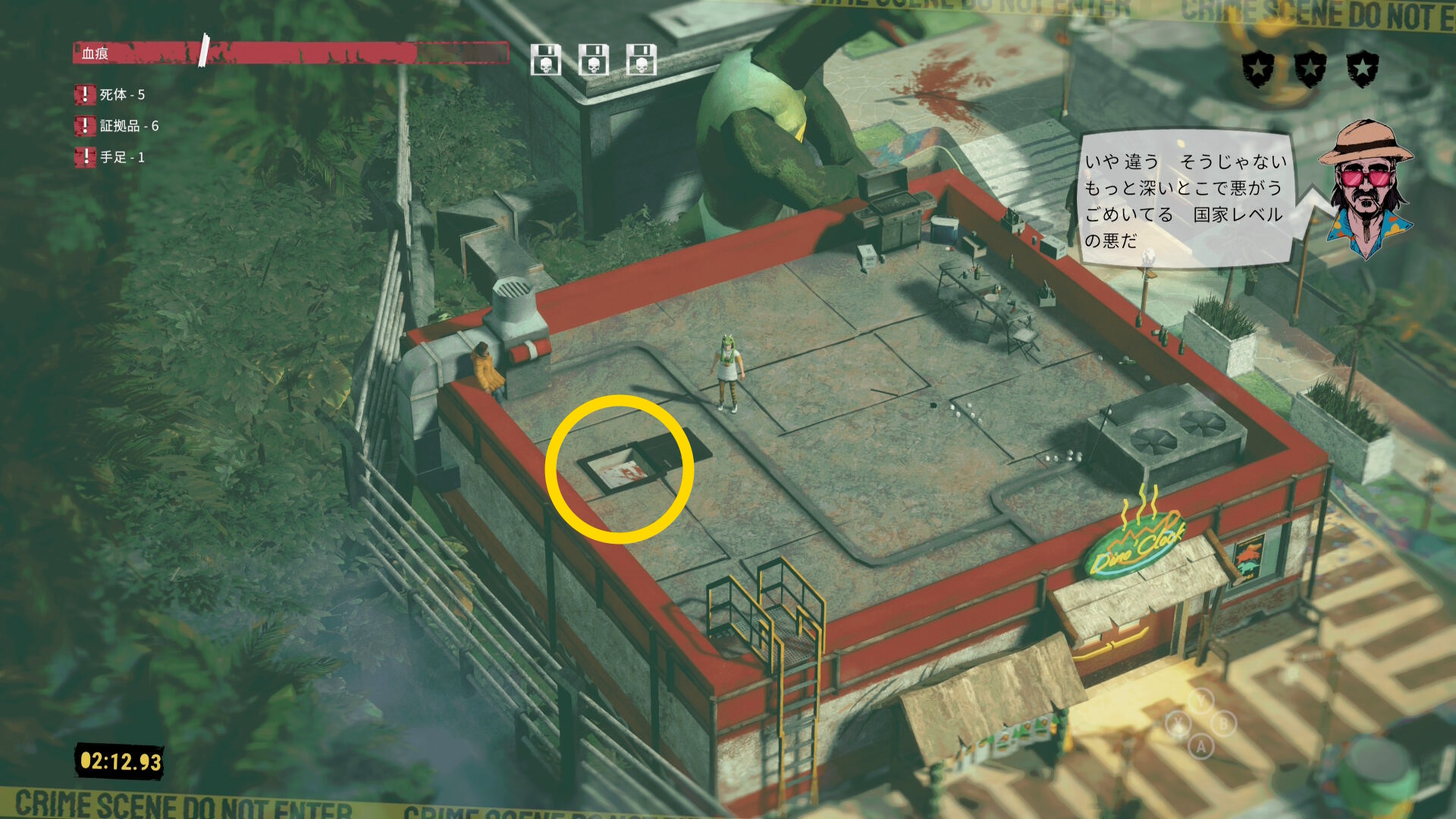 - 死体を投棄場まで運ぶが、バーとゲーセンの間くらいのところにある証拠品の回収を忘れずに