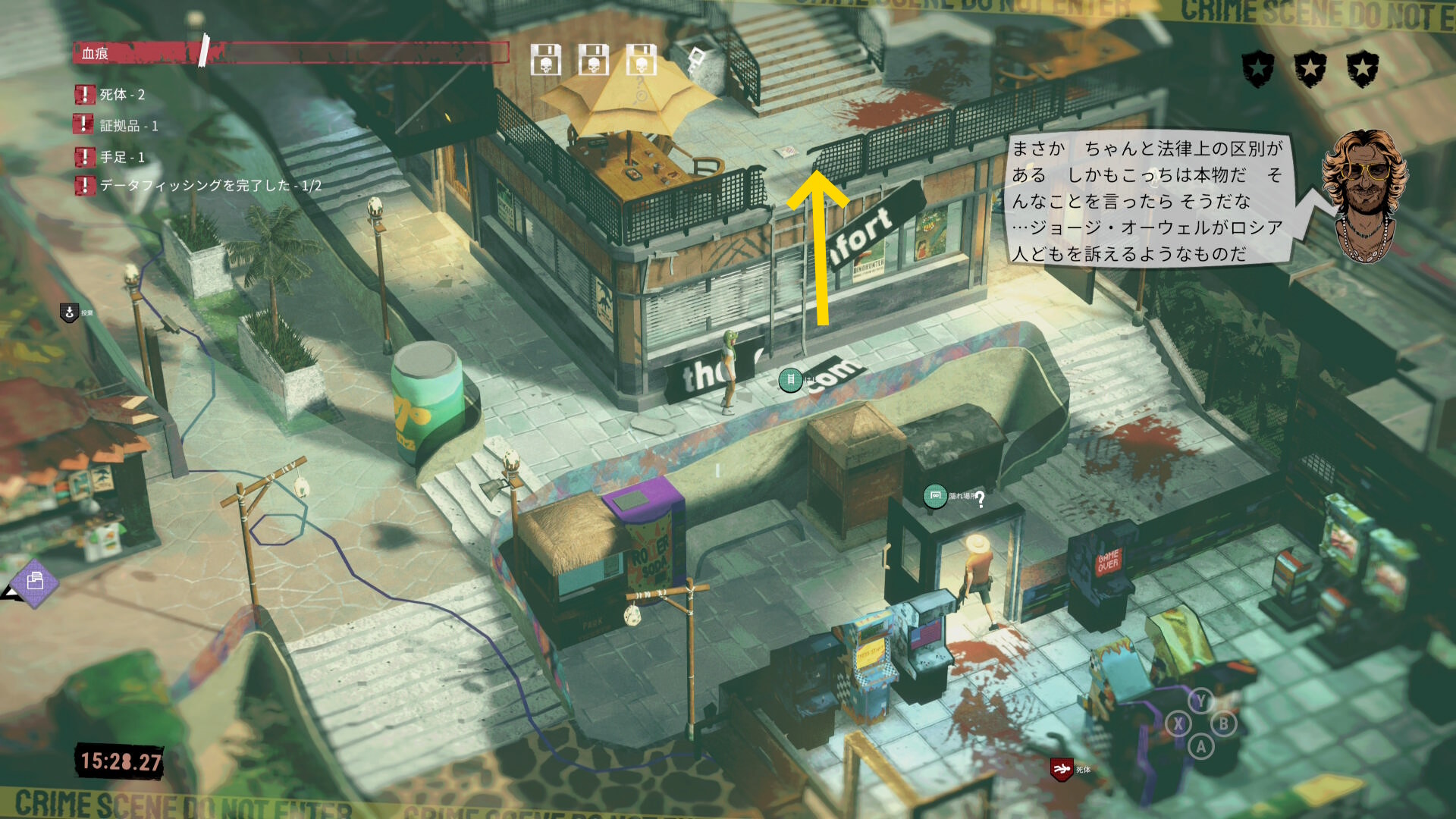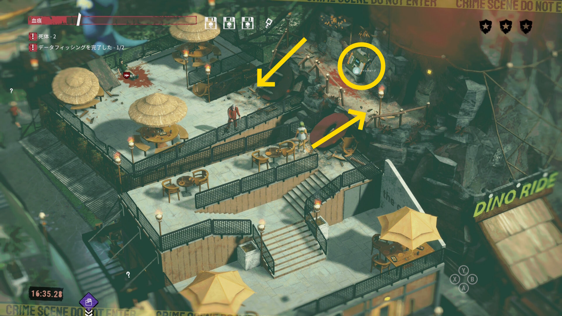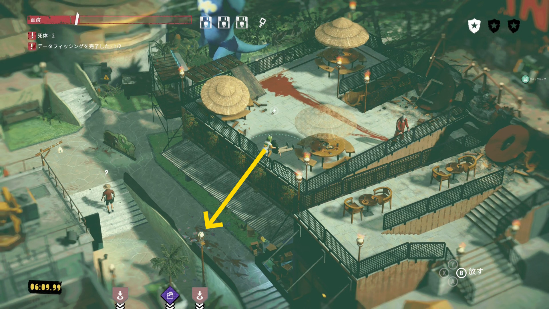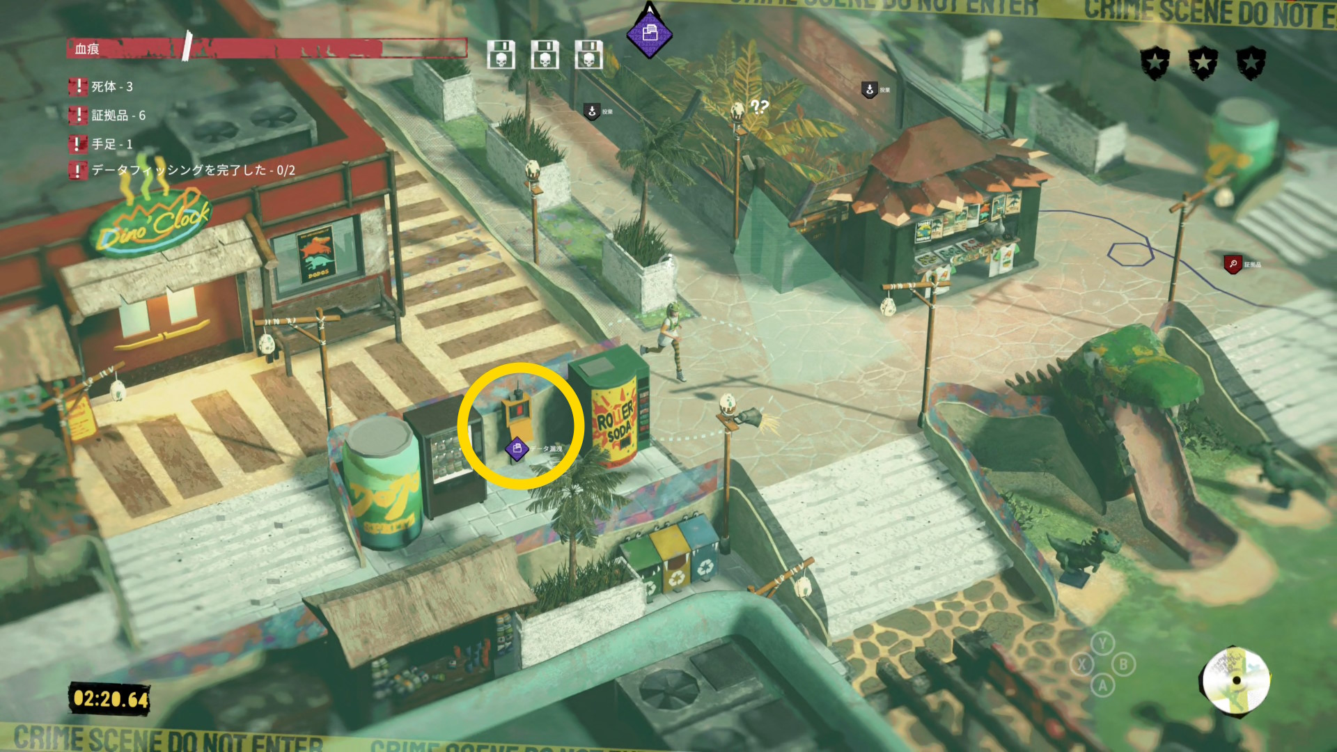 - 死体を投棄場まで運ぶが、バーとゲーセンの間くらいのところにある証拠品の回収を忘れずに