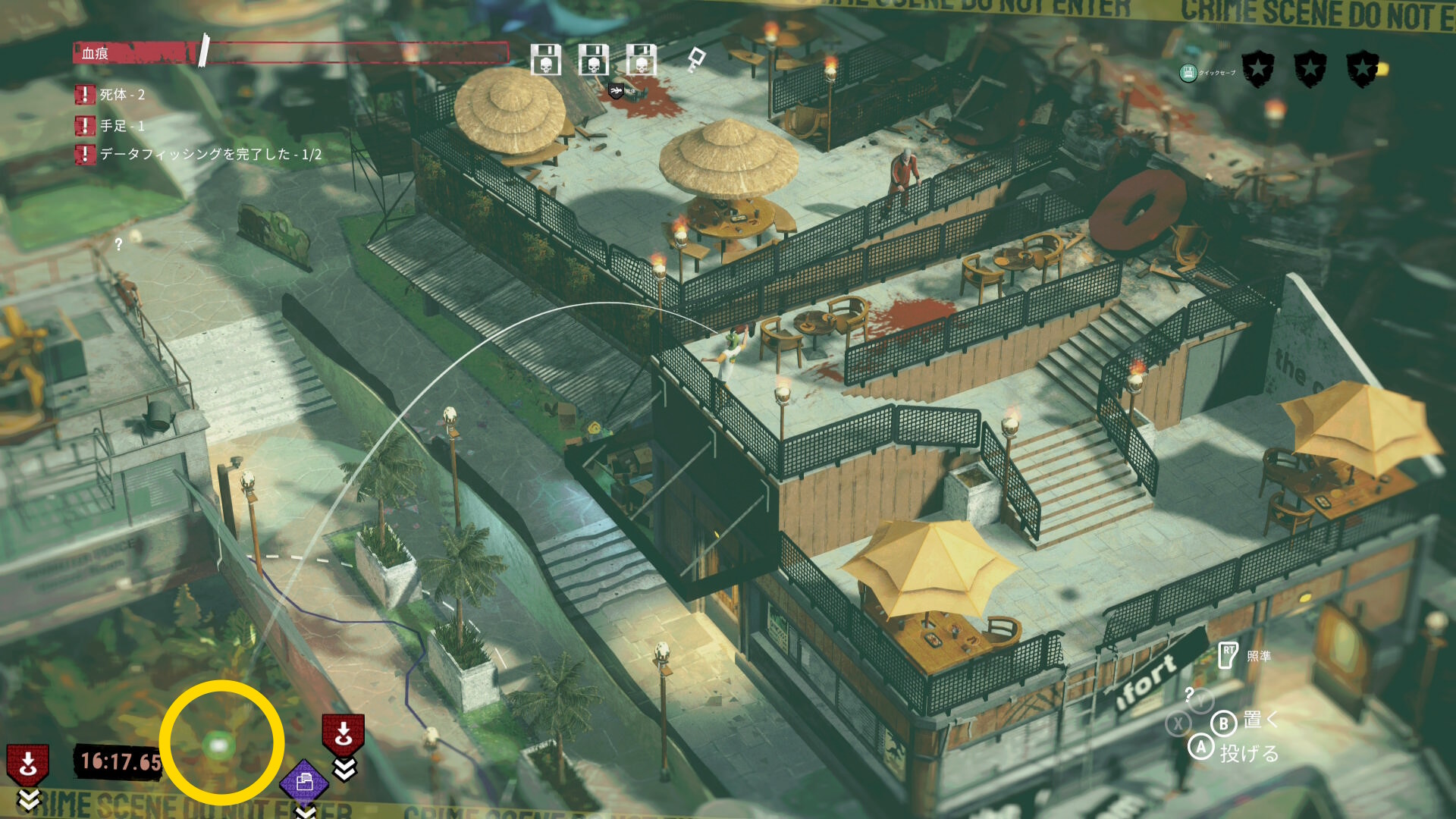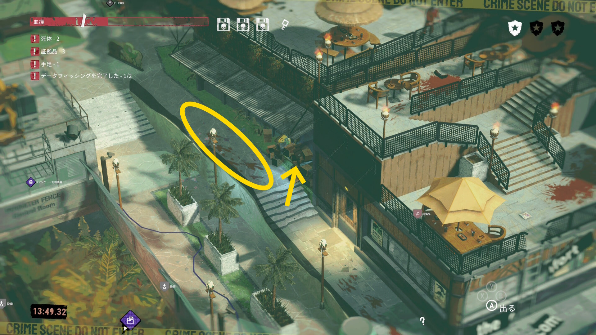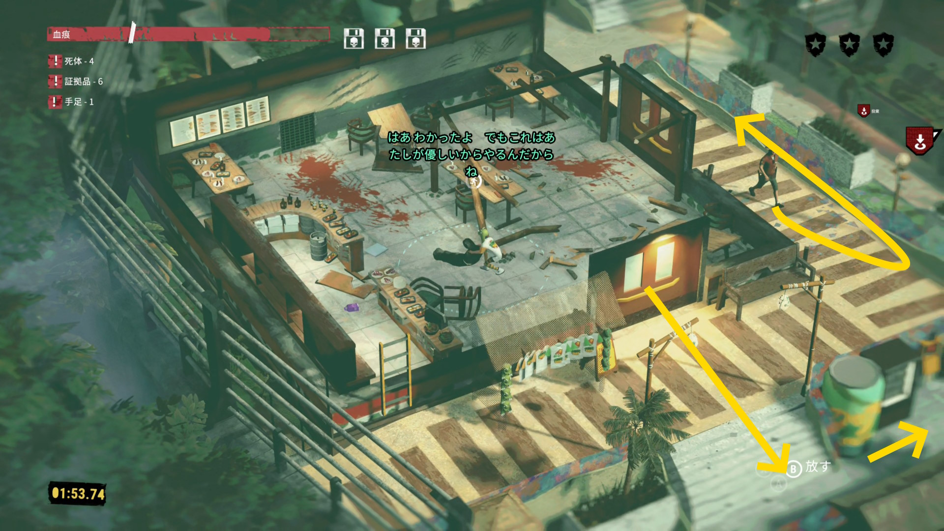 - バーの2階奥にある死体を引きずると血痕が増え、白い線を戻ってしまうことがあるので注意(つまり、また白い線を越えるまで血痕を片づける必要があるということ)