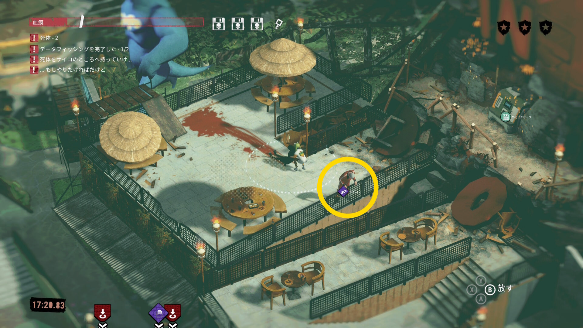 - 会話が終わったらサイコにマーカーが出現するので、死体を引きずったままの状態で A を押せば切断してくれる