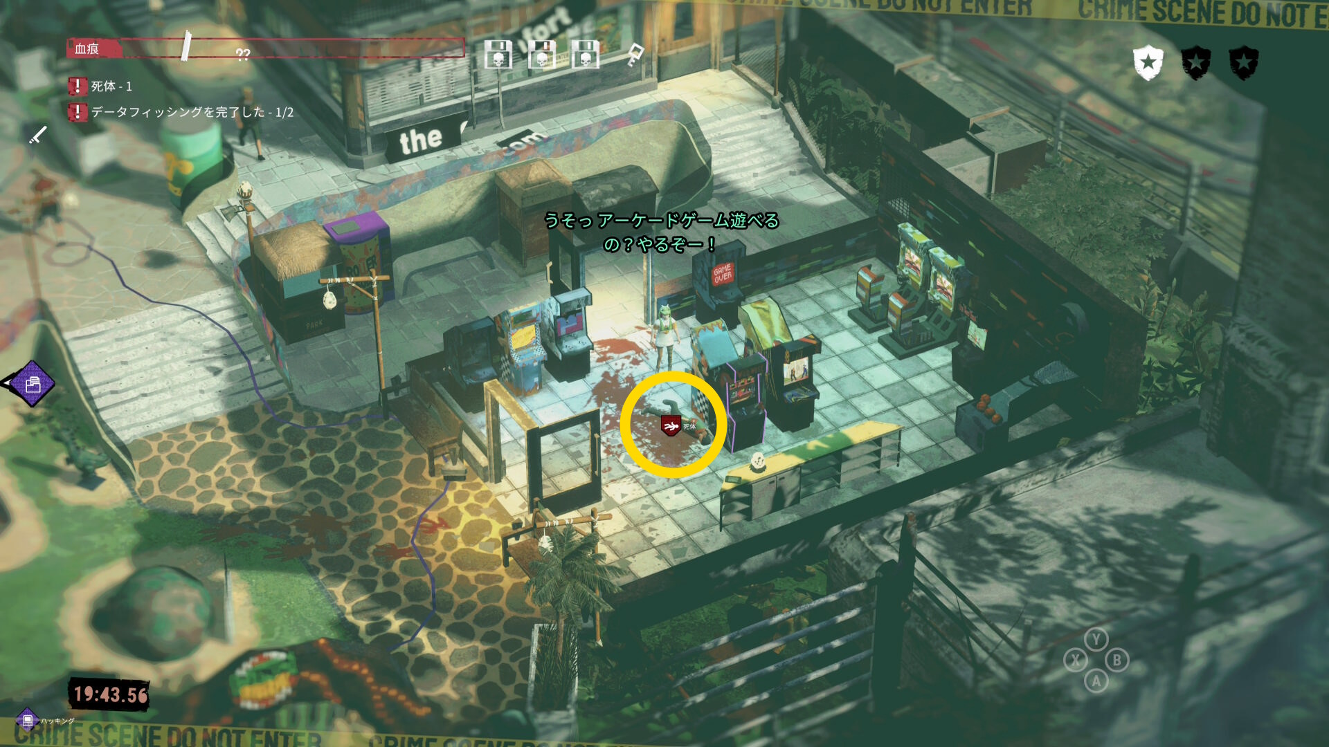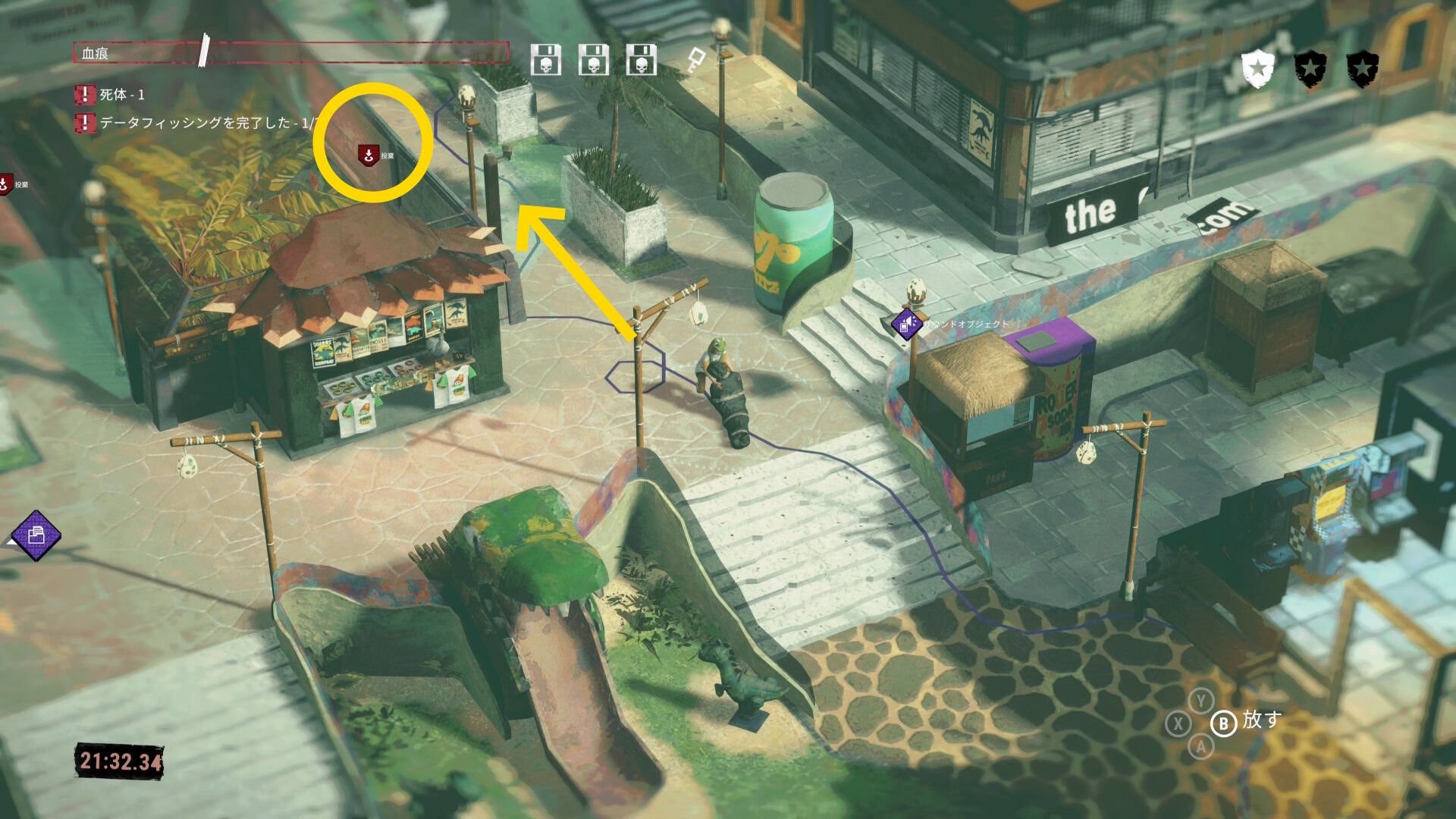 - ゲーセンに入ると 6体目の死体 と血痕がある ⇒ ゲーセンの外(左側)にも血痕があるので忘れずに片づける