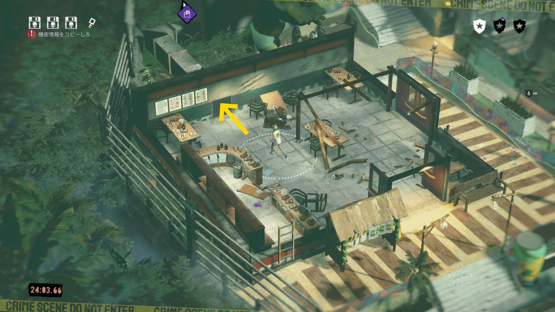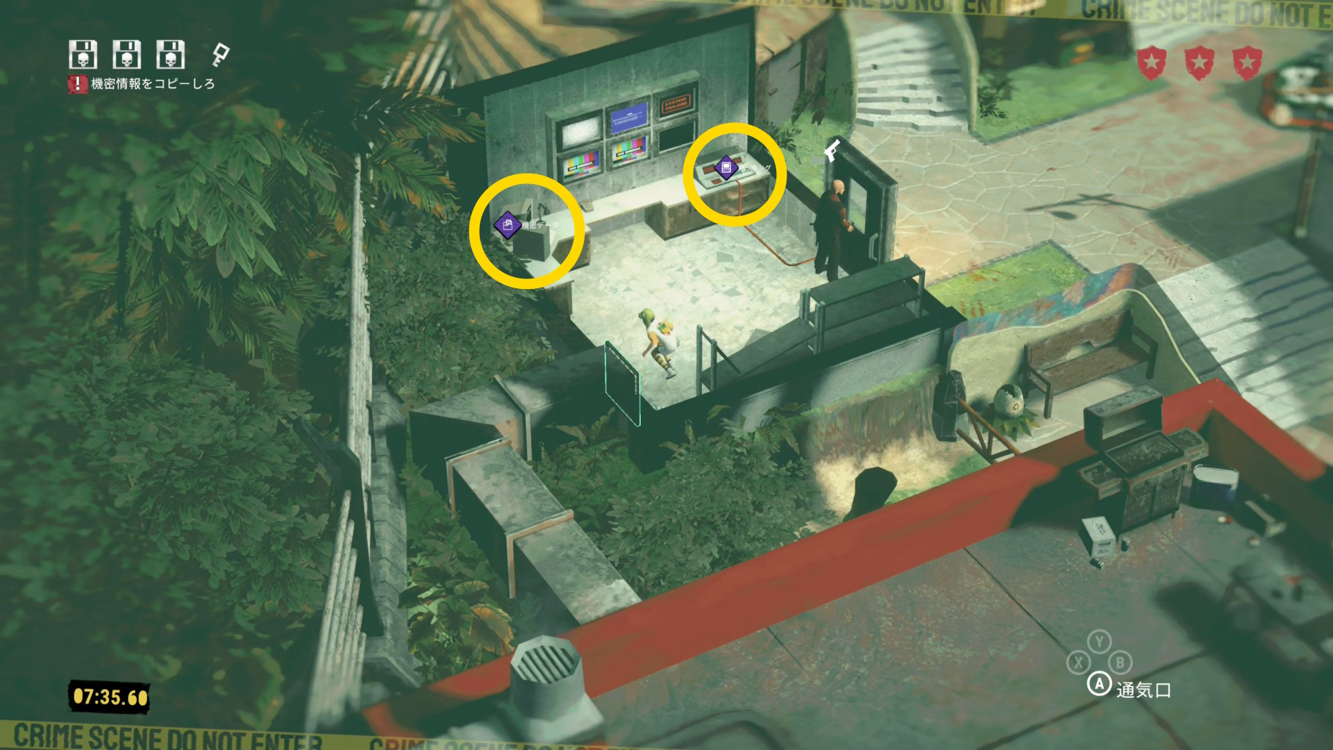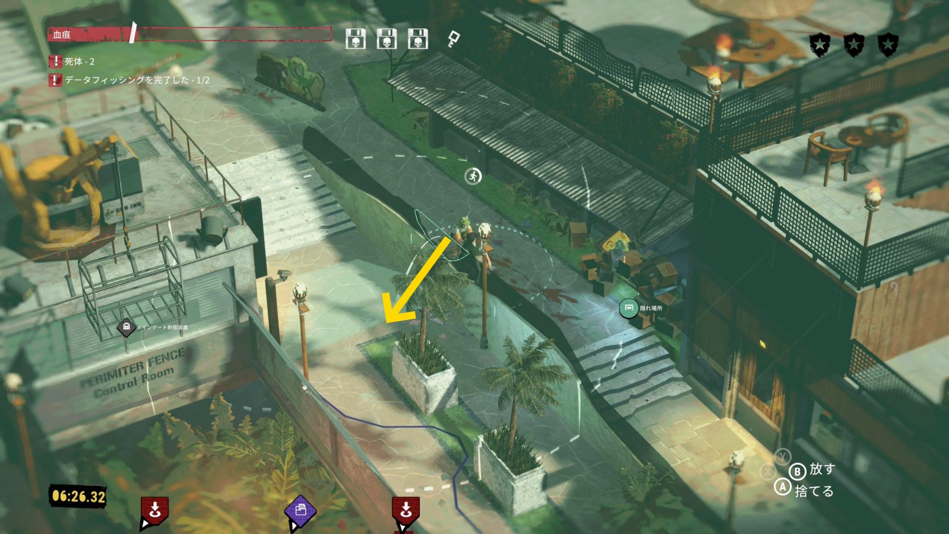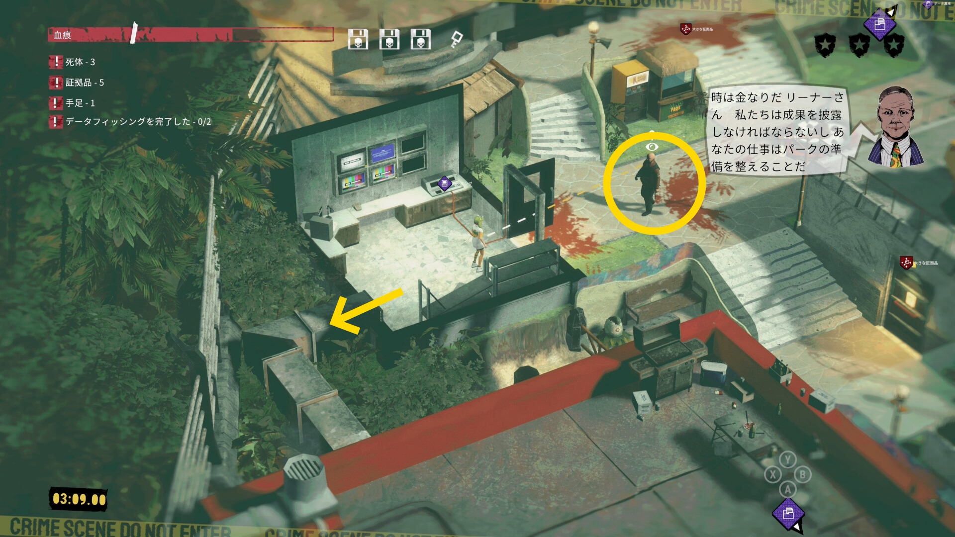 - これに加え、警備員への体当たりを多用してダウンさせている間に移動したり、血痕を片付けたりして時短する(銃を装備しているときは体当たりが無効になるので注意。ただし、隠れ場所から飛び出してダウンさせることはできる)
