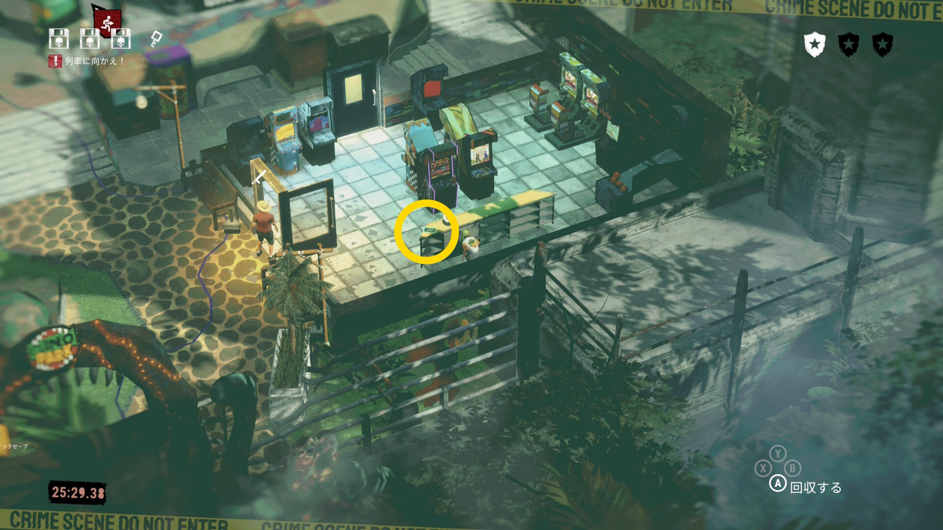 - 下に戻って証拠品を回収し、土産屋内の警備員が左に戻っていくときにドアを開けて侵入(当サイトではラプトルのキャップを回収して衣装を交換する)