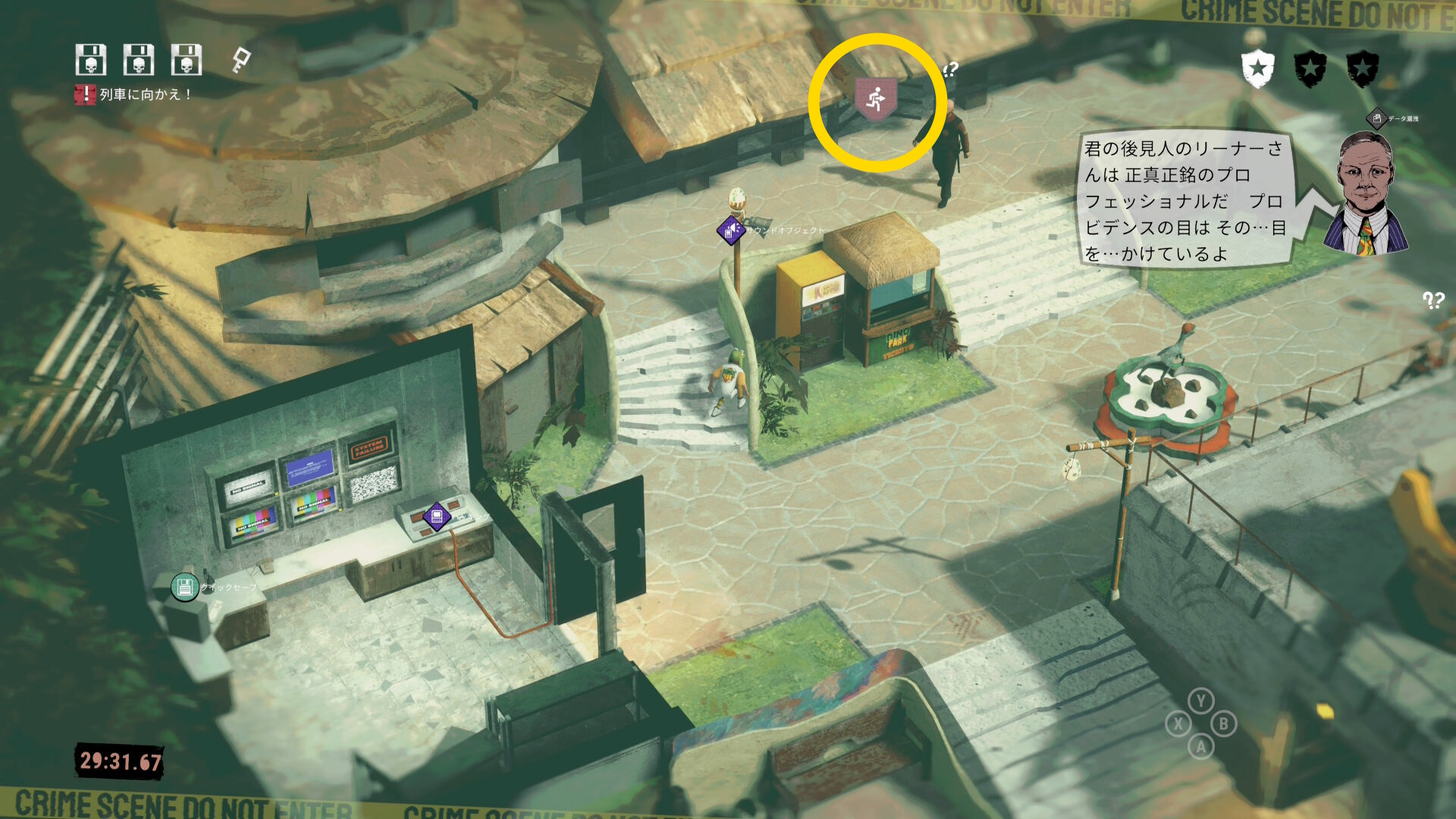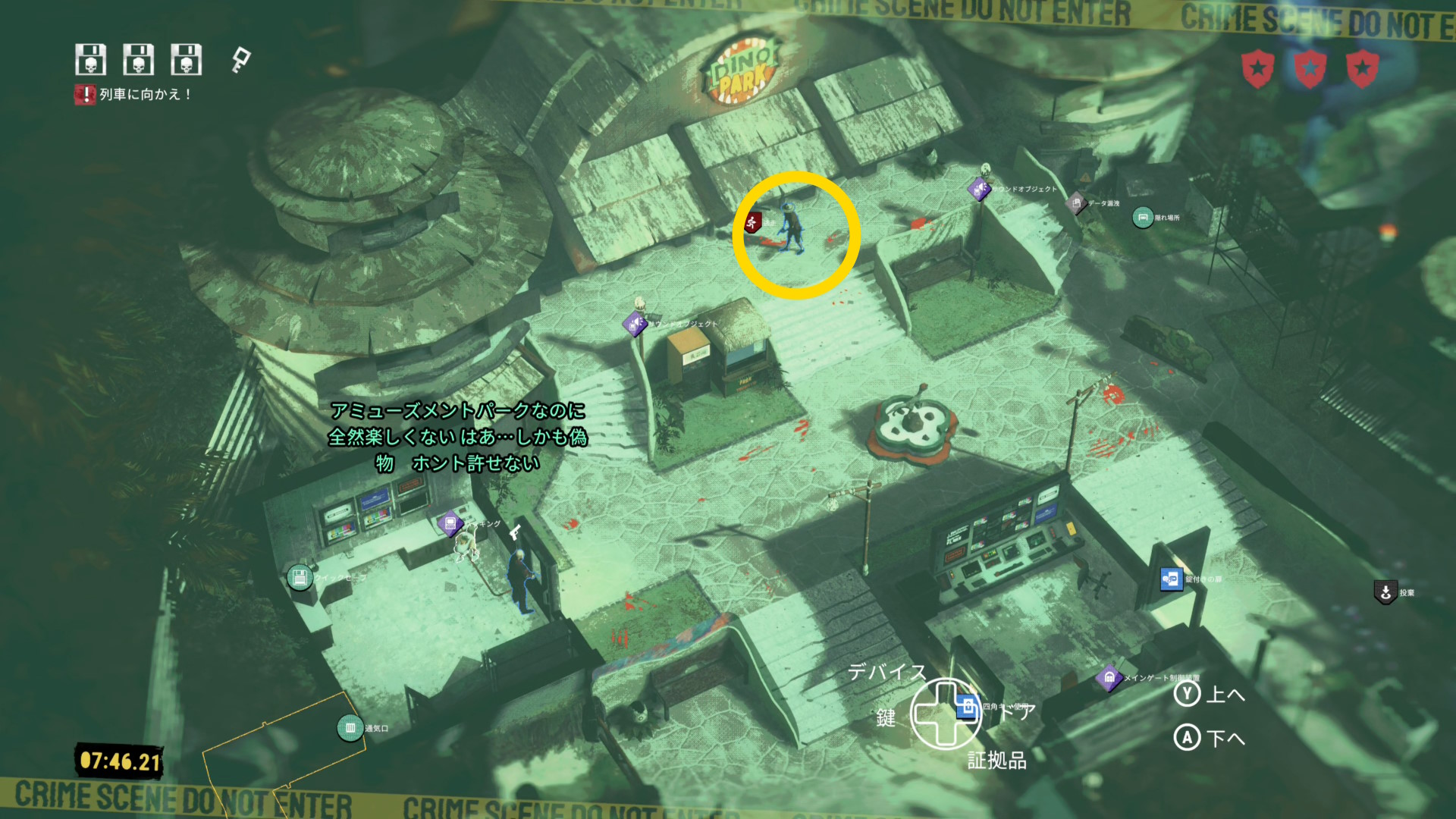 - 列車乗り場前の大きな証拠品、右下の死体を片付けるが、ここを巡回する警備員がわりとウザいので体当たりでダウンさせたり、隠れ場所から飛び出してダウンさせたりし、その隙にいろいろと片付けよう