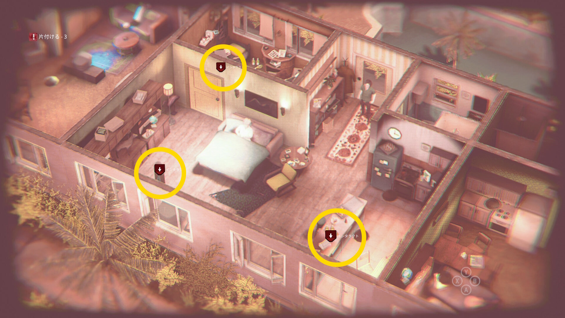 - 開始したら、家の中に表示された3箇所を掃除する