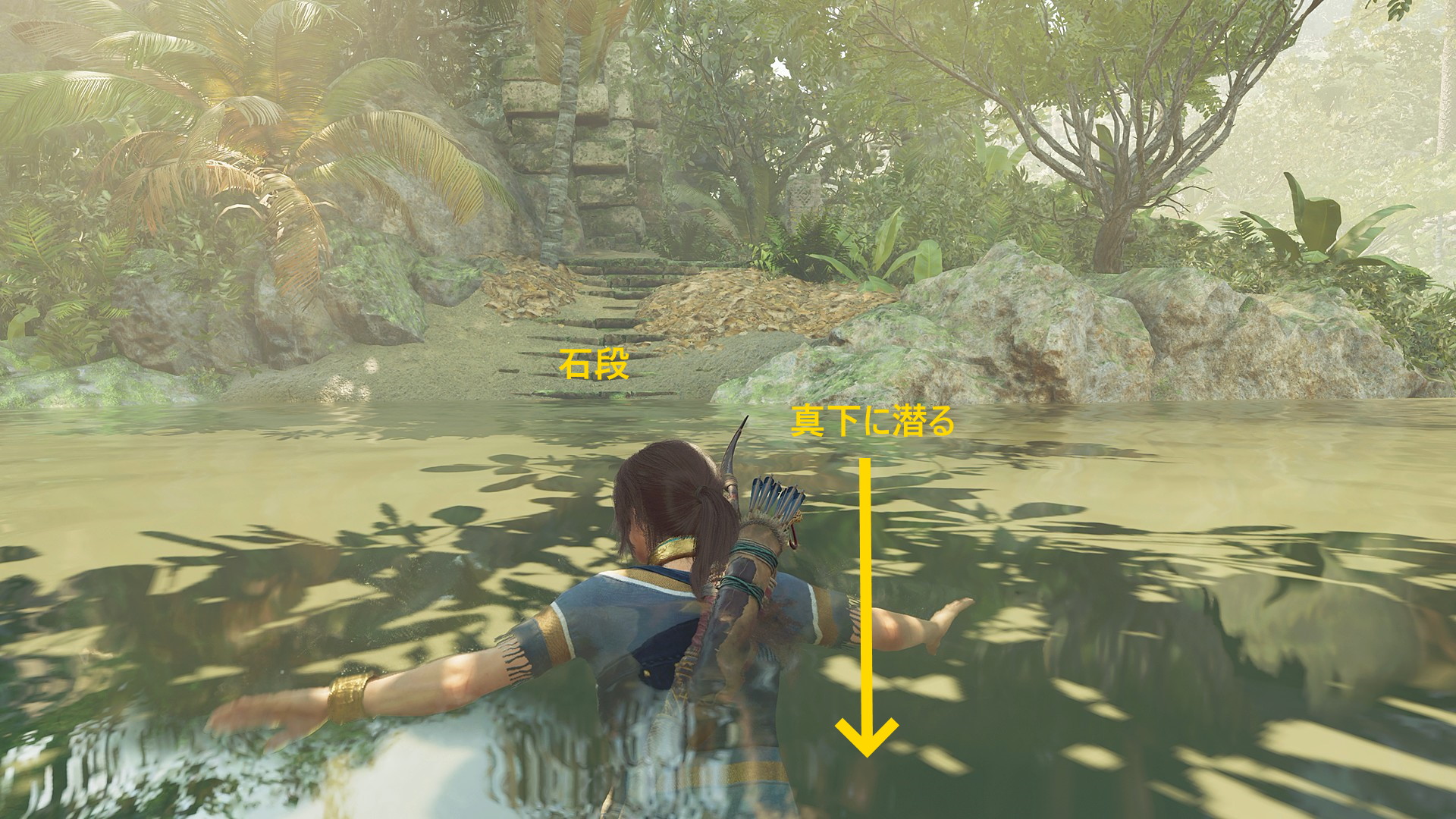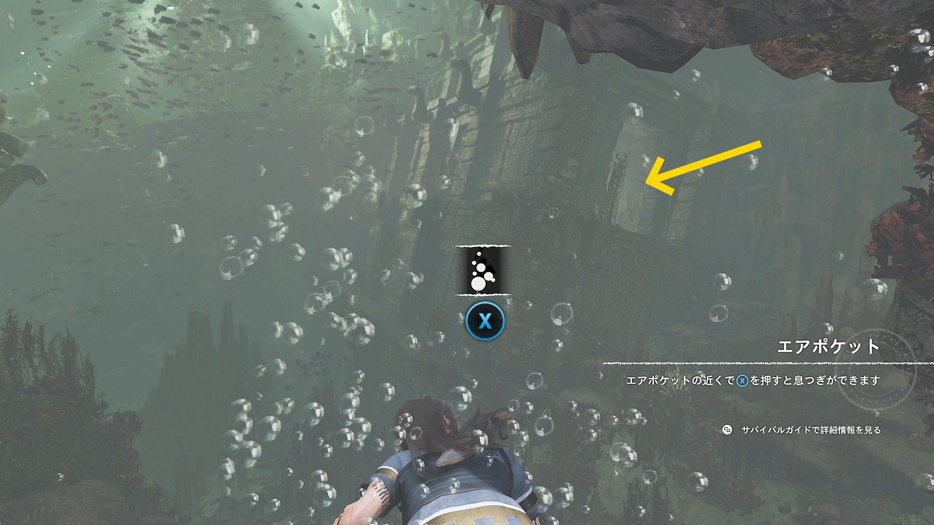 - 最初のエアポケットで酸素補給したら、右前方奥に見える遺跡に入り、道なりに泳いで上階へ
