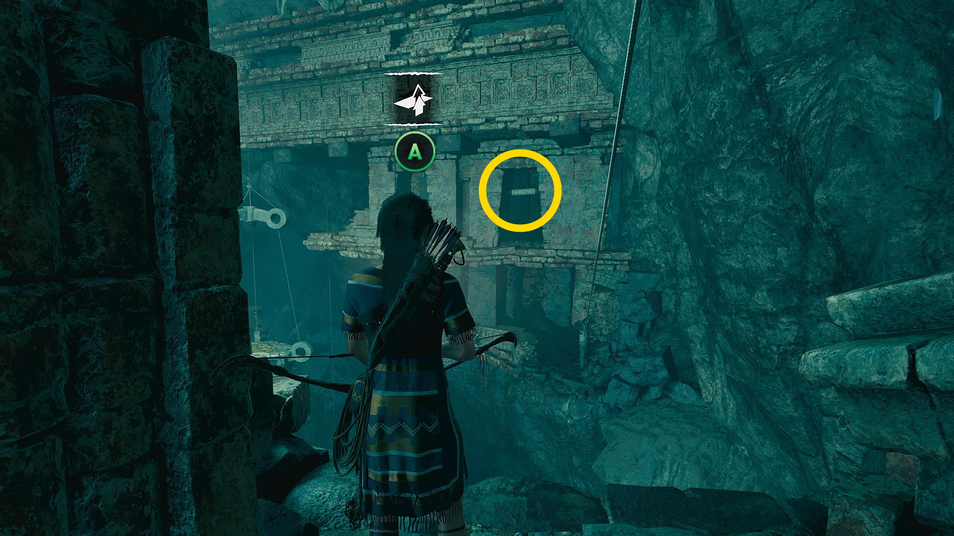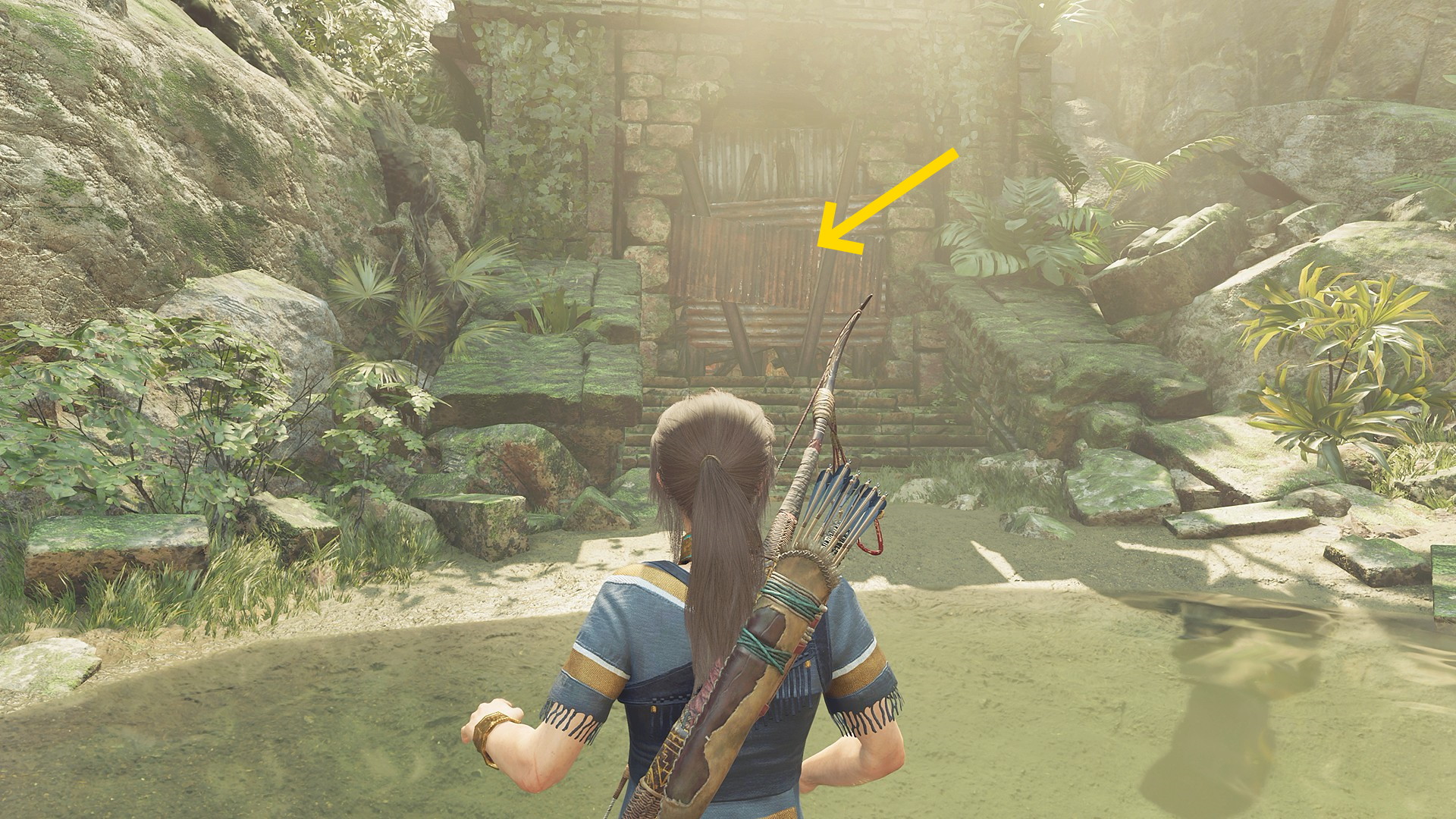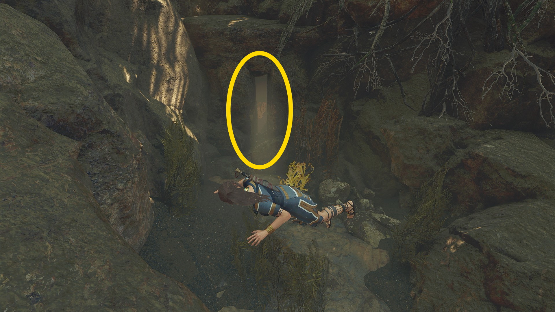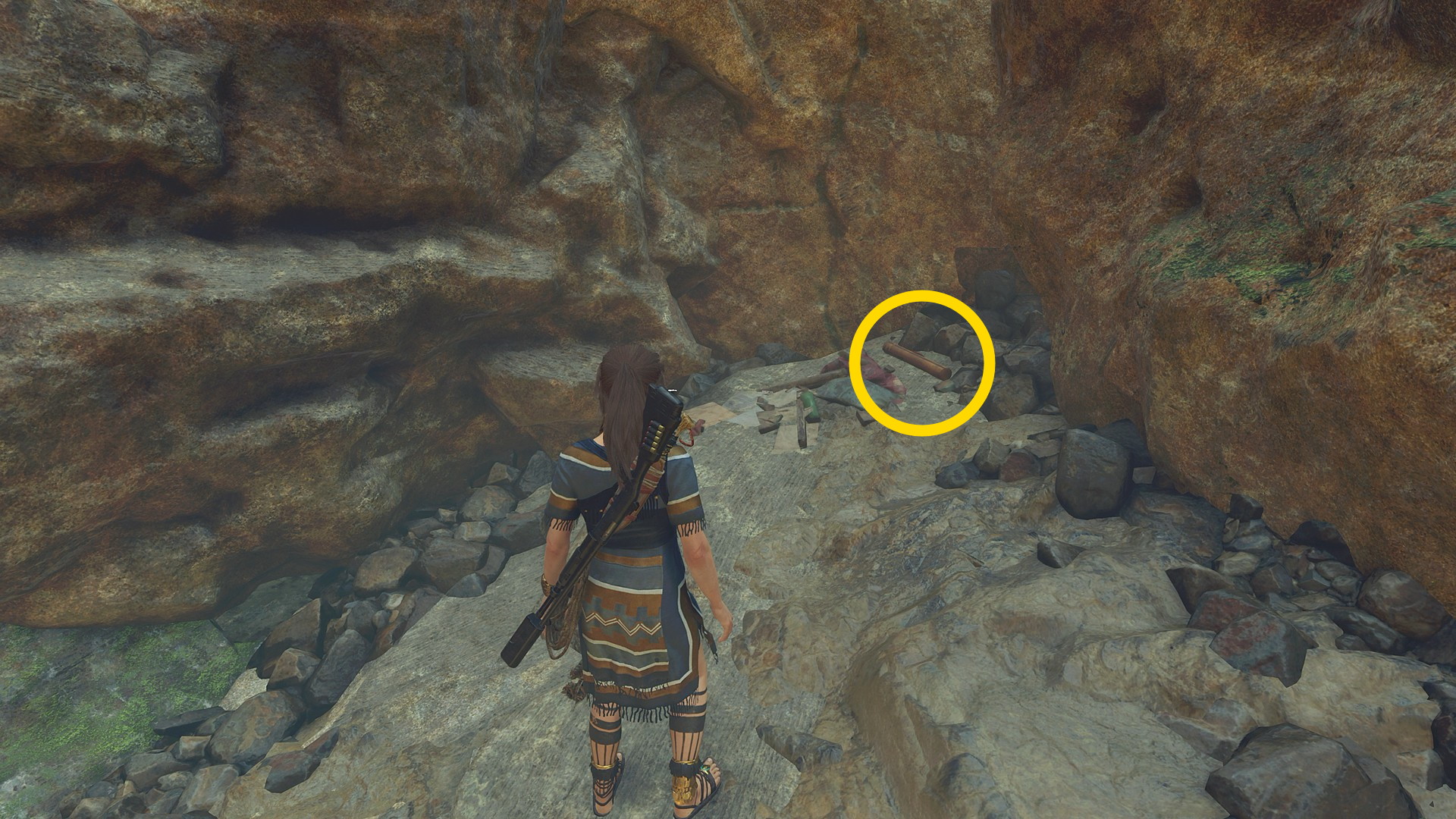 - ララがフォーカスする洞穴に入ると地面に守護者の弓が置いてあるので調べるとカットシーン