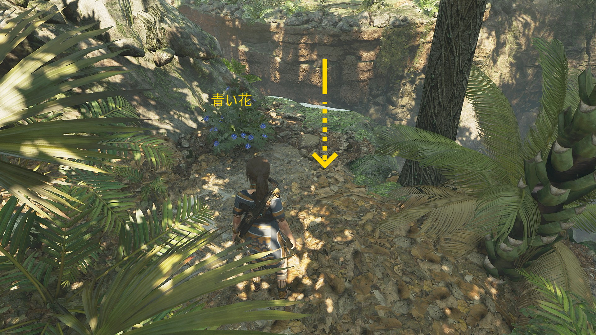 - その少し先、青い花が咲くところから崖のへりに掴まって、下におりていける