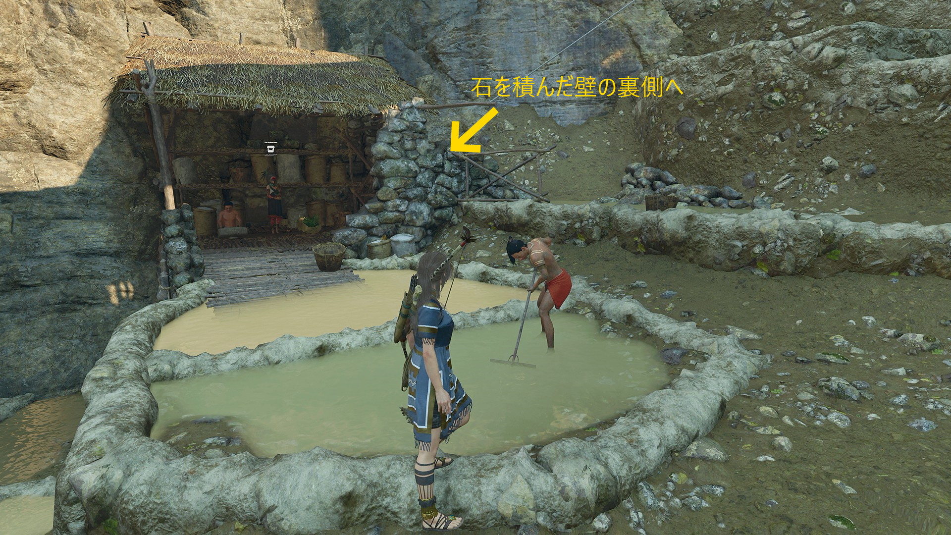 - 隠れ家を出て階段を下りたら、右に U ターンするように進むと段々畑のような構造の塩田エリア