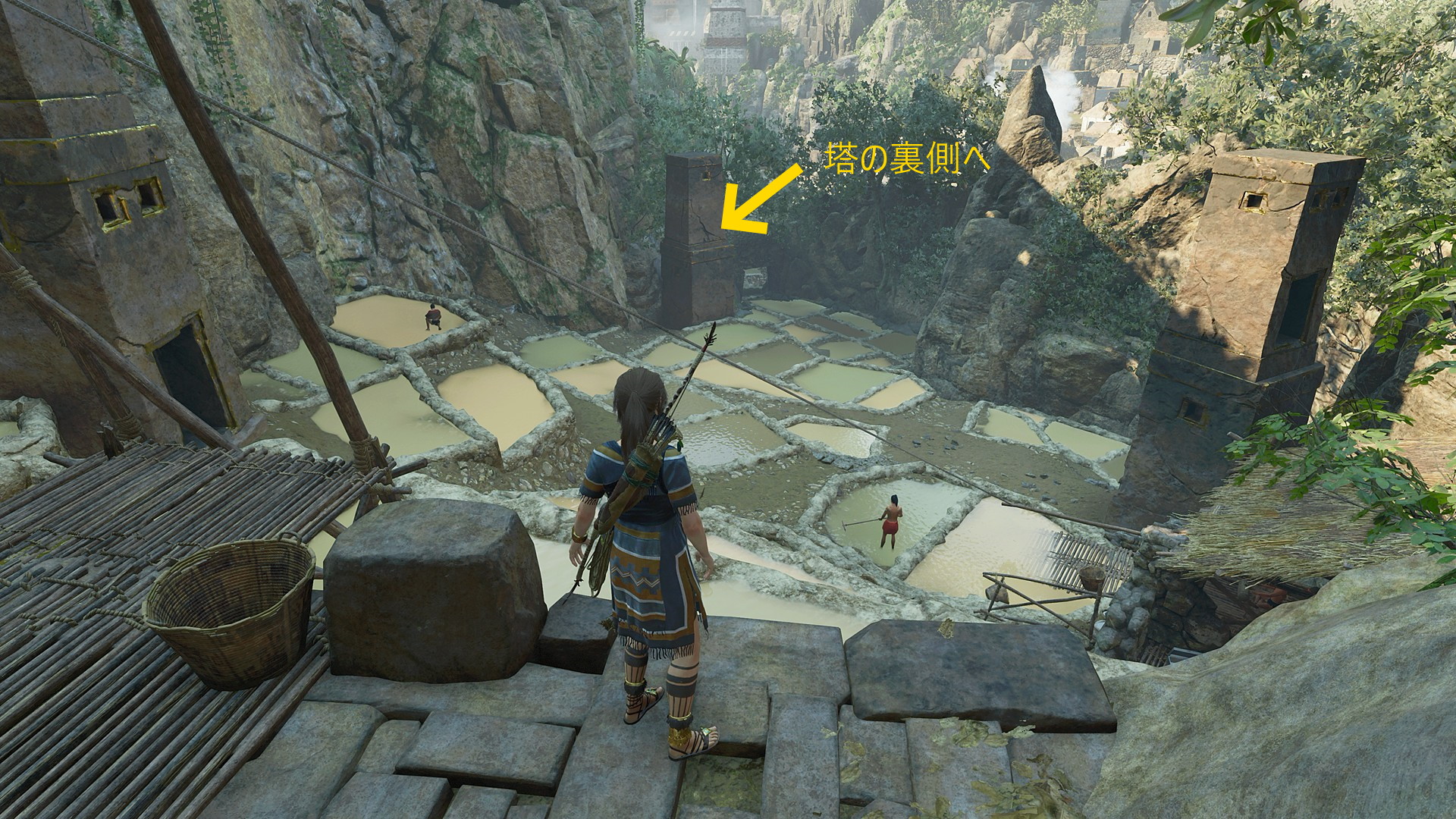 - トーテムを背にして左下に塔が見える