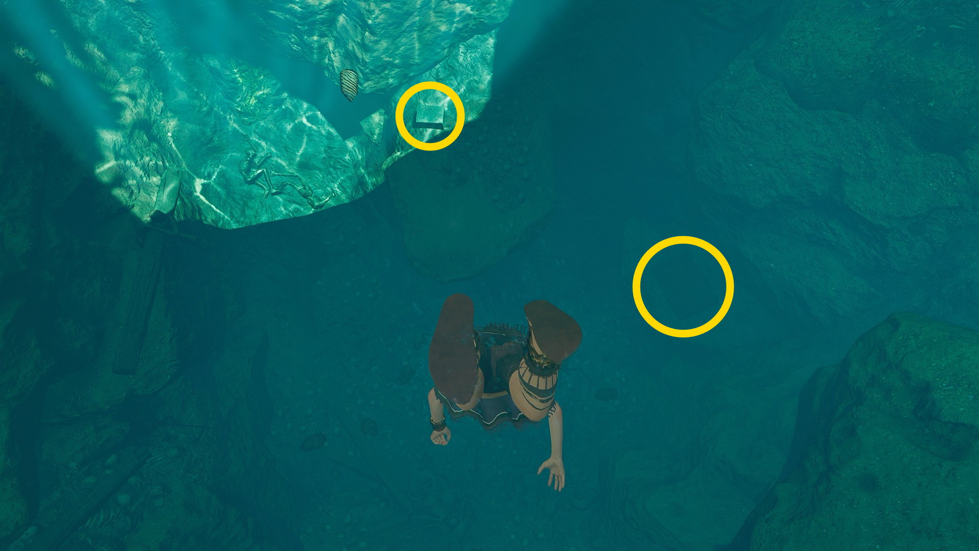 - 左の壁に沿って泳ぐとウツボがいるが、水草に隠れればスルーできる(見つかった場合は X 長押しでキル)