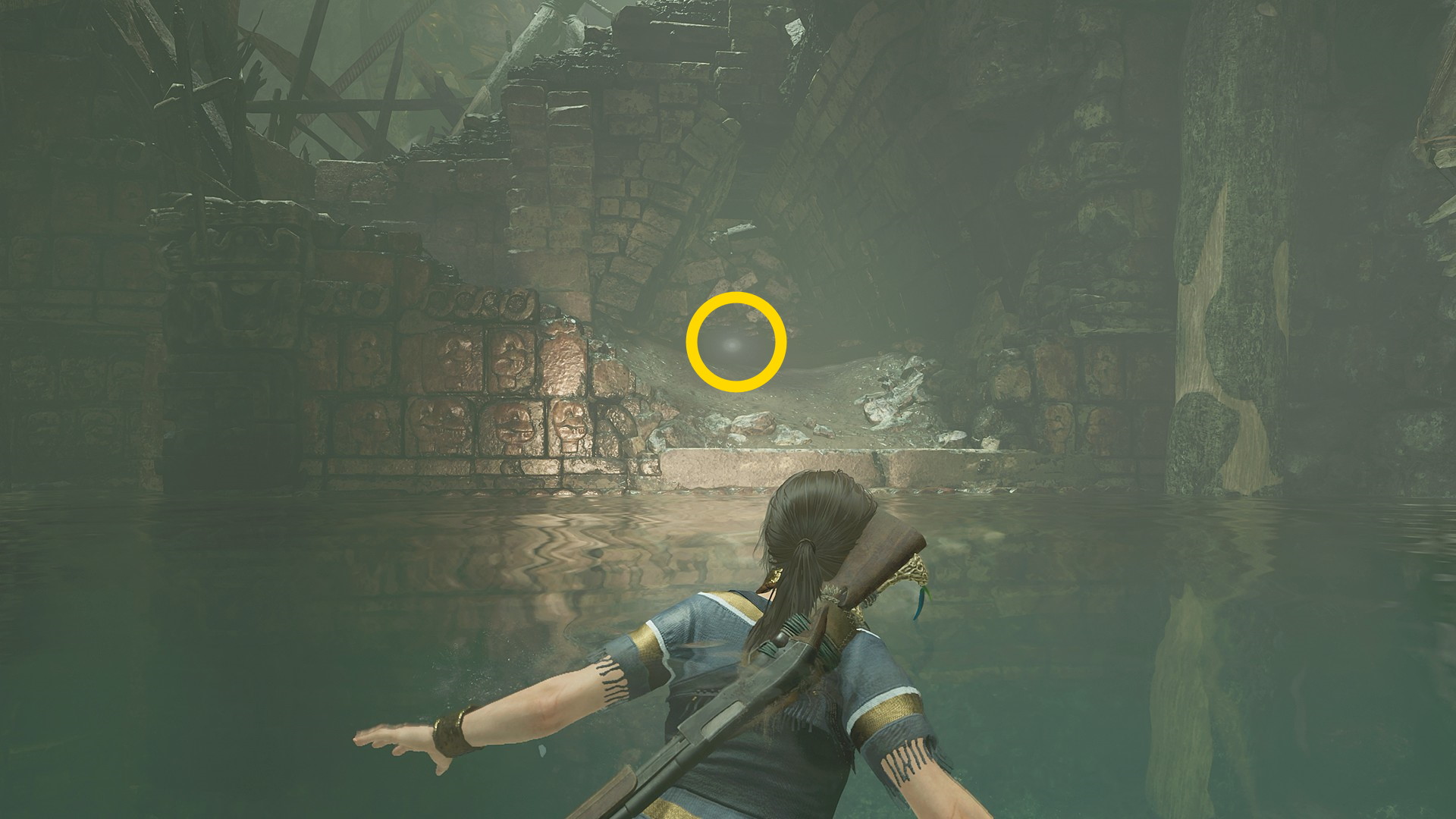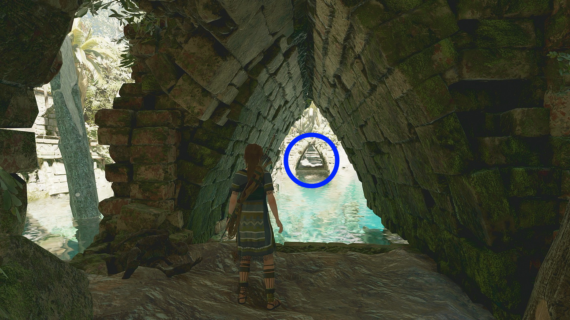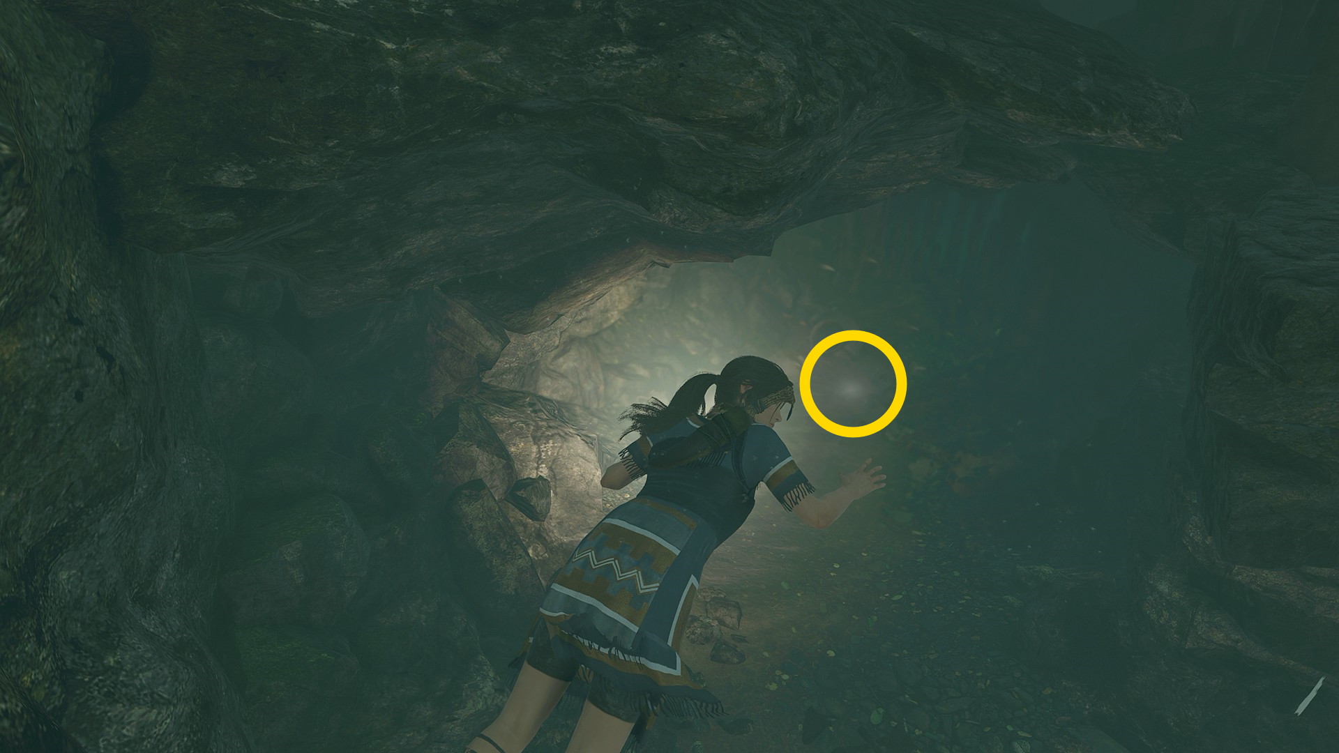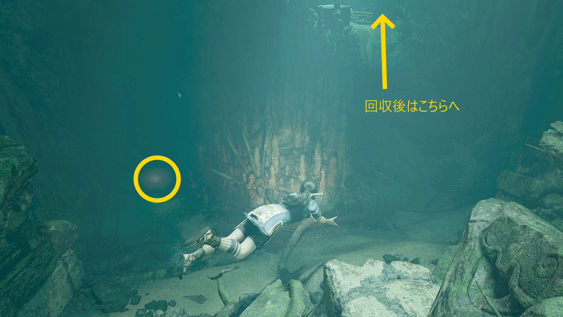 - 眼下の池に飛び込み、中央の真下に続く水中洞窟を進むとエアポケットのところに出てくる