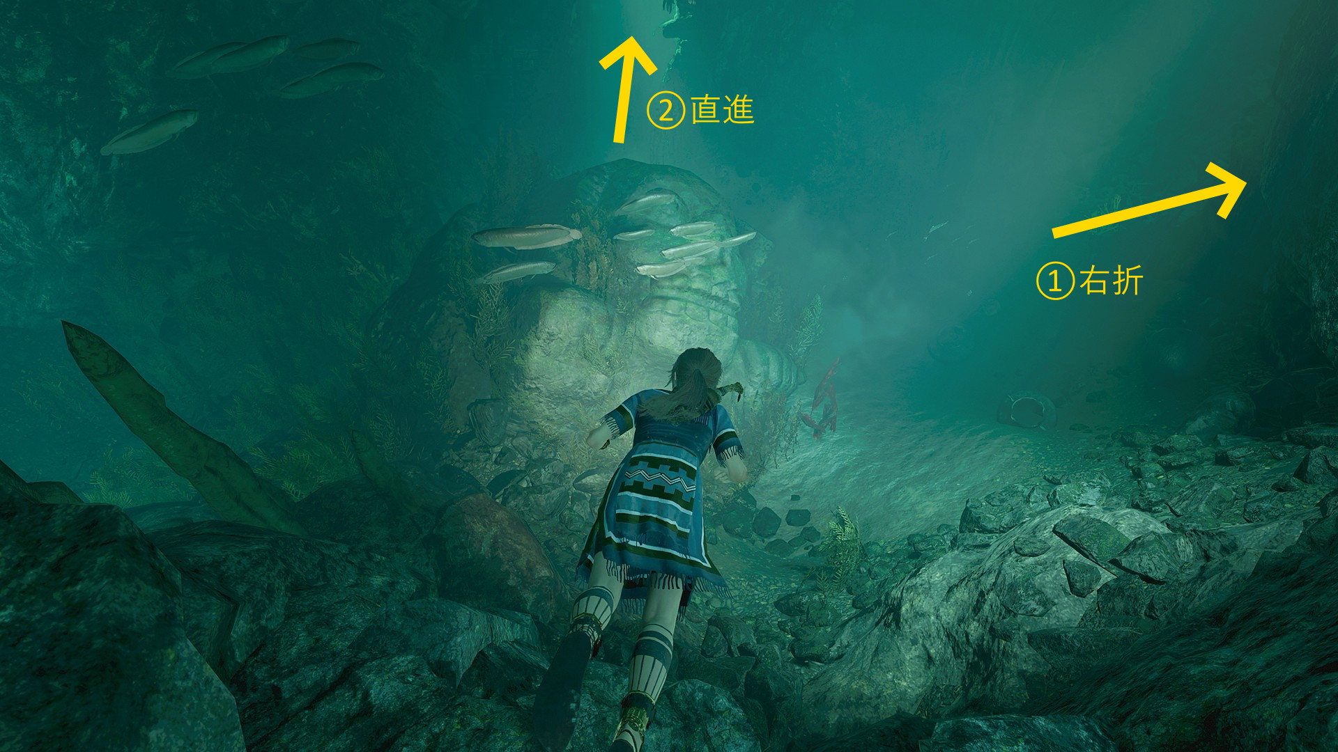 - 水中の丁字路を右へ(左はあとで来ることになる)