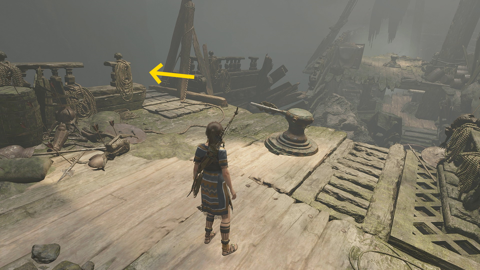- 左手の岩から、いかだにジャンプし、ガレオン船の側面を登っていく