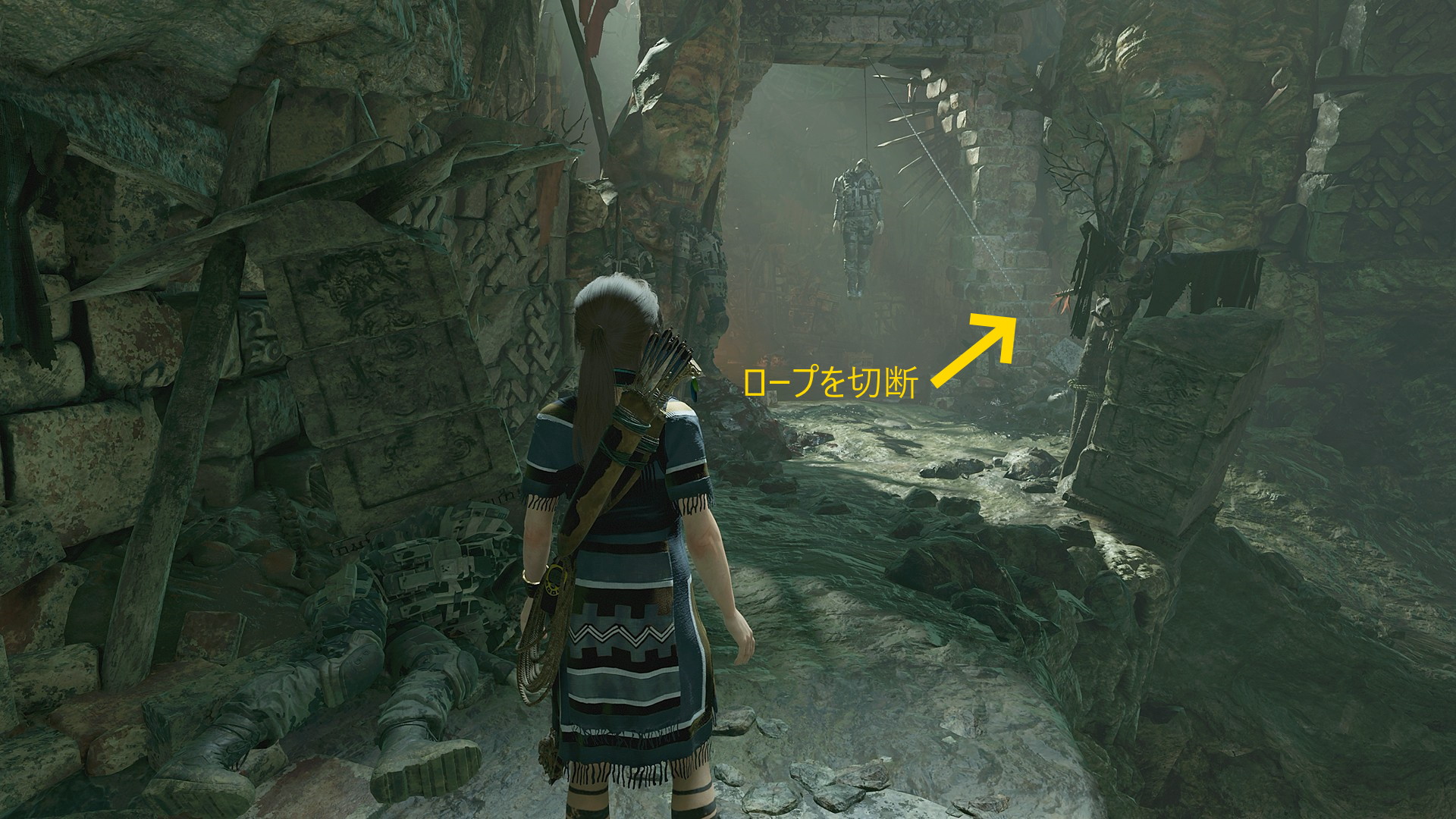 - 壁を登ると吊るされたトリニティ兵士の死体にフォーカスする