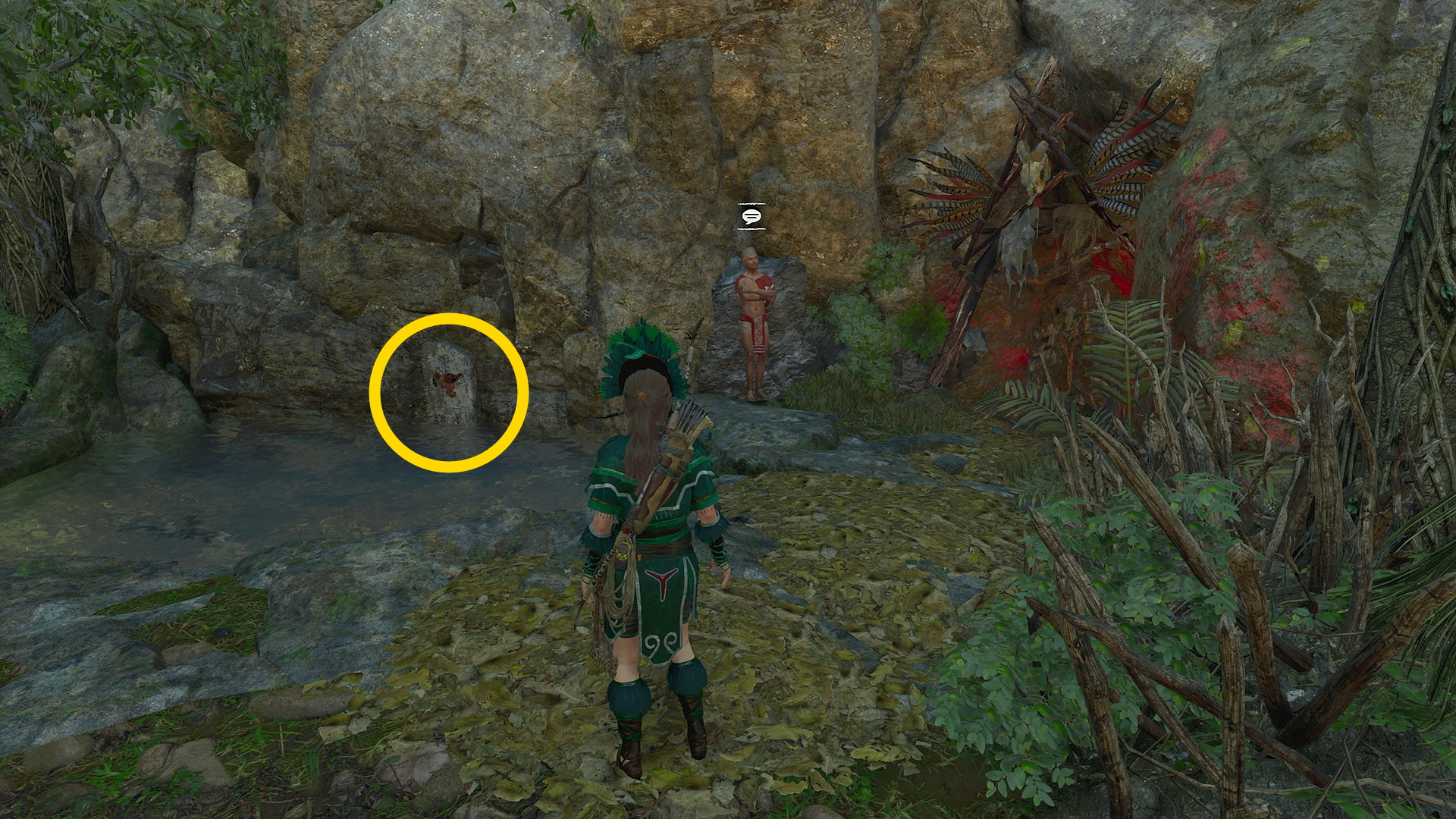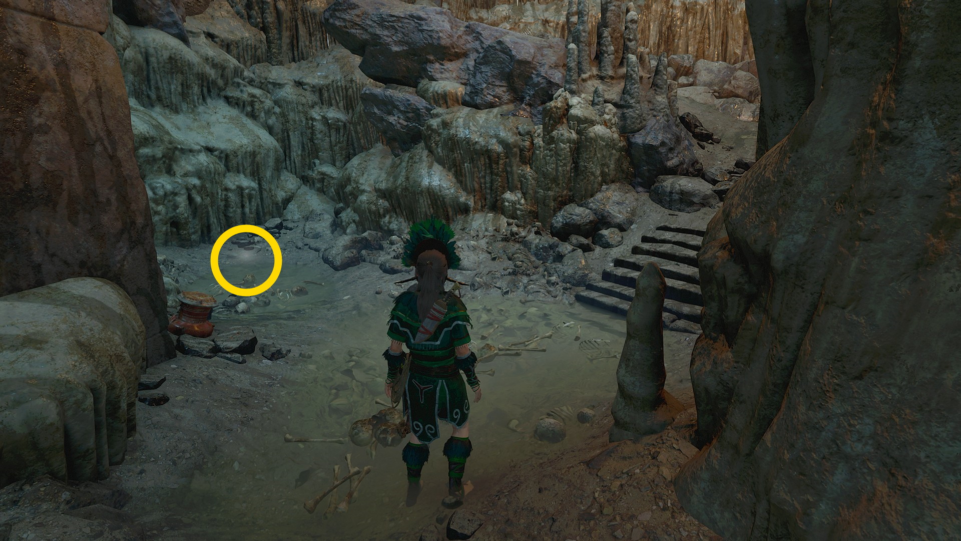 - 右後ろの壁を登り、洞窟に入るとヤークシルの声とともに(声だけ。出現しない)右側に 神々の試練:古代の水路