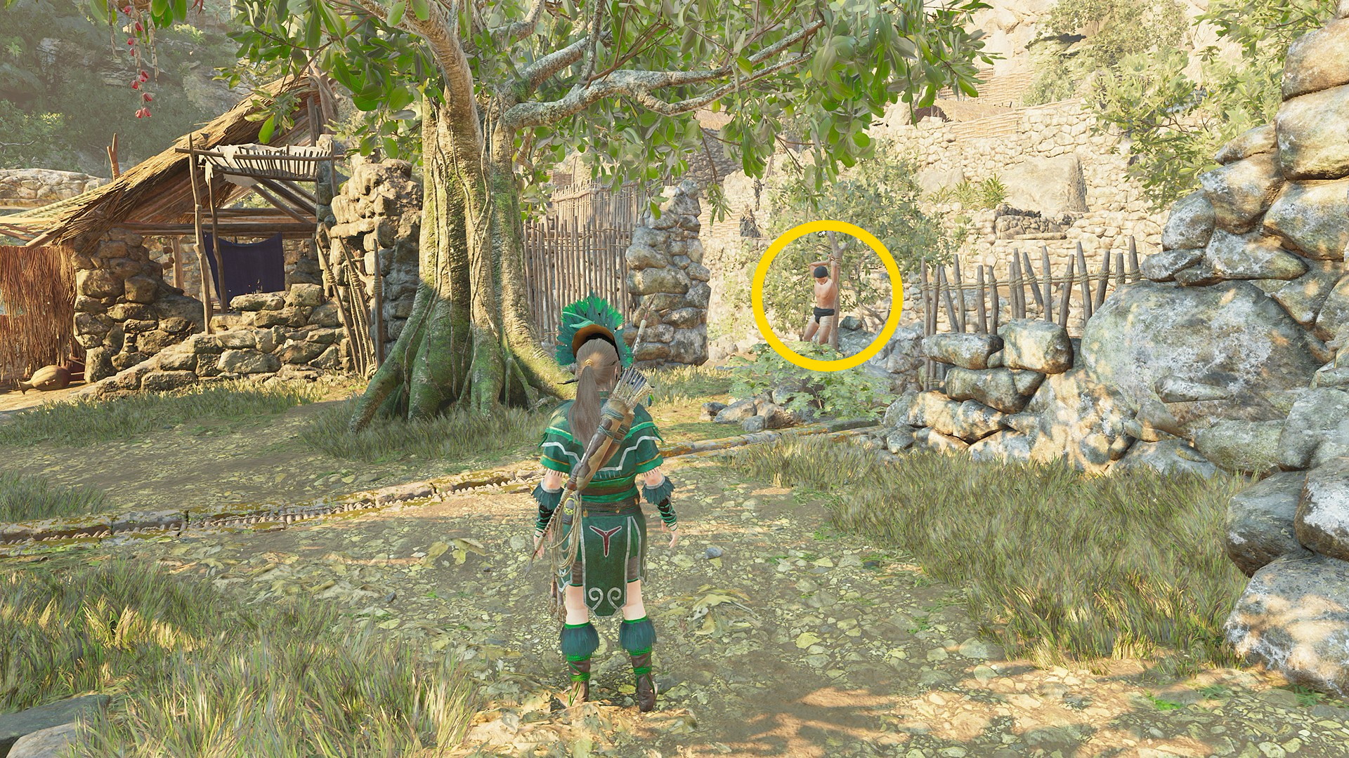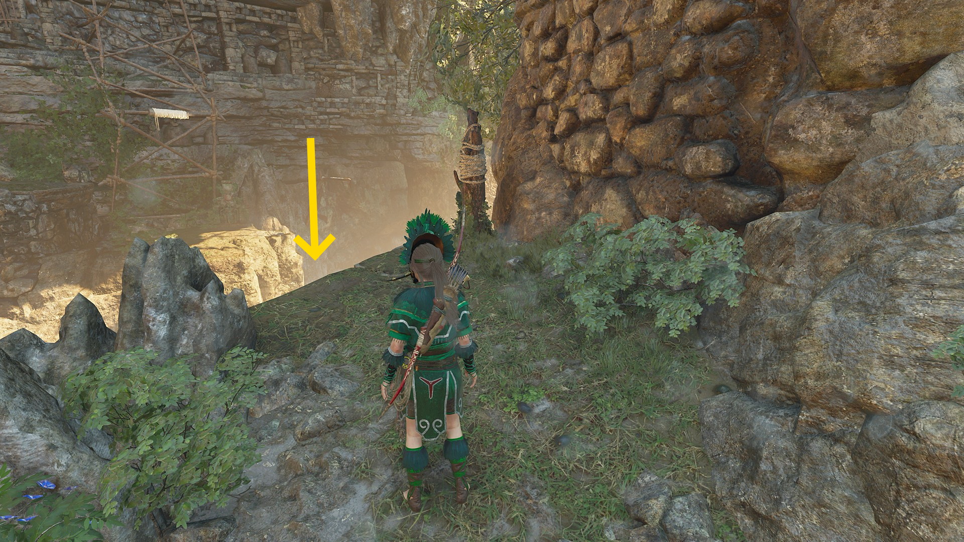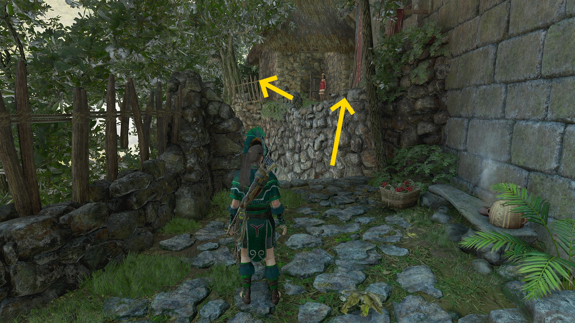 - 階段の右側の壁を登って左に進み、小屋の左脇を進む