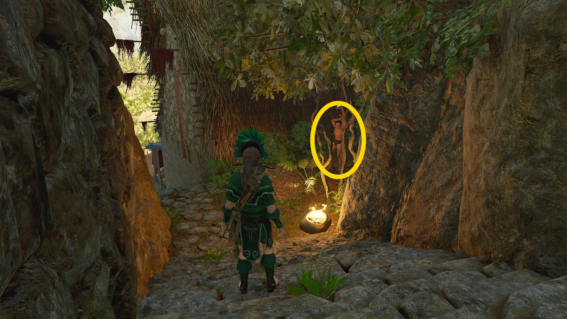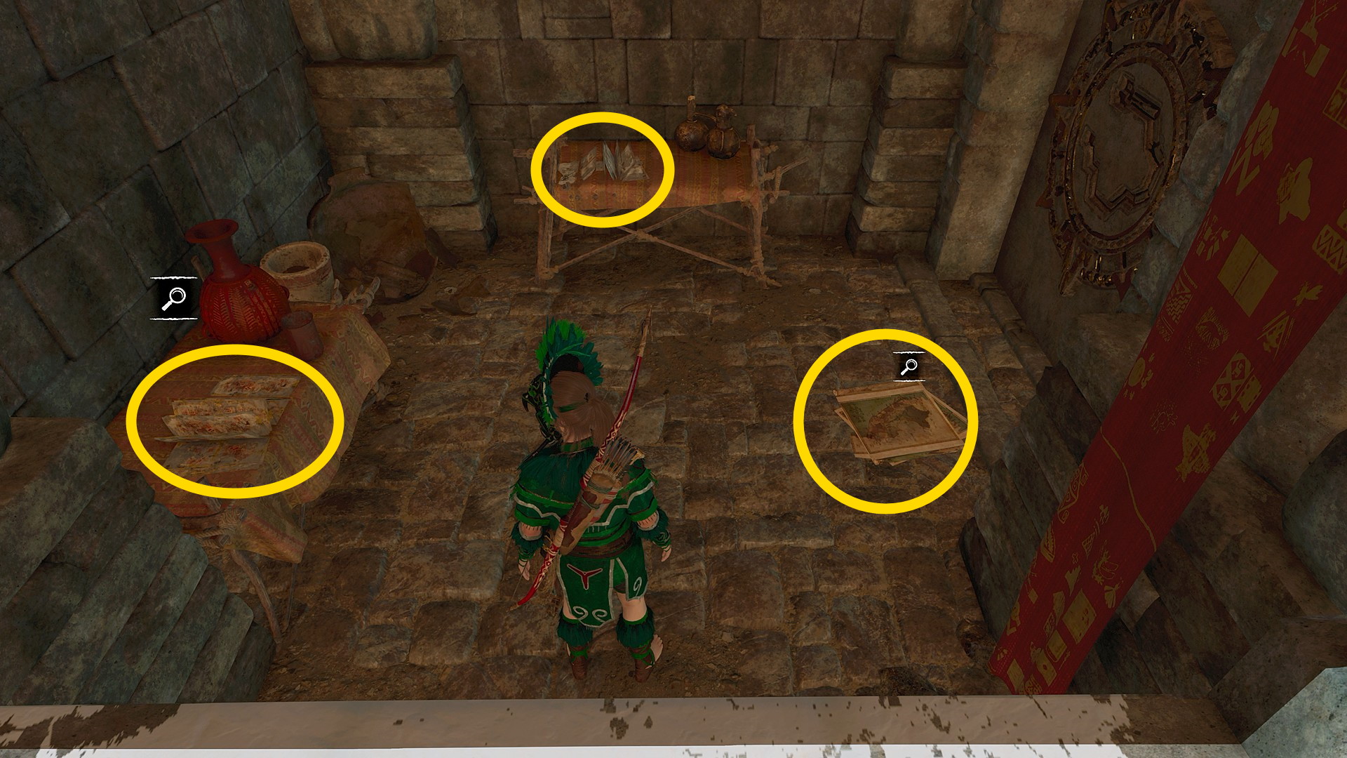- 開始地点や階段を登った通路にはスモークボムが作れるアイテムが置いてあるのでそれを投げてステルスキル、通路に配置されている赤い壺を射ると爆発するのでそれに巻き込む、のように戦うとラクになる。また、弓兵はファイアアロー1発でキルできることも覚えておくとよいでしょう
