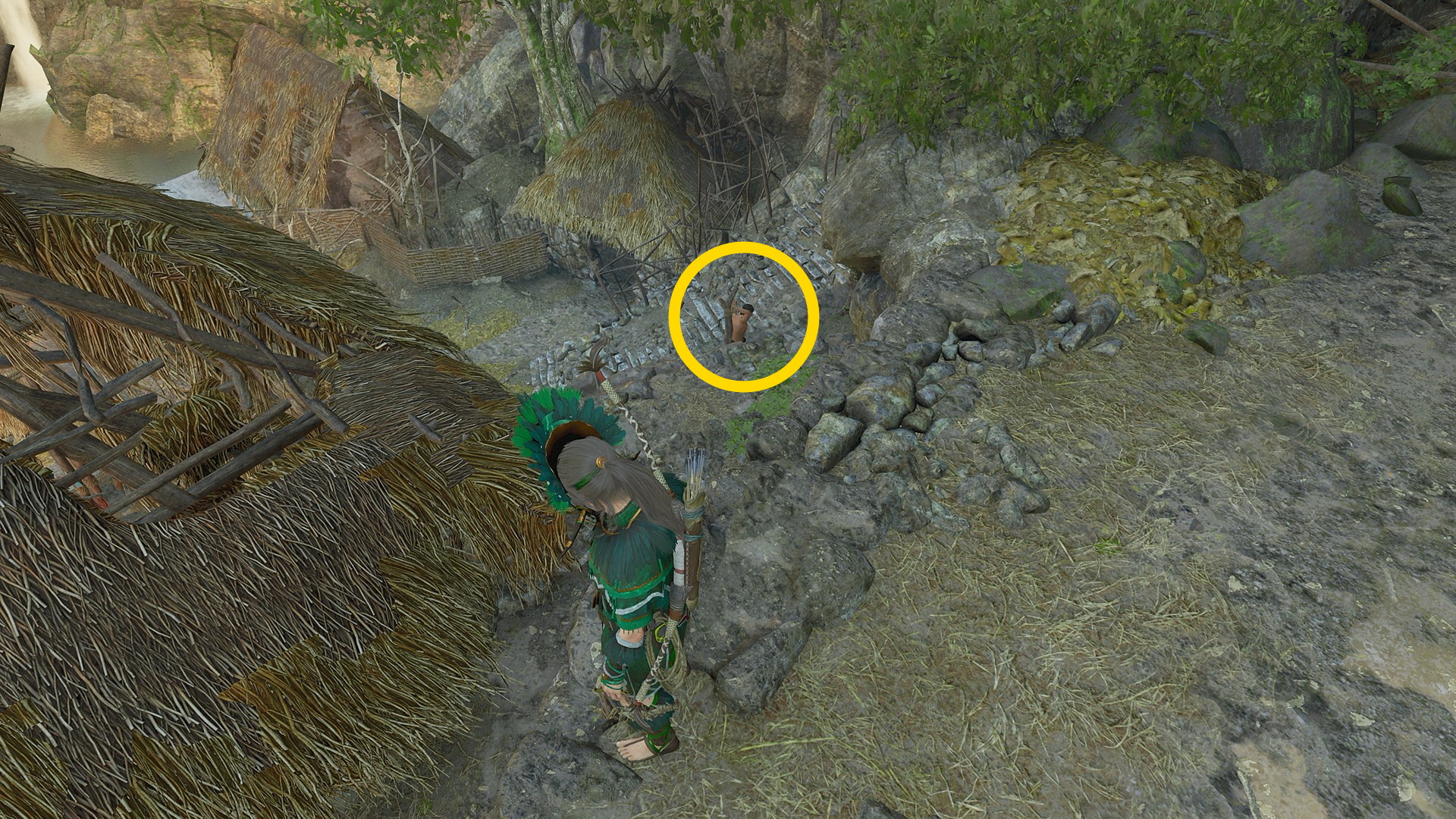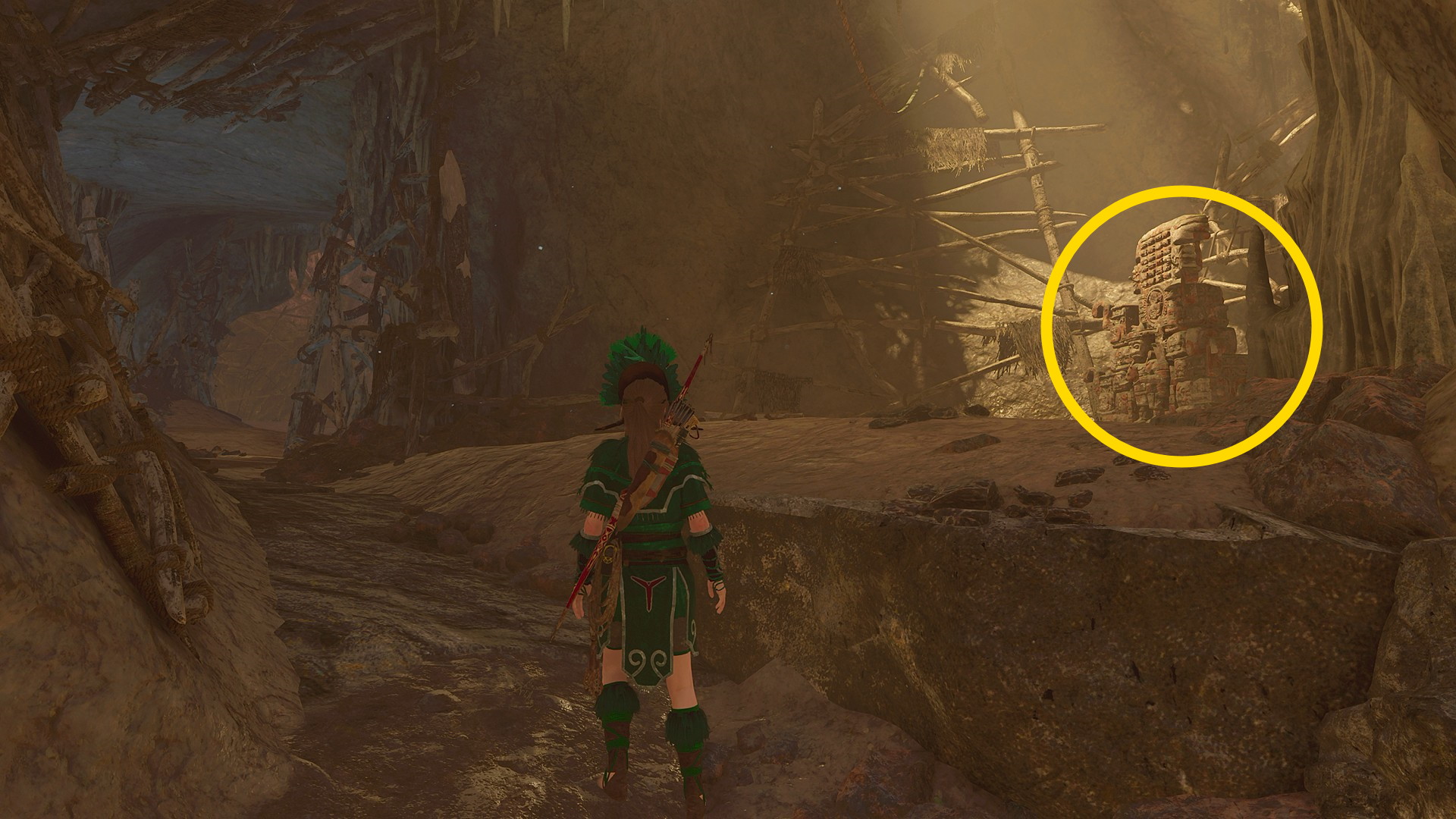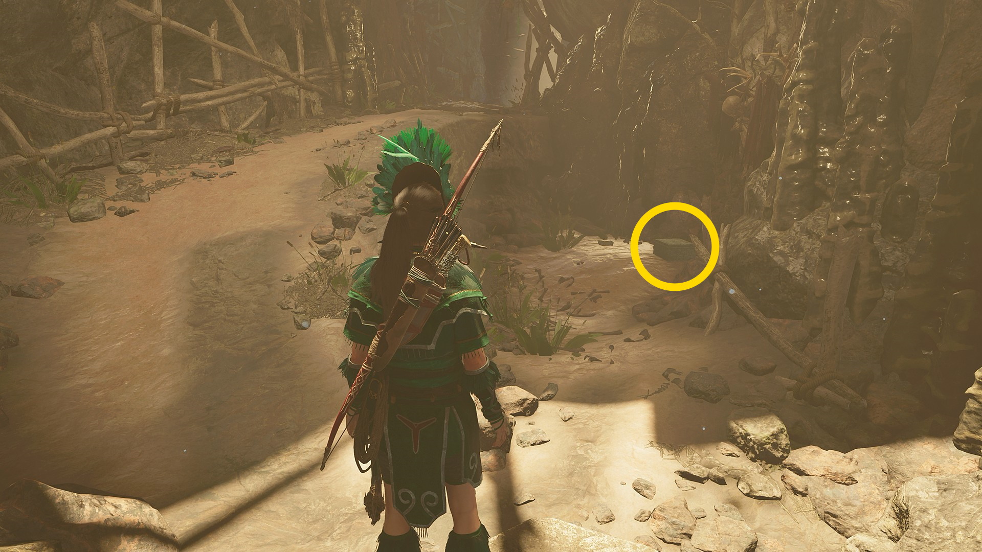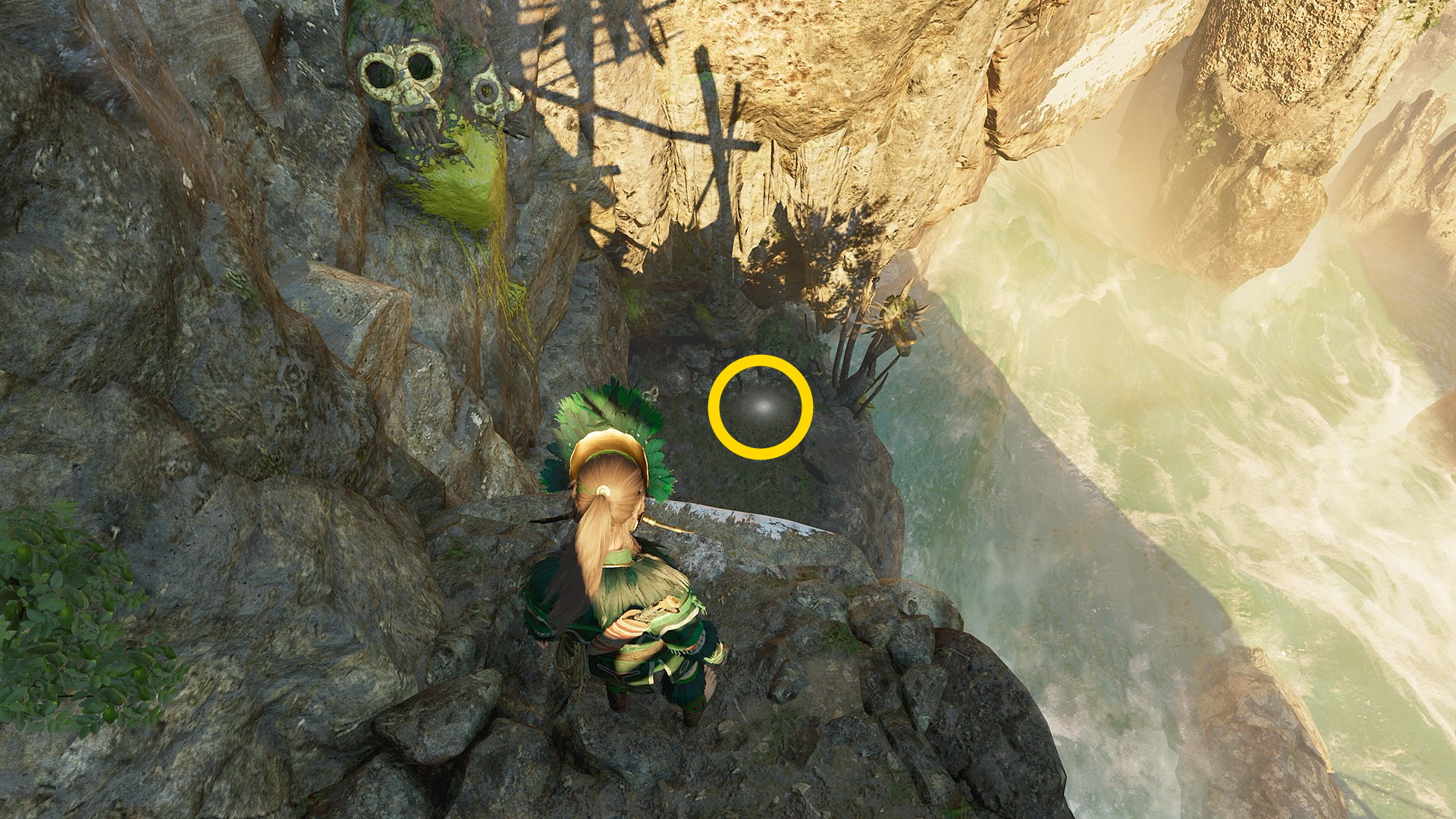 - 後ろを向き、短い橋(右側)から下の窪地を見ると 抵抗組織:ママ・キラの仮面