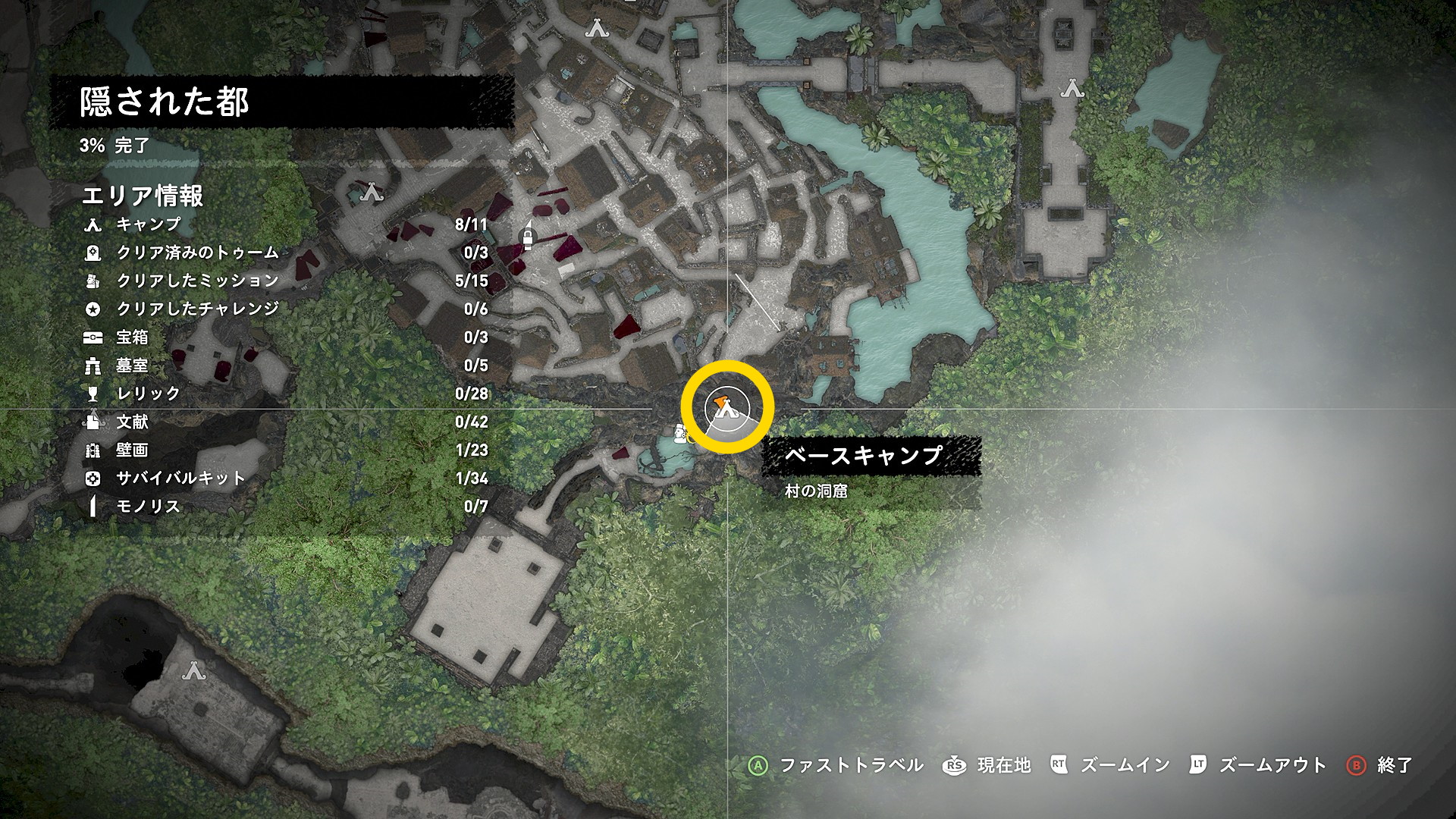 - 最寄りのベースキャンプ(おそらく「廃村」)で装備を変更