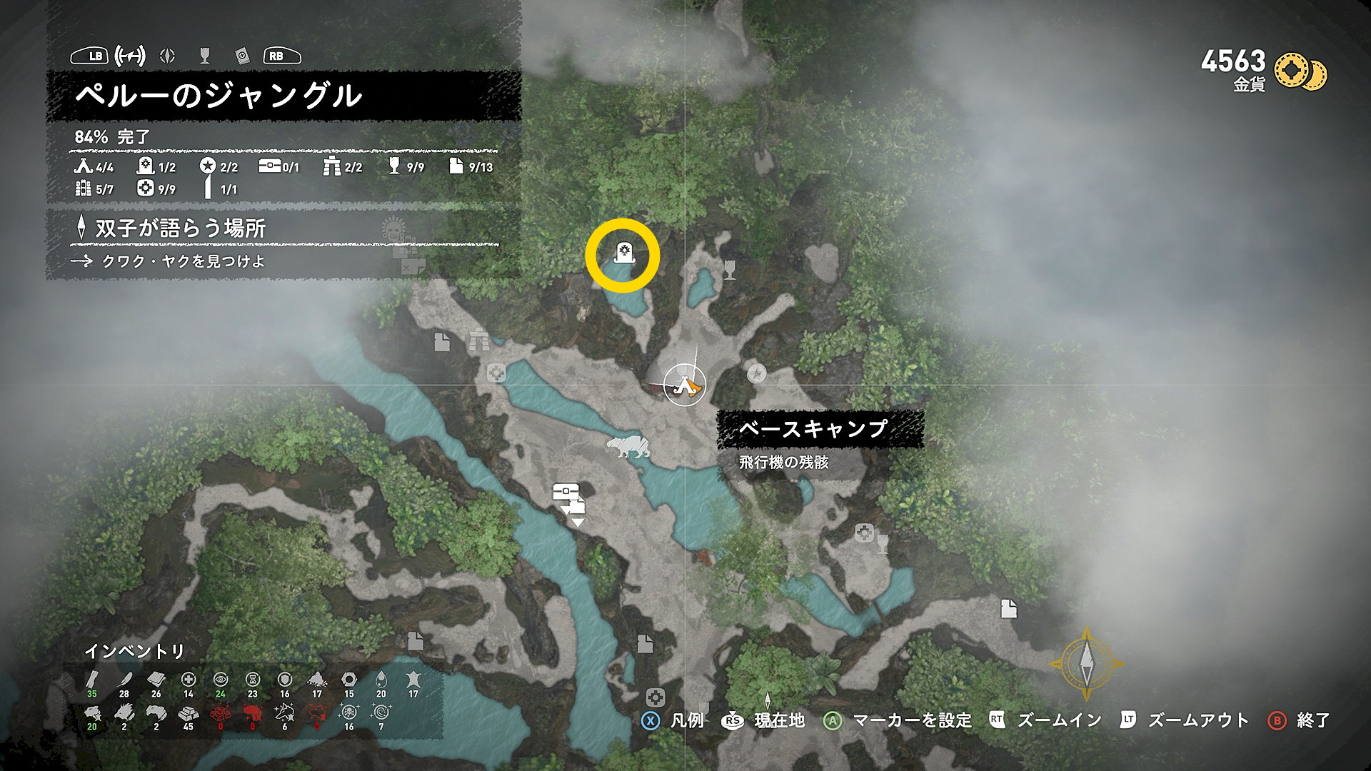 - 「ベースキャンプ:飛行機の残骸」の左下に宝箱と文献が表示されるが、現状回収できないので今はスルー
