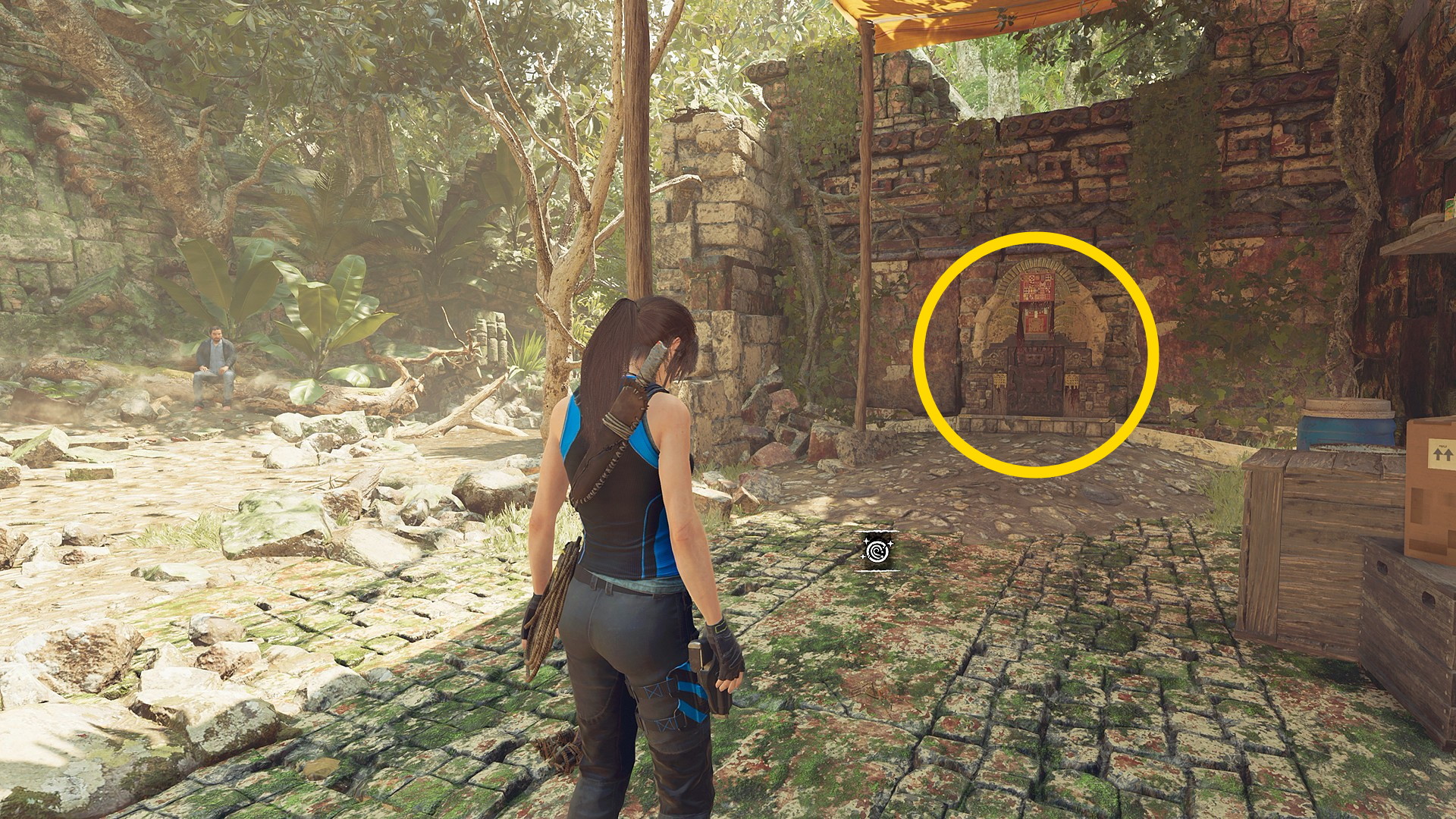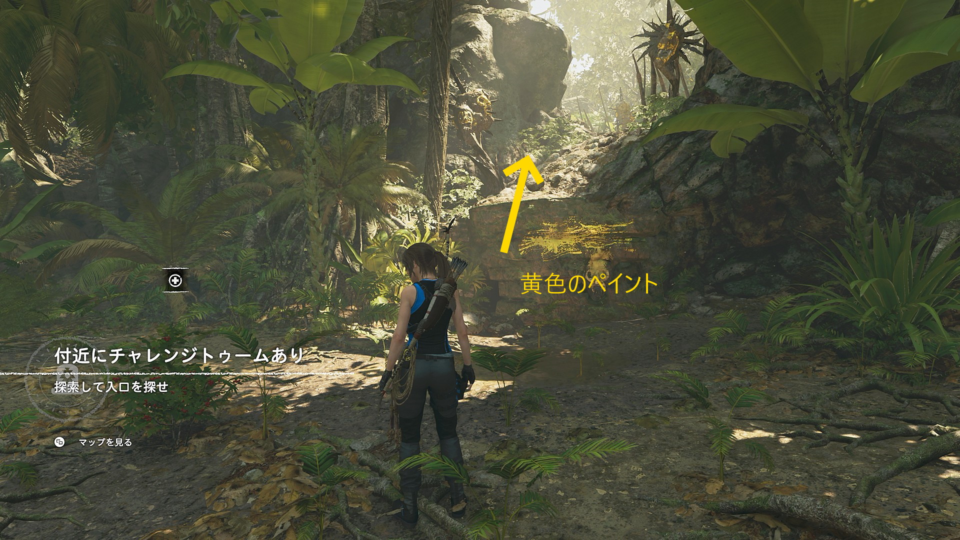 - 遺跡の入口、右側で丸太に座っている男性と会話するとマップにチャレンジトゥームが表示される