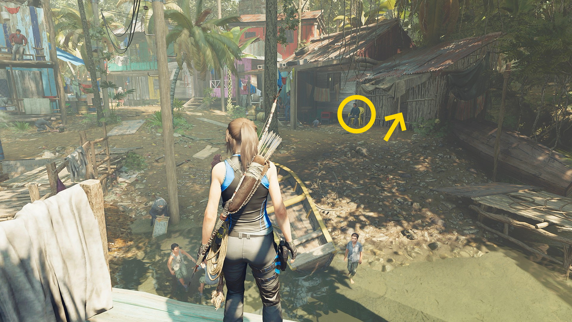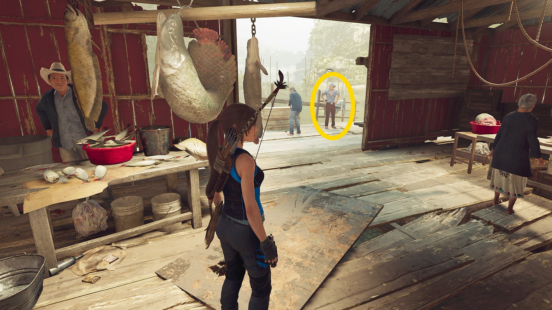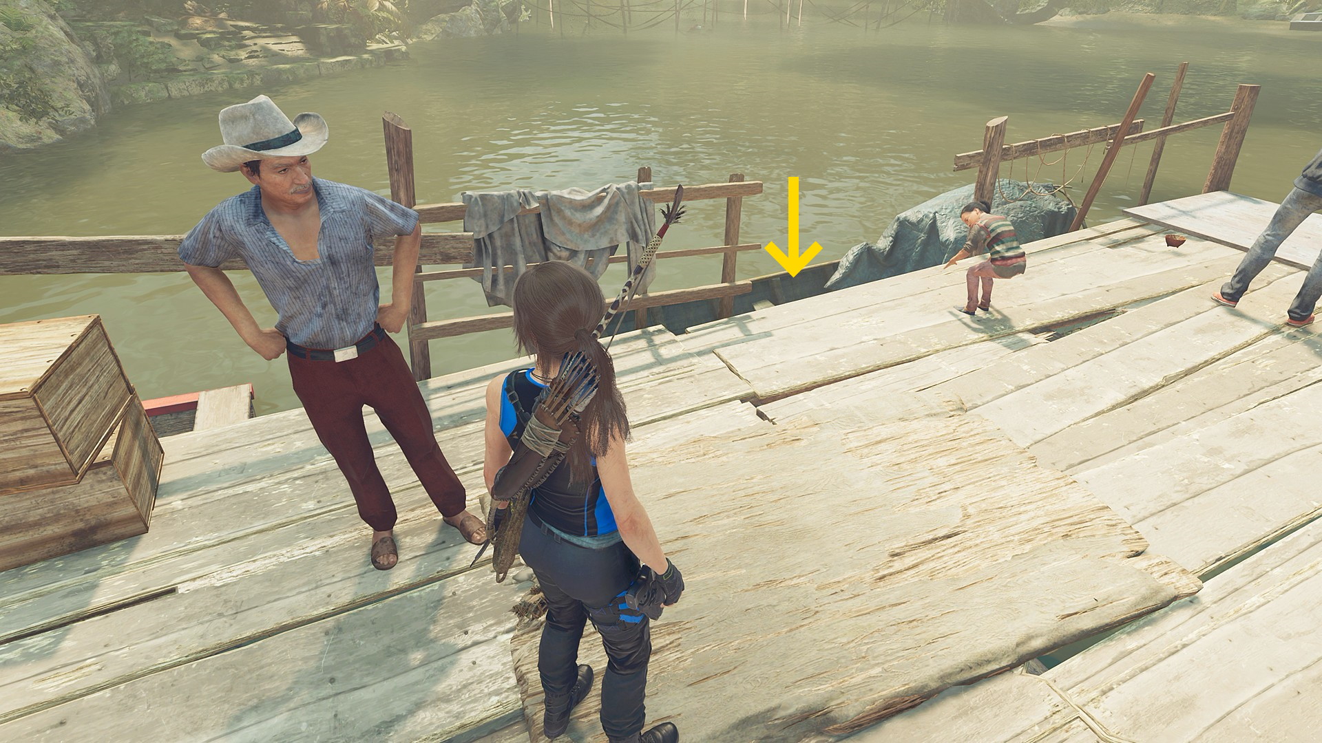 - 少し進むと左手にボートの手入れをしている男性がおり、そこを左折すると奥に桟橋に座る男性がいるので会話