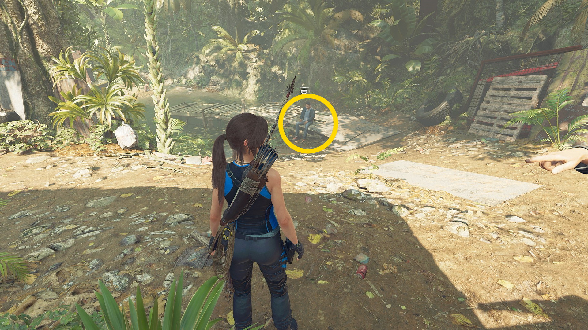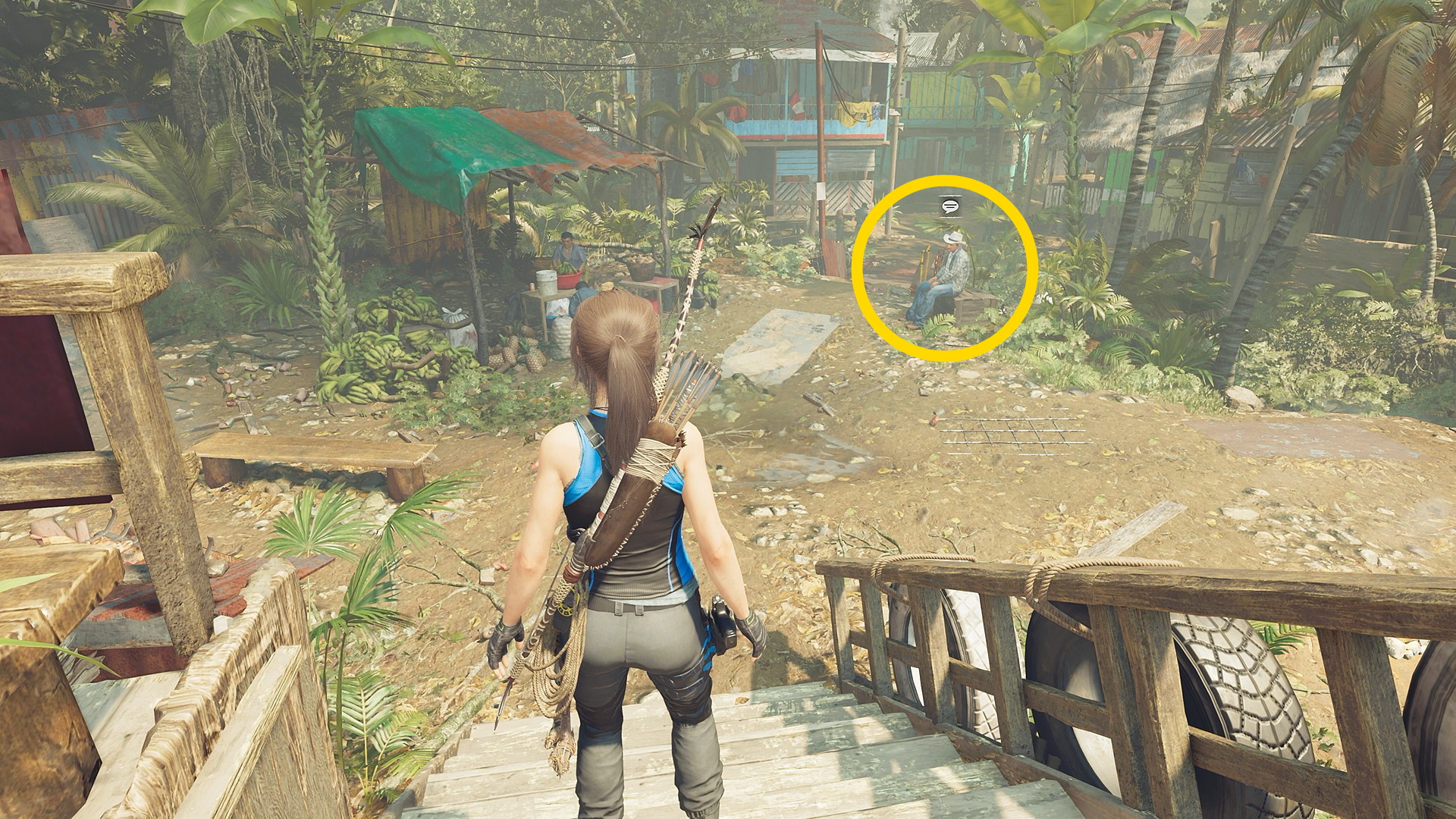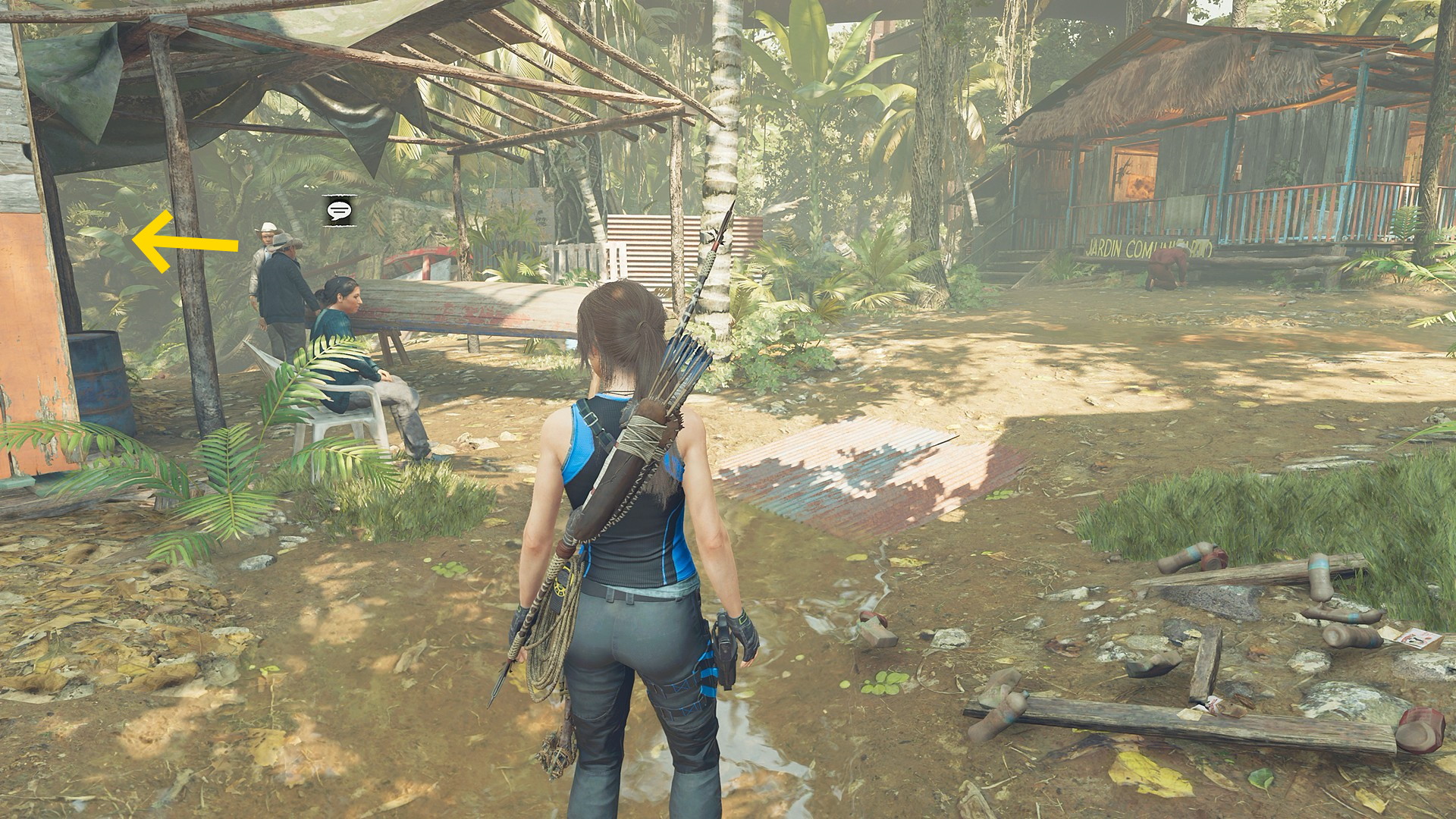 - 少し進むと左手にボートの手入れをしている男性がおり、そこを左折すると奥に桟橋に座る男性がいるので会話