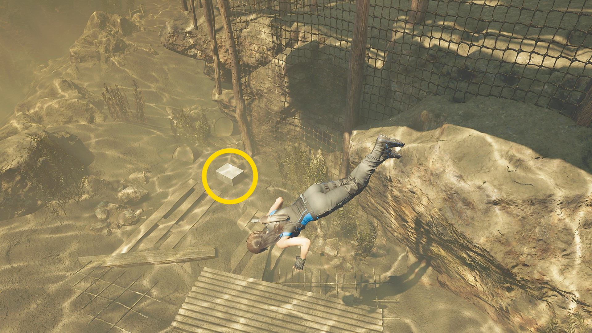 - 水から上がったら左前方へ進み、壁をよじ登る(手前に箱あり)