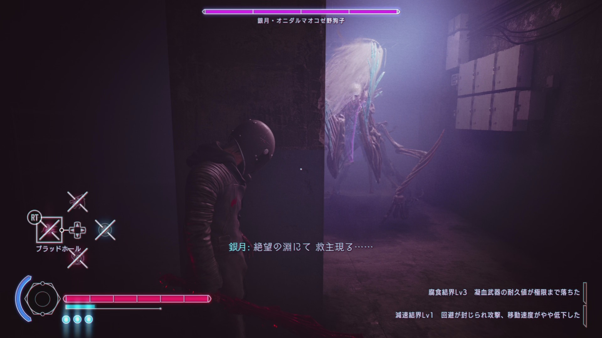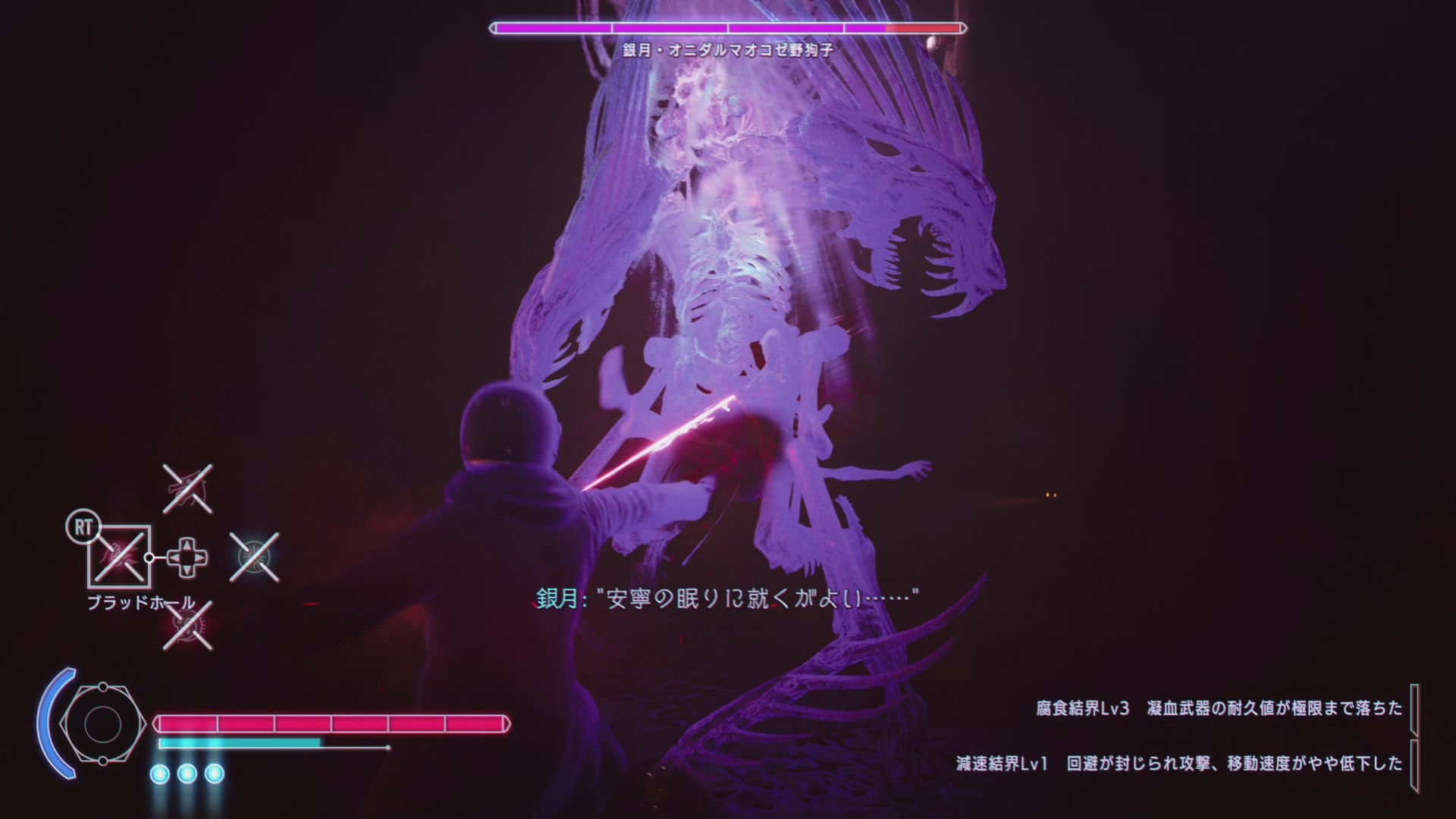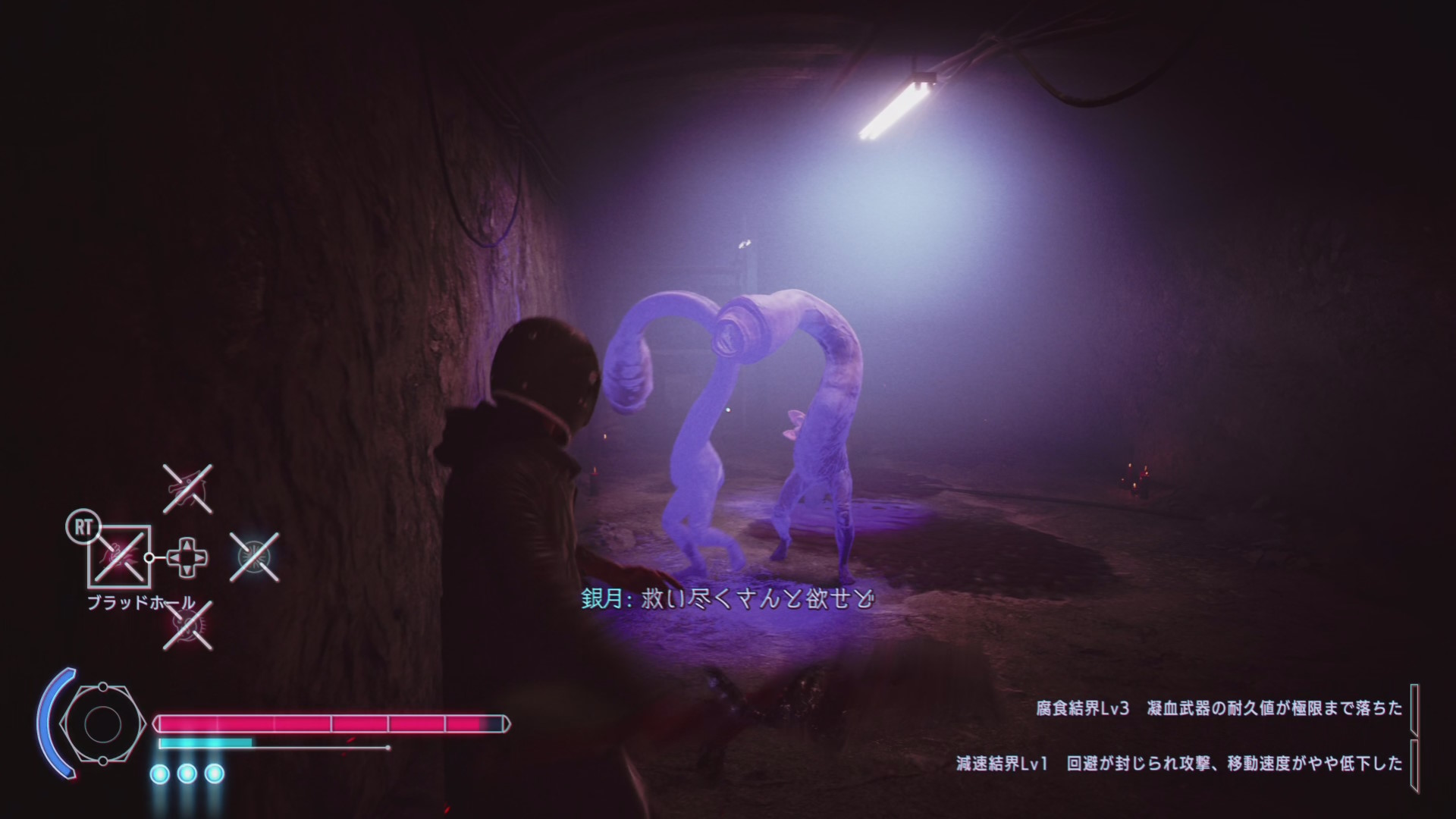 • 地下の通路をジグザグに進んでいくと突然 UI が表示されると同時に背後から銀月が襲ってくる