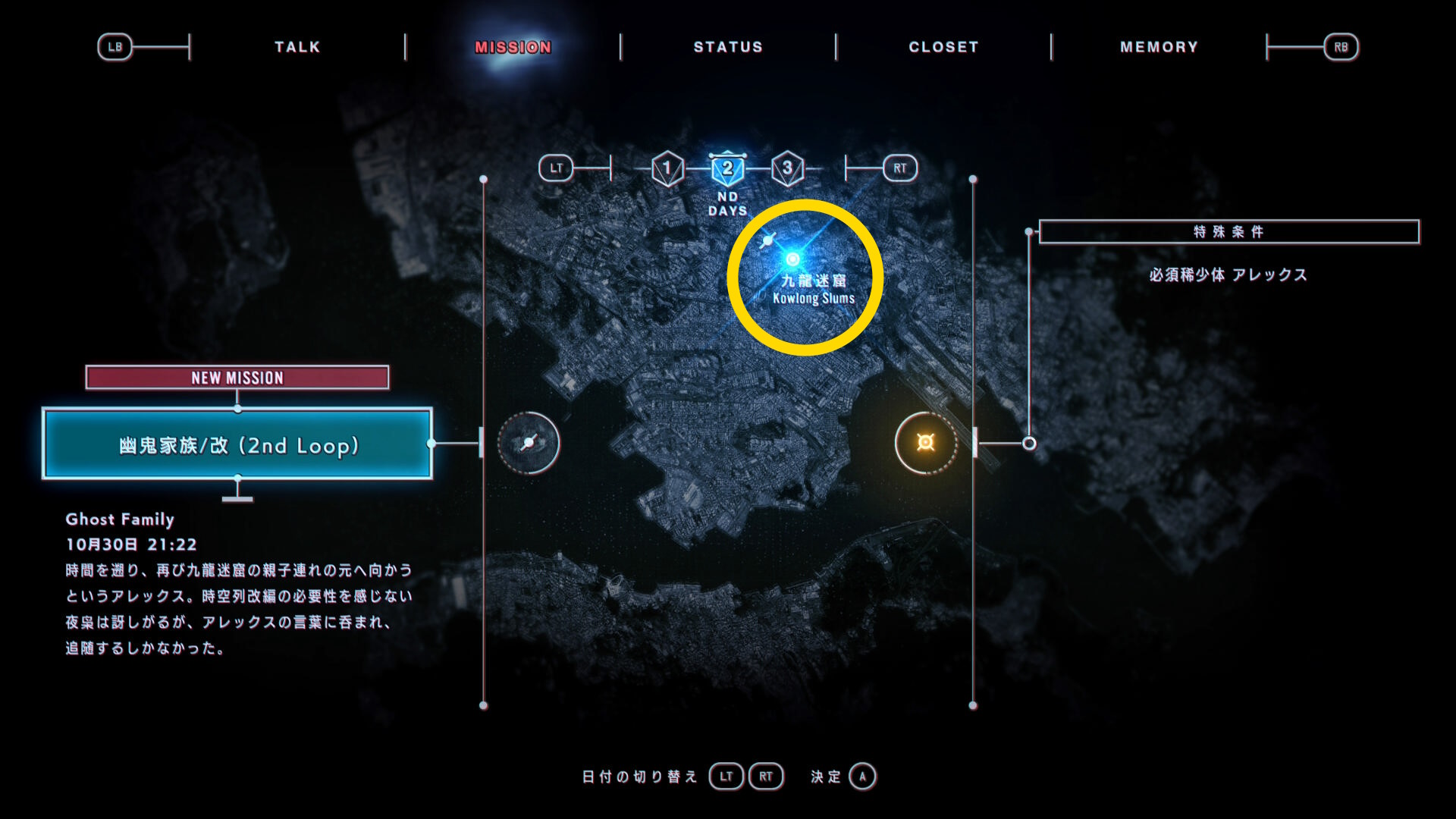 • 次のミッションは2日目の「幽鬼家族/改(2nd Loop)」をプレイする