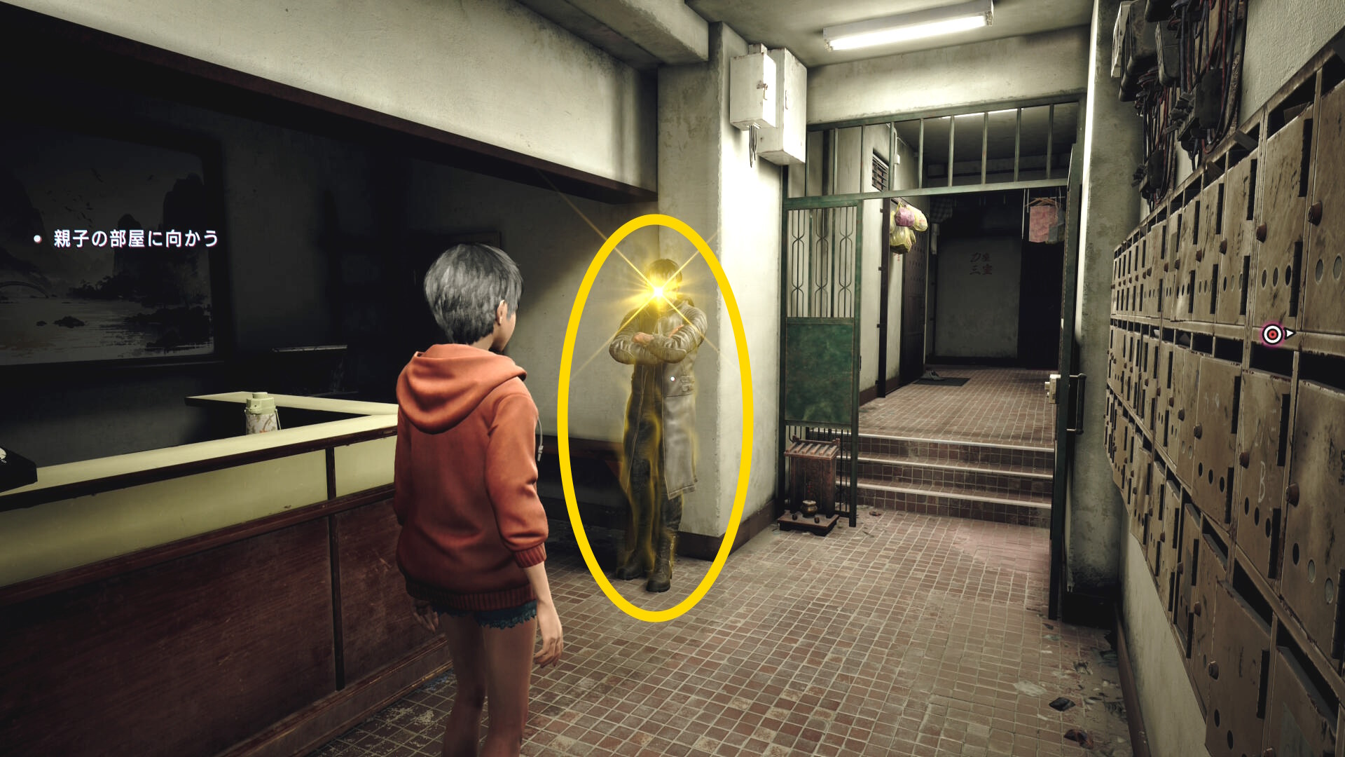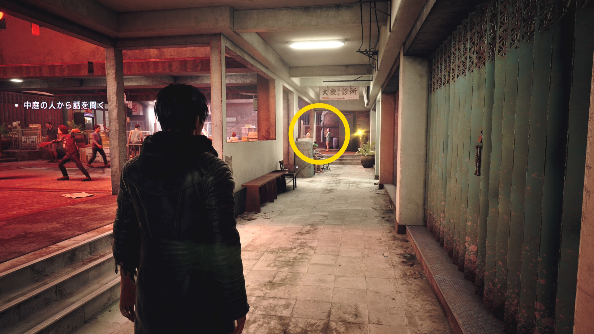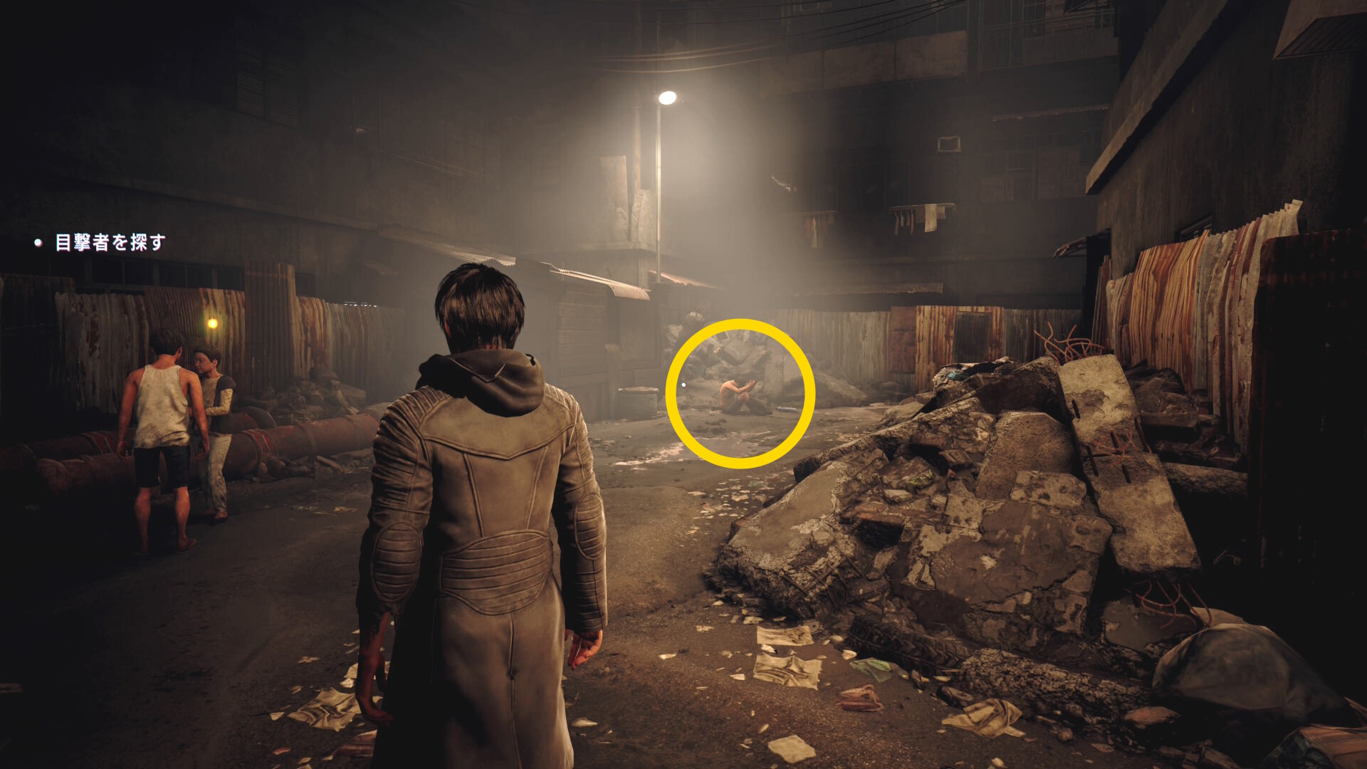 - 右奥に体育座りした男性がおり、これが目撃者なので話しかける