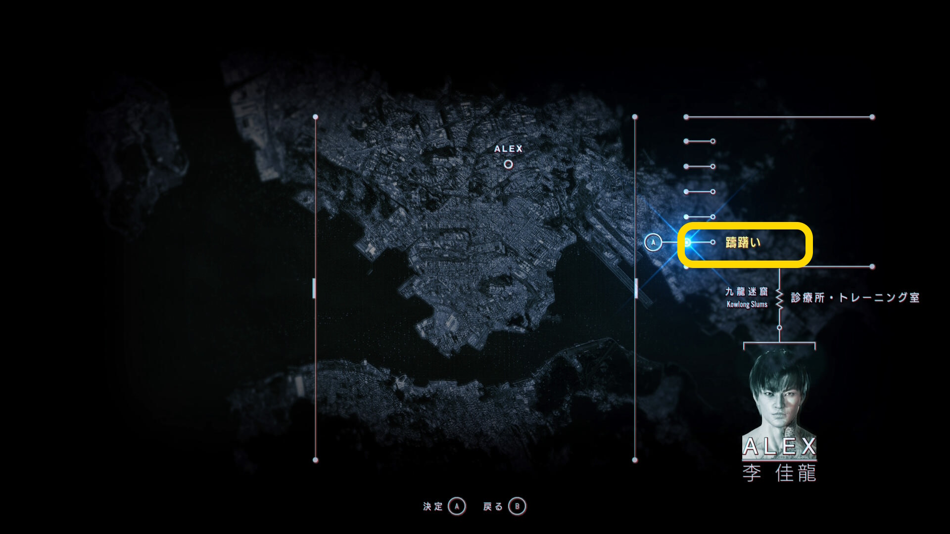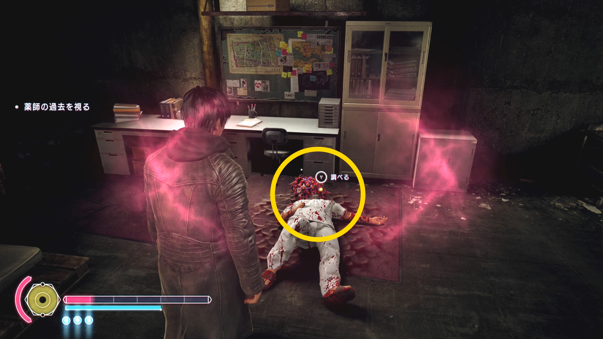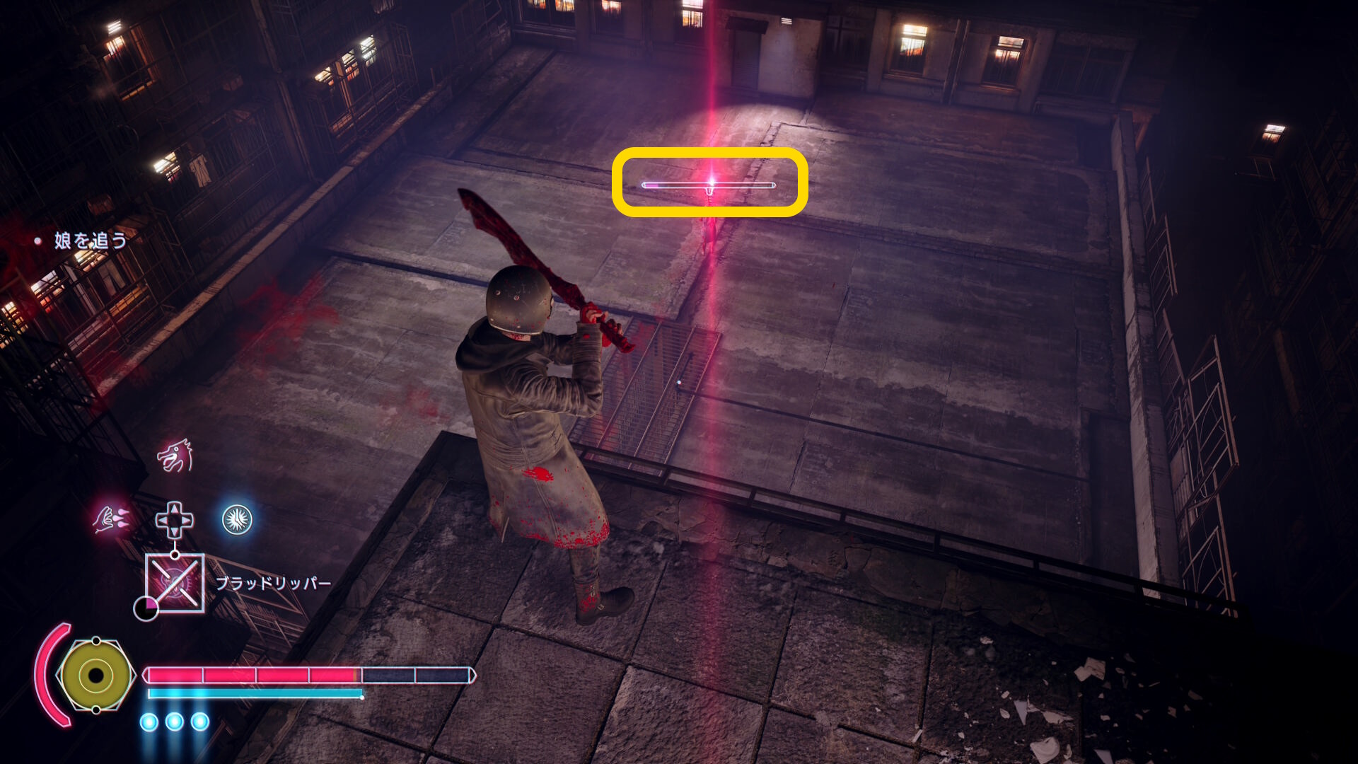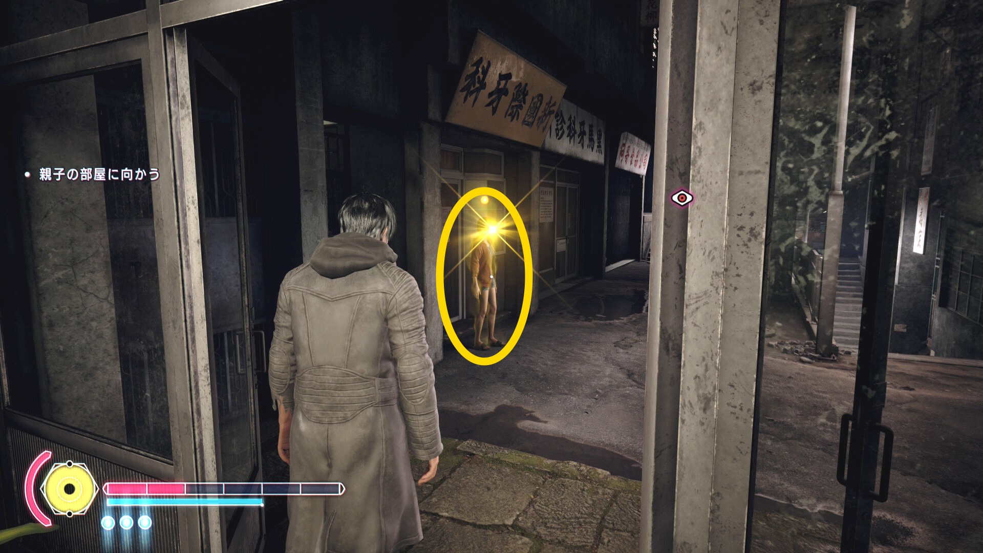 - 当サイトでは、アレックスのパッシブスキル「ポゼッションラッシュ」をアップグレードしているので憑依したあとに野狗子が正面に入るようカメラ位置を調整すると Y ボタンの表示がでる。Y ボタンを押すとポゼッションラッシュが発動し、一瞬で野狗子に近づきつつ、わりと良いダメージを与えることができるので便利