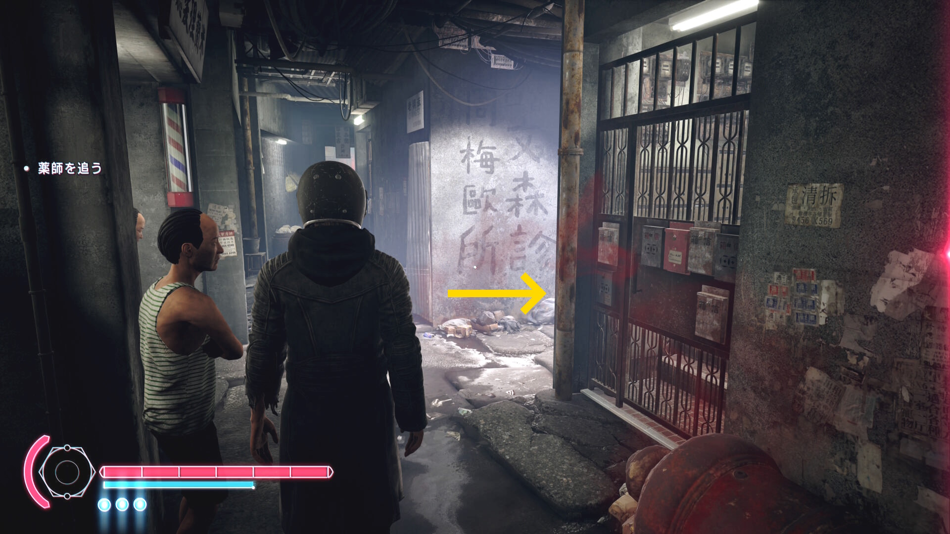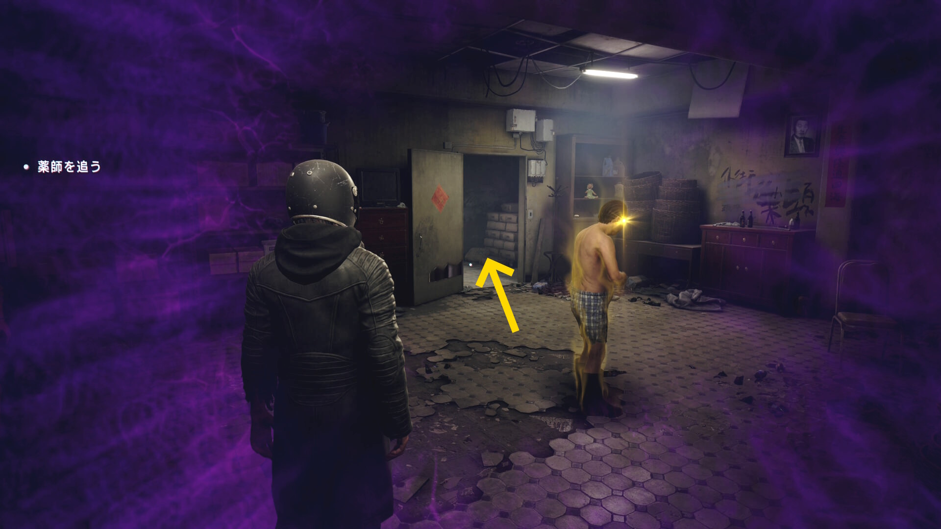 - 中庭に下りていき、右奥のトンネルに薬師が逃げていくので追いかける