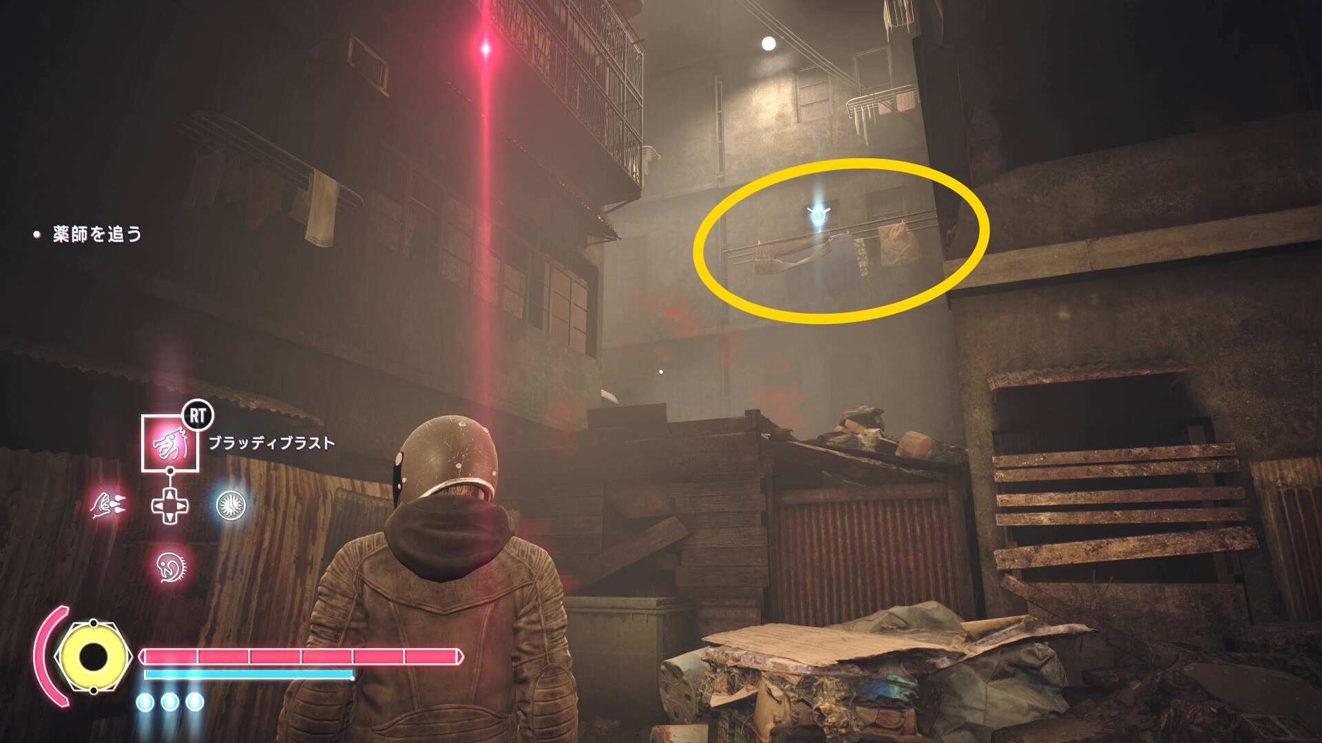 - その先も同じようにゴミ箱 ⇒ 家の屋根と登るが、登りきったら右上の物干し竿にブラッドジャンプ