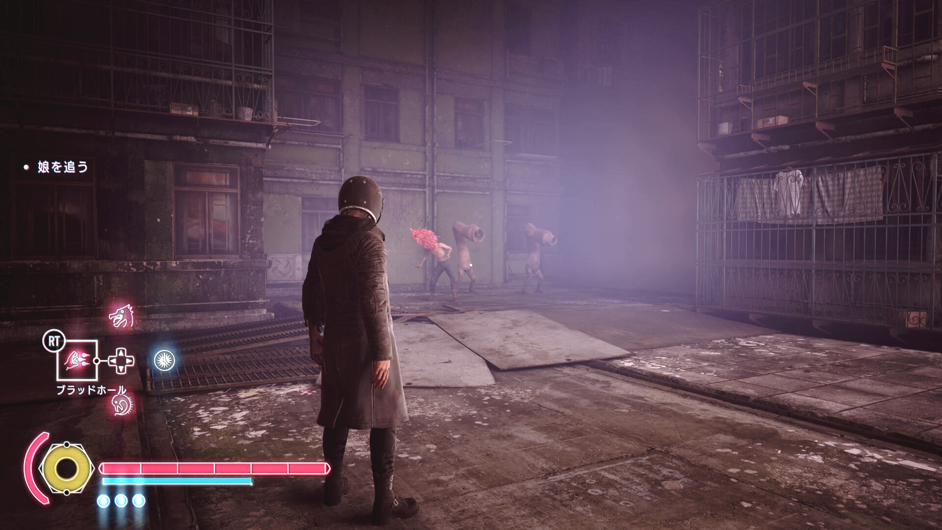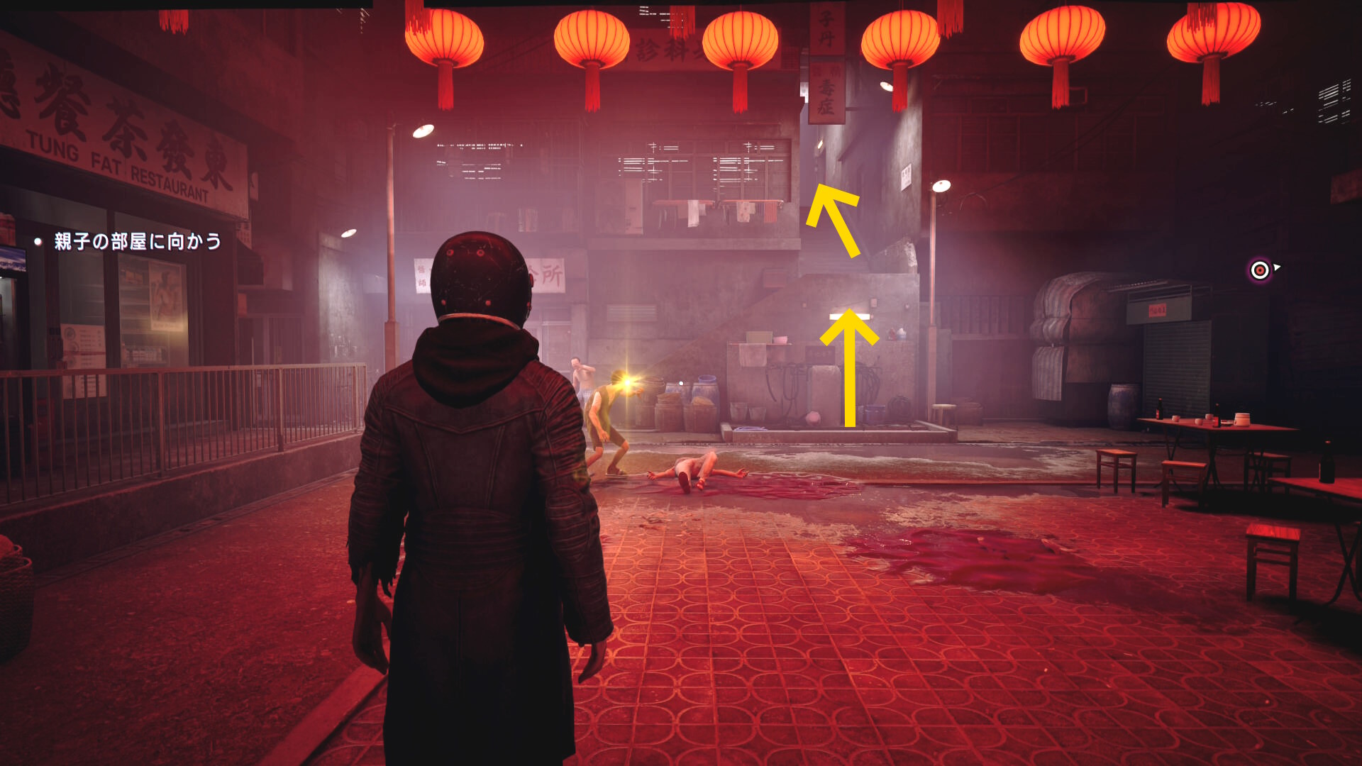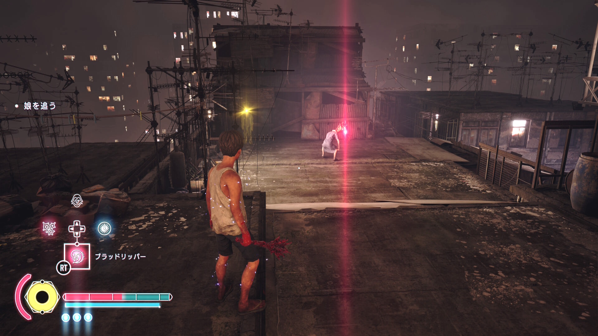 - 逃げていくので物干し竿にブラッドジャンプして中庭に戻る