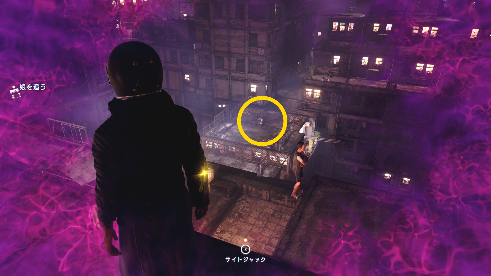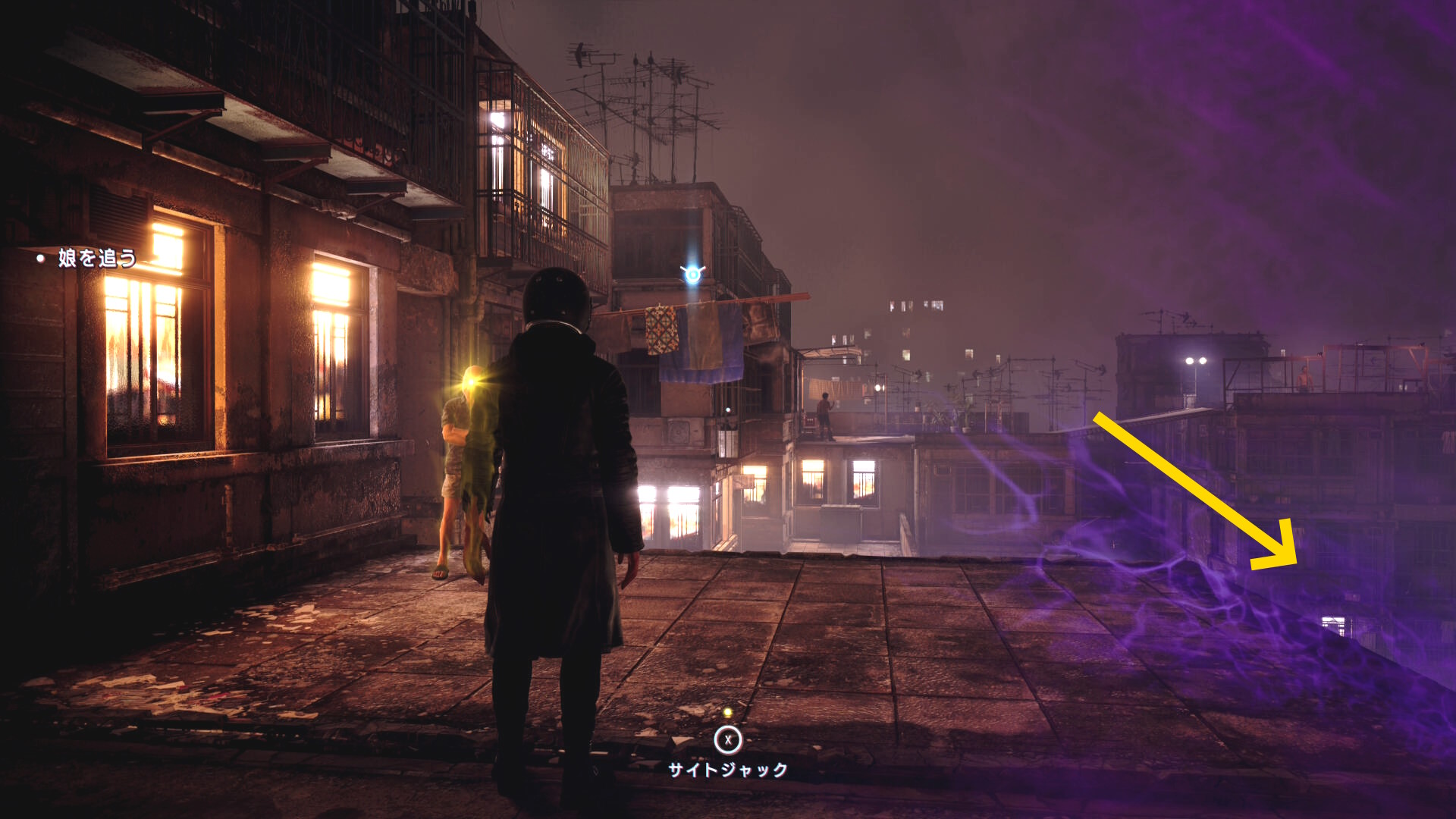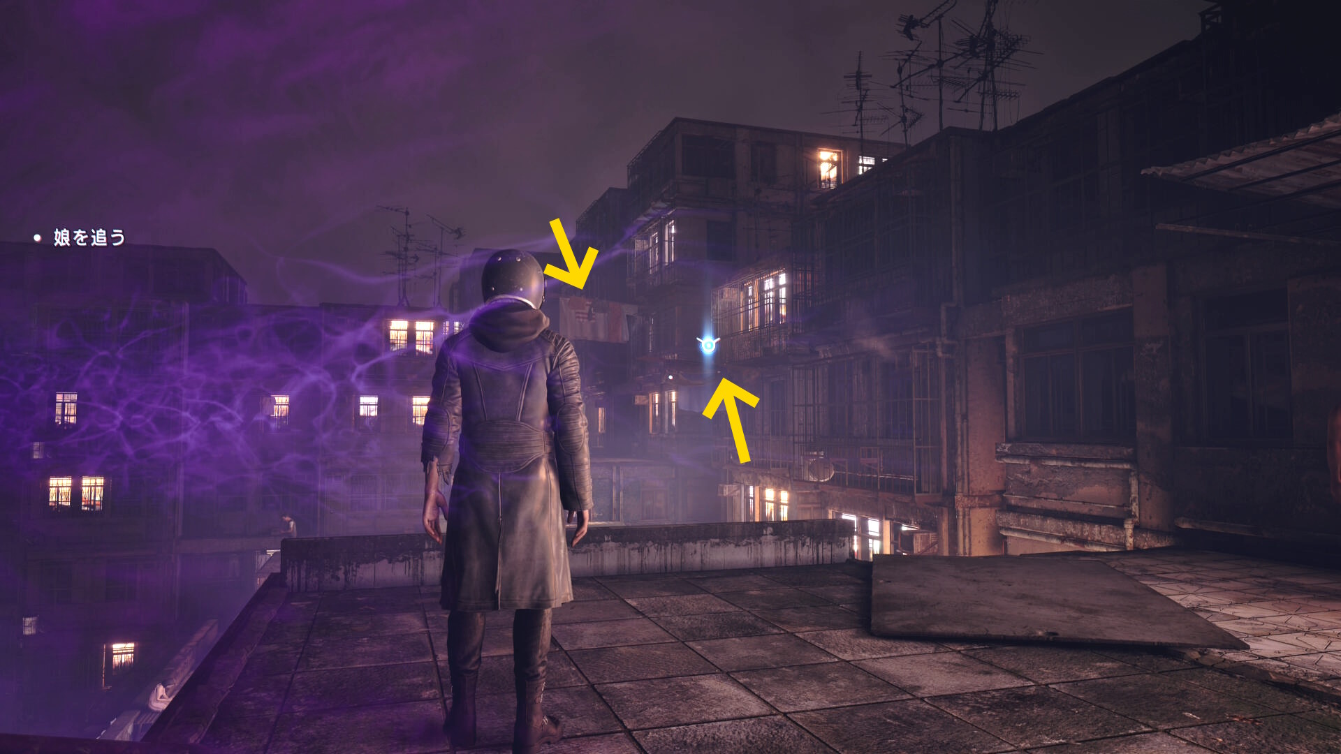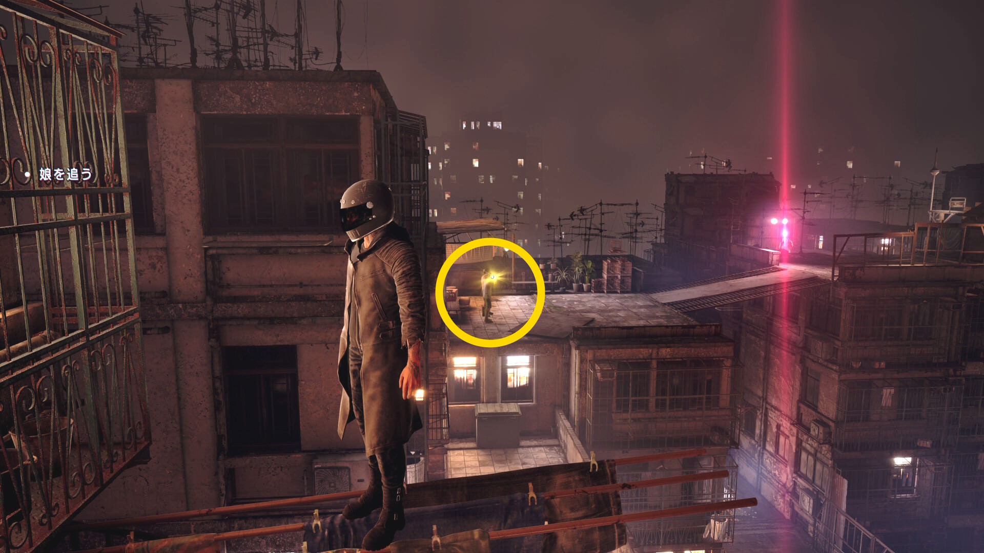 - 下におりて娘が逃げていった通路を進み、その先でゴミ箱 ⇒ 家の屋根と登る