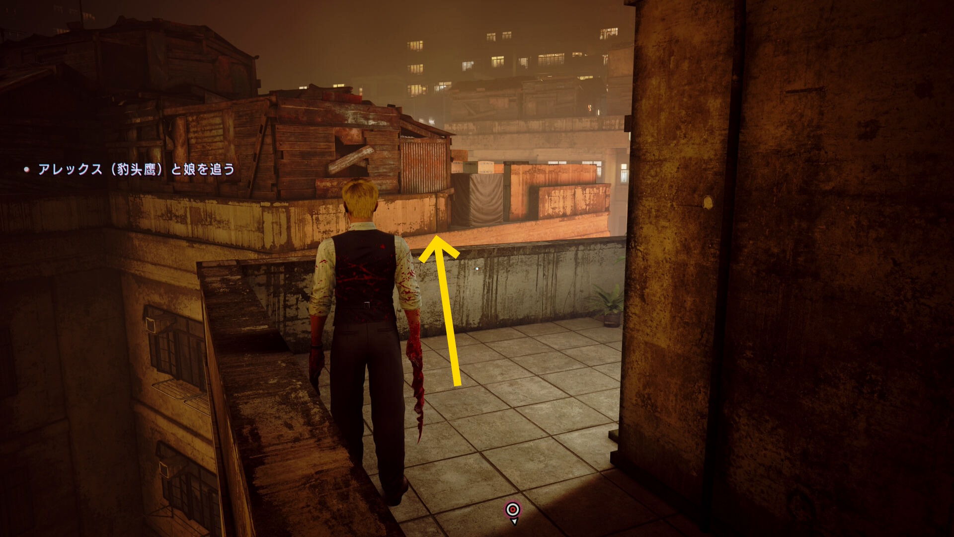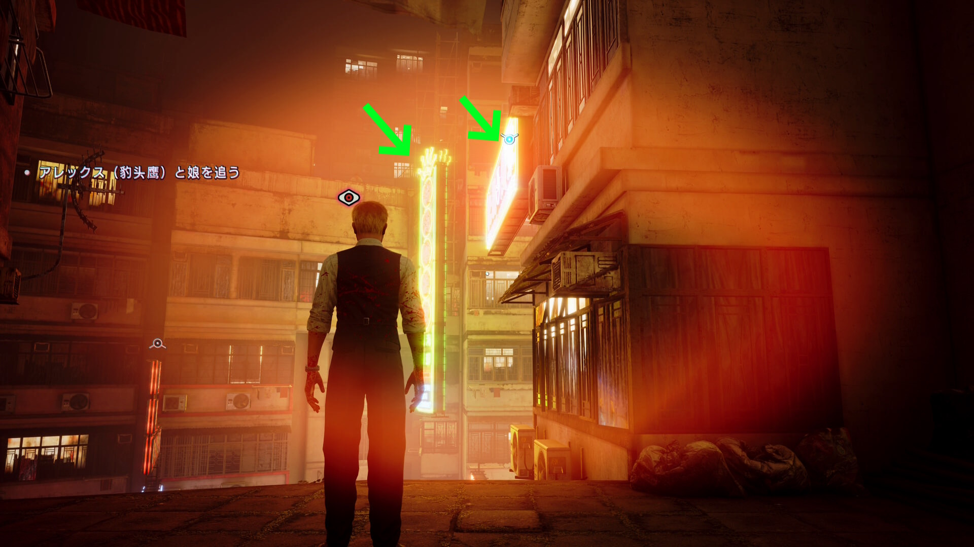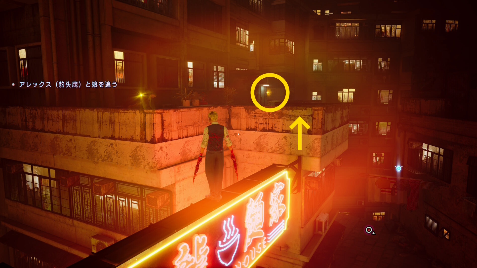 - カットシーン後、前方にある2枚の看板にブラッドジャンプして反対側のビル屋上へ