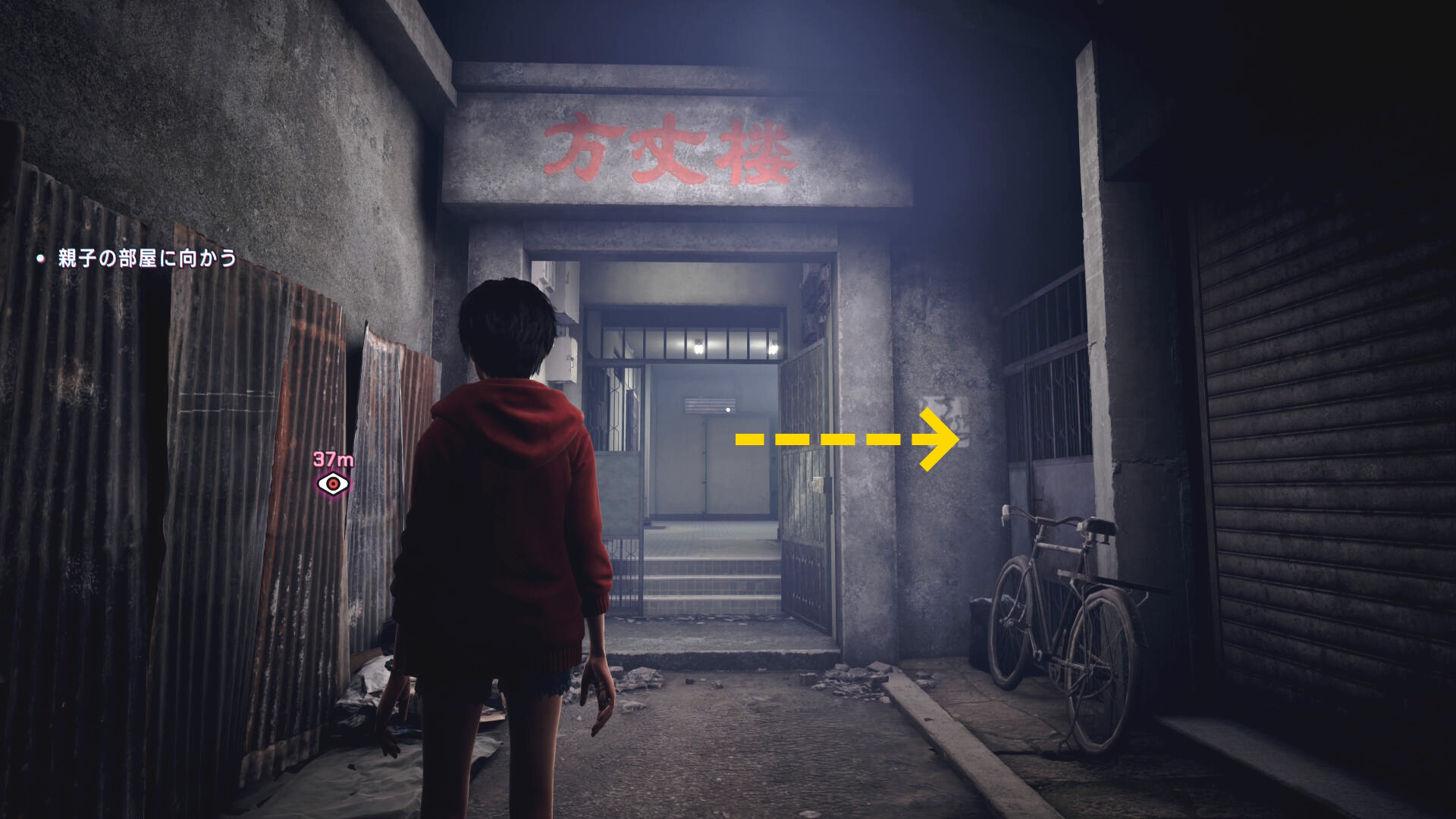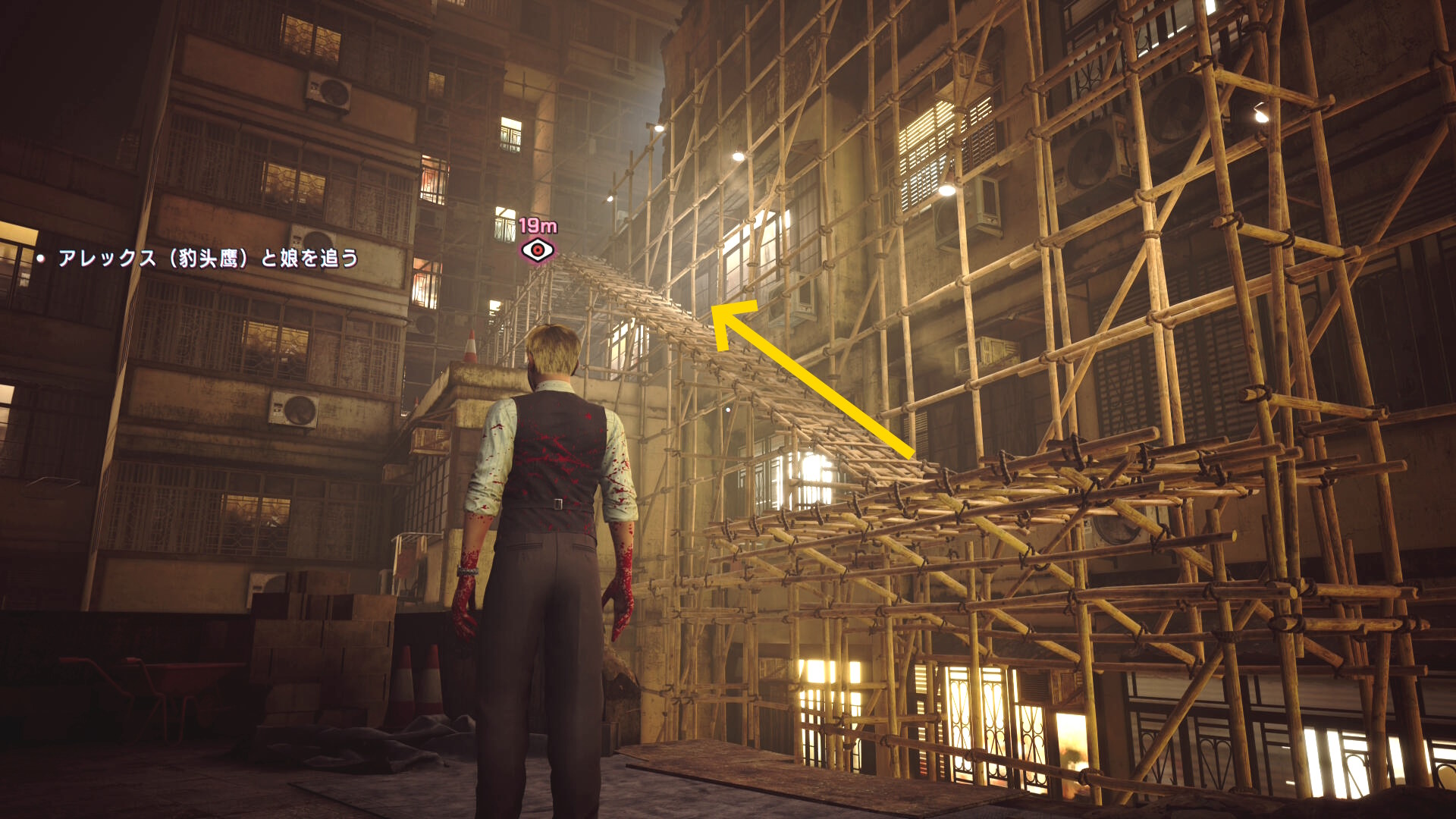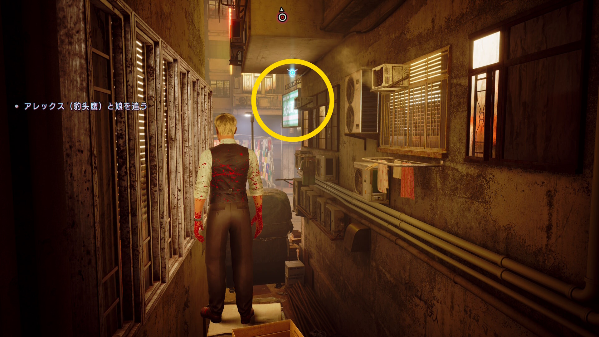 - カットシーン後、前方にある2枚の看板にブラッドジャンプして反対側のビル屋上へ
